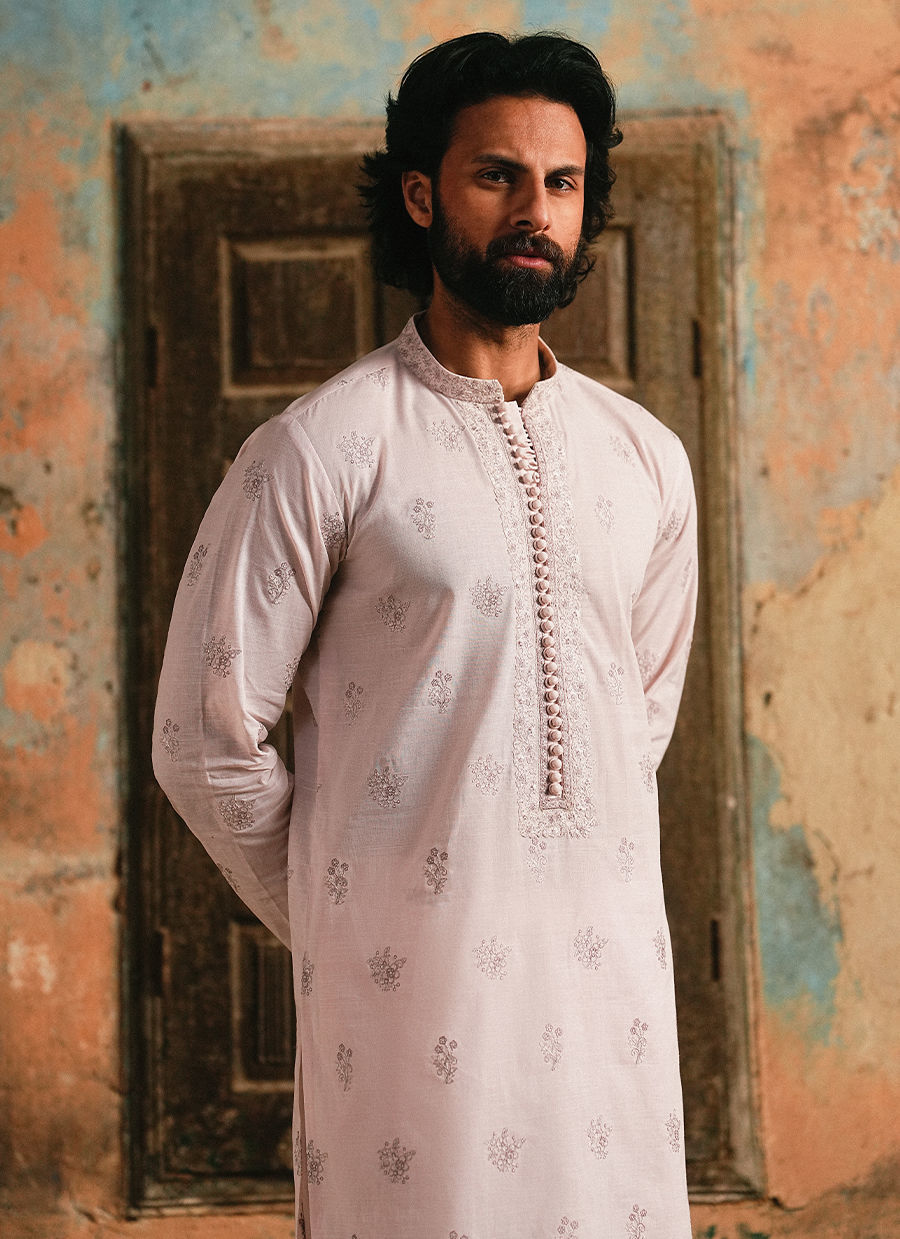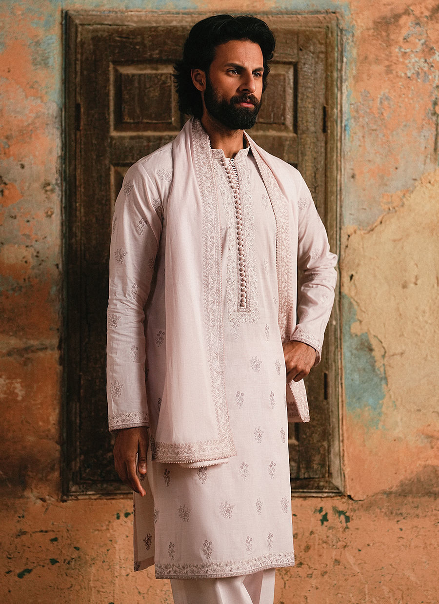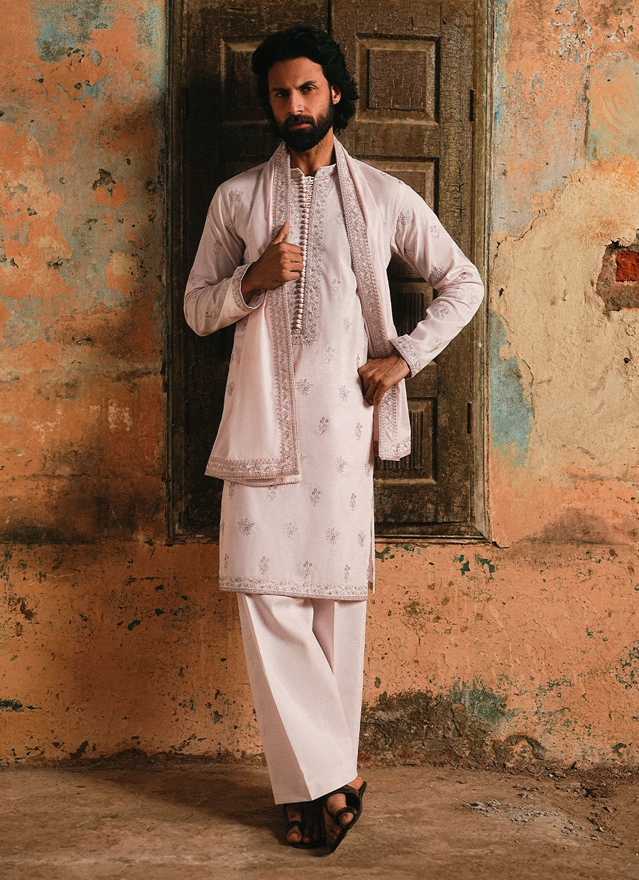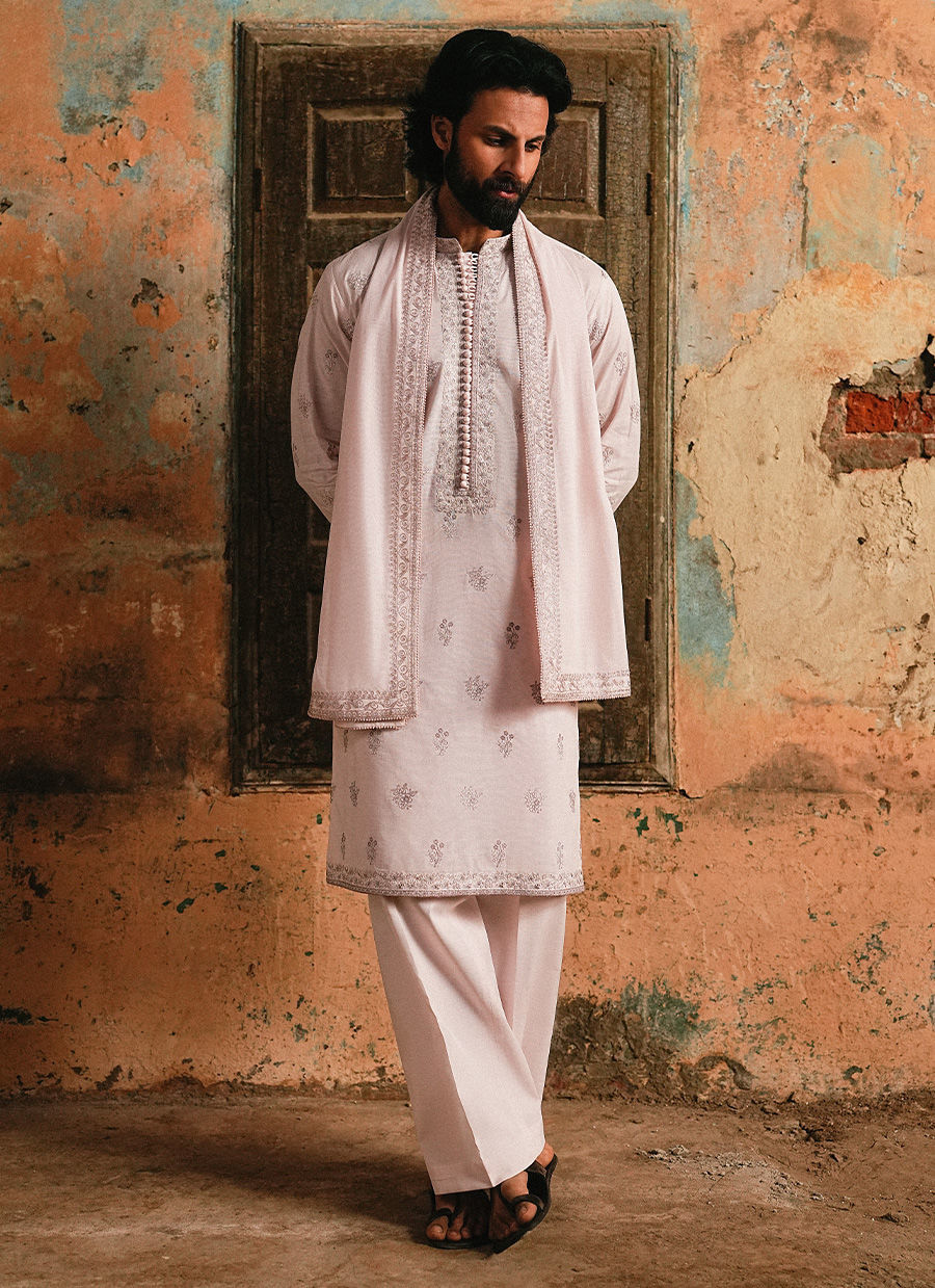 Crafted from warm and durable khadder cotton, this outfit is perfect for a cozy yet stylish look. The kurta features an all-over floral booti pattern, creating a timeless and graceful appeal, while a finely detailed border adds a touch of elegance to the design. Complementing the ensemble is a patka adorned with intricate Aari work, bringing in a hint of traditional craftsmanship. This outfit beautifully balances comfort and sophistication, making it an ideal choice for everyday wear as well as festive occasions.
