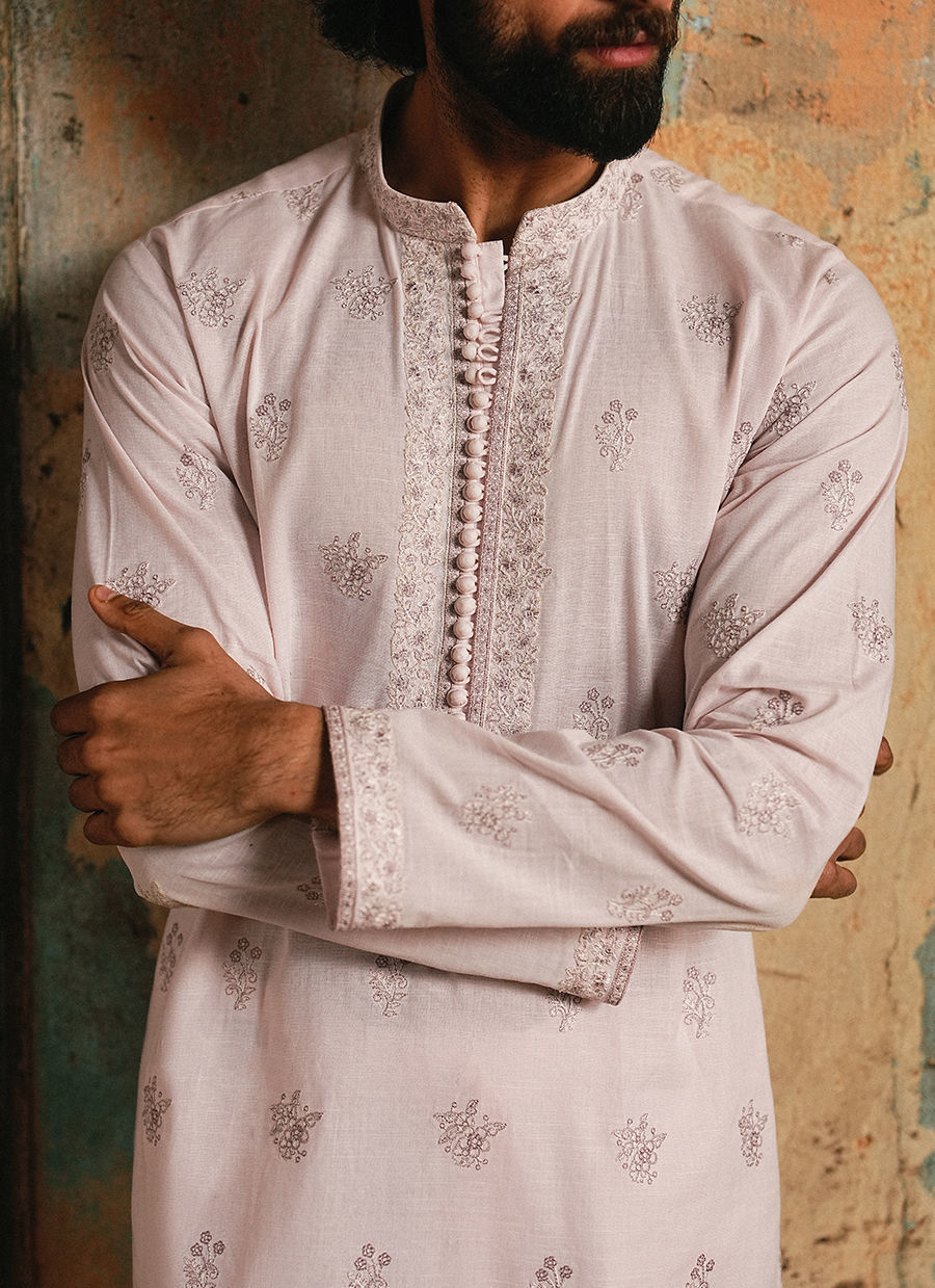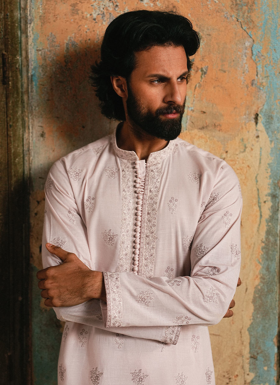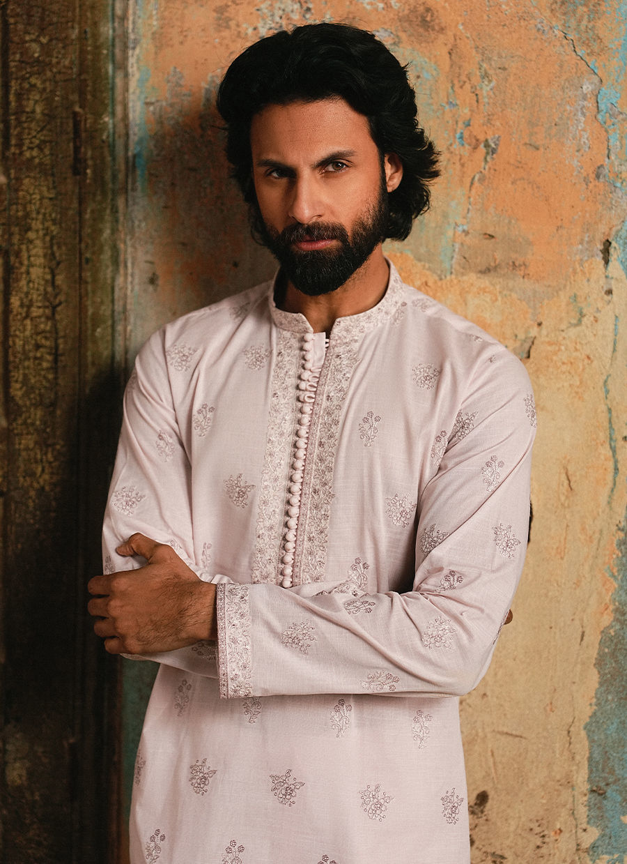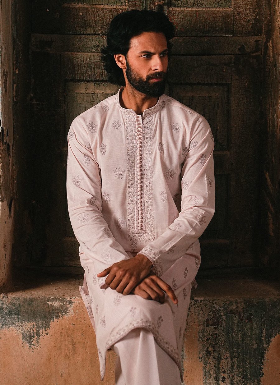 Crafted from warm and durable khadder cotton, this outfit is perfect for a cozy yet stylish look. The kurta features an all-over floral booti pattern, creating a timeless and graceful appeal, while a finely detailed border adds a touch of elegance to the design. Complementing the ensemble is a patka adorned with intricate Aari work, bringing in a hint of traditional craftsmanship. This outfit beautifully balances comfort and sophistication, making it an ideal choice for everyday wear as well as festive occasions.