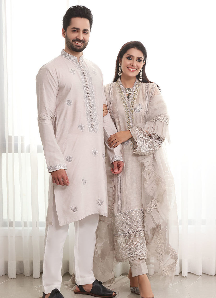 Long silhouette A line shirt in grey featuring handcrafted zardozi detailed neckline in gold and silvers, the neckline is further adorned with lace and resham rosettes, the hem of the shirt is adorned with geometric applique details on pure organza canvas with raw silk. The hemline is also adorned with light catching embossed organza and finished with lace details. The sleeves are made to perfection with 3D pleats details incorporated with lace details. The shirt can be paired with plain raw silk pants. The outfit is paired with organza pleated dupatta featuring crochet lace and fringe details.