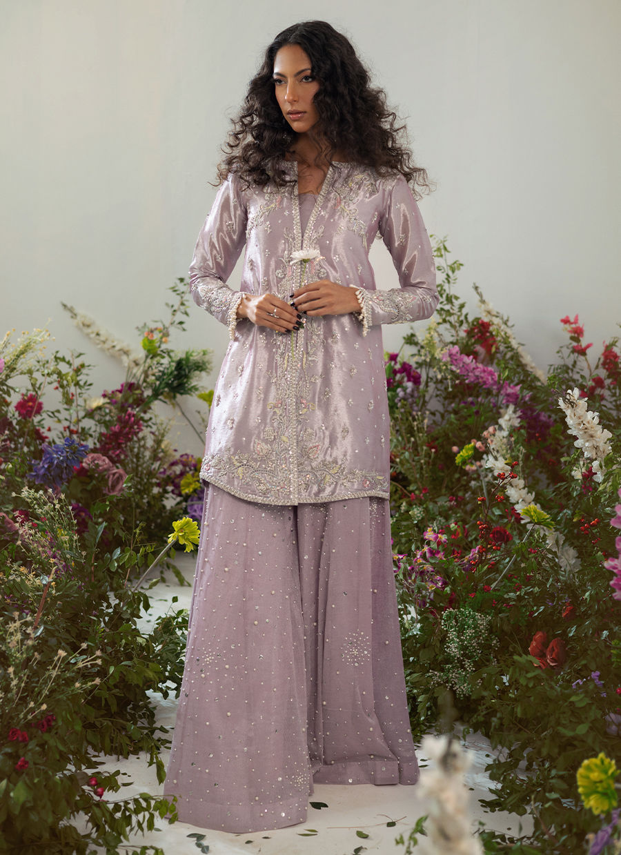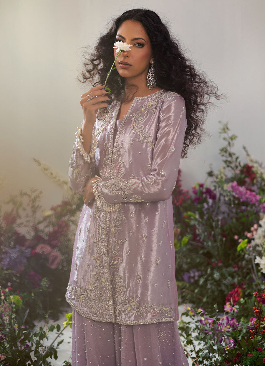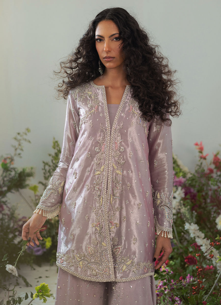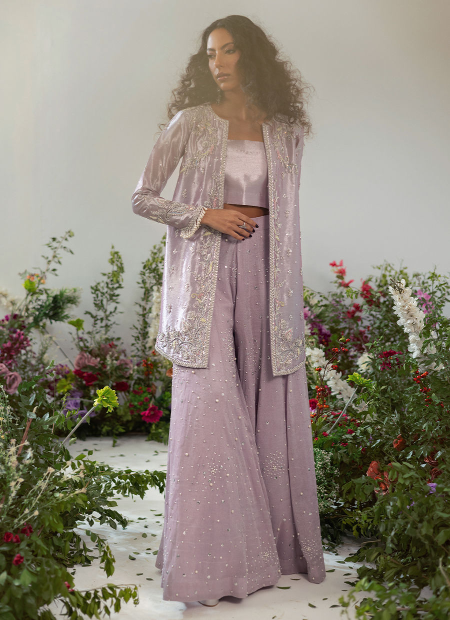 A knee-length jacket in shimmering lamé fabric in stunning lilac adorned with intricate zardozi and resham rosettes. The snug sleeves highlight cutwork designs and dainty tassels on the hem. Pair this jacket with a bustier and flared pants embellished with scattered pearls and sequins for a show-stopping look this festive season.