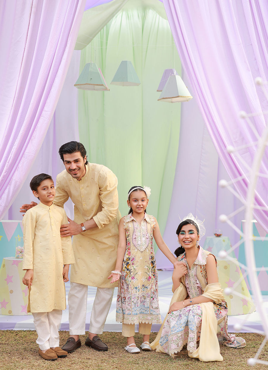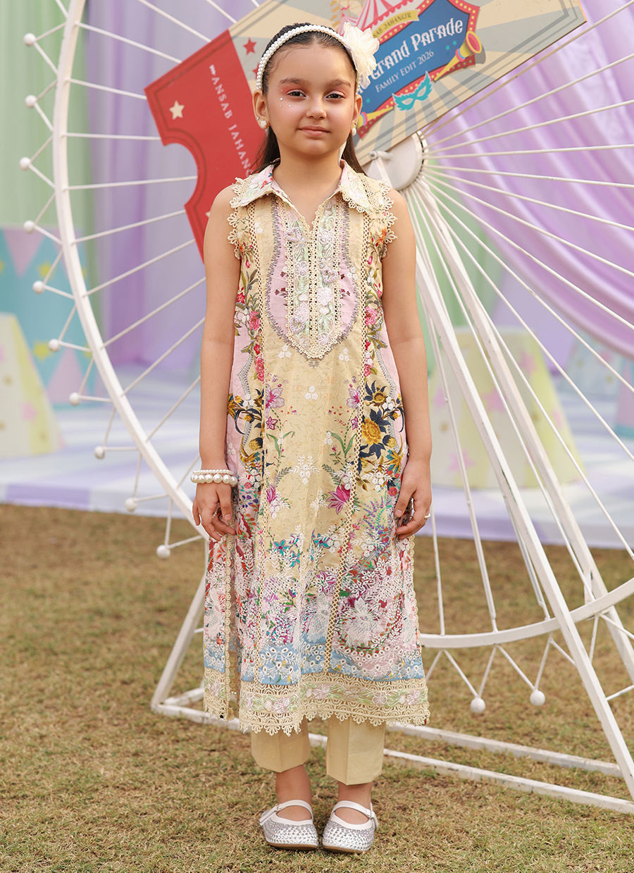 Long butter-yellow printed shirt featuring an embroidered collar with lace accents and heart-shaped buttons, complemented by delicate lace and pastel embroidery along the hem. Paired with a medium silk butter-yellow azhaar and a matching silk dupatta with lace edging, creating a soft and elegant ensemble.