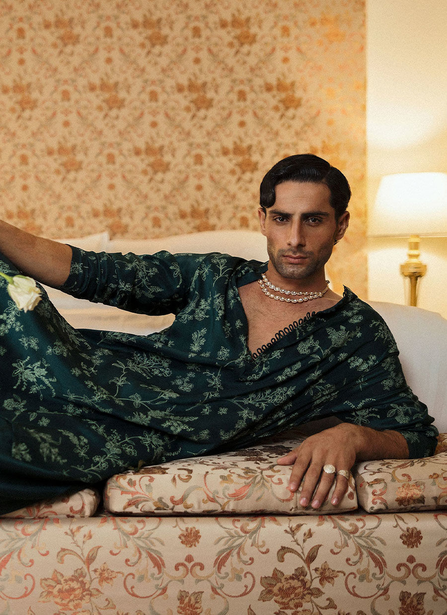 Elevate your style with this charming screen-printed green raw silk kurta, thoughtfully designed for the man. The vibrant green hue is both refreshing and versatile, making it an ideal choice for celebrations. Featuring elegant loop button detailing at the neckline, this kurta beautifully marries traditional craftsmanship with contemporary aesthetics. Made from luxurious raw silk, it offers a soft feel and an exceptional drape, ensuring both comfort and sophistication. Paired with a classic plain shalwar, this ensemble strikes the perfect balance between simplicity and elegance. Whether you're attending a family gathering or a festive occasion, this kurta-shalwar combination is sure to make a lasting impression. Embrace timeless style with a modern twist in this stunning outfit.