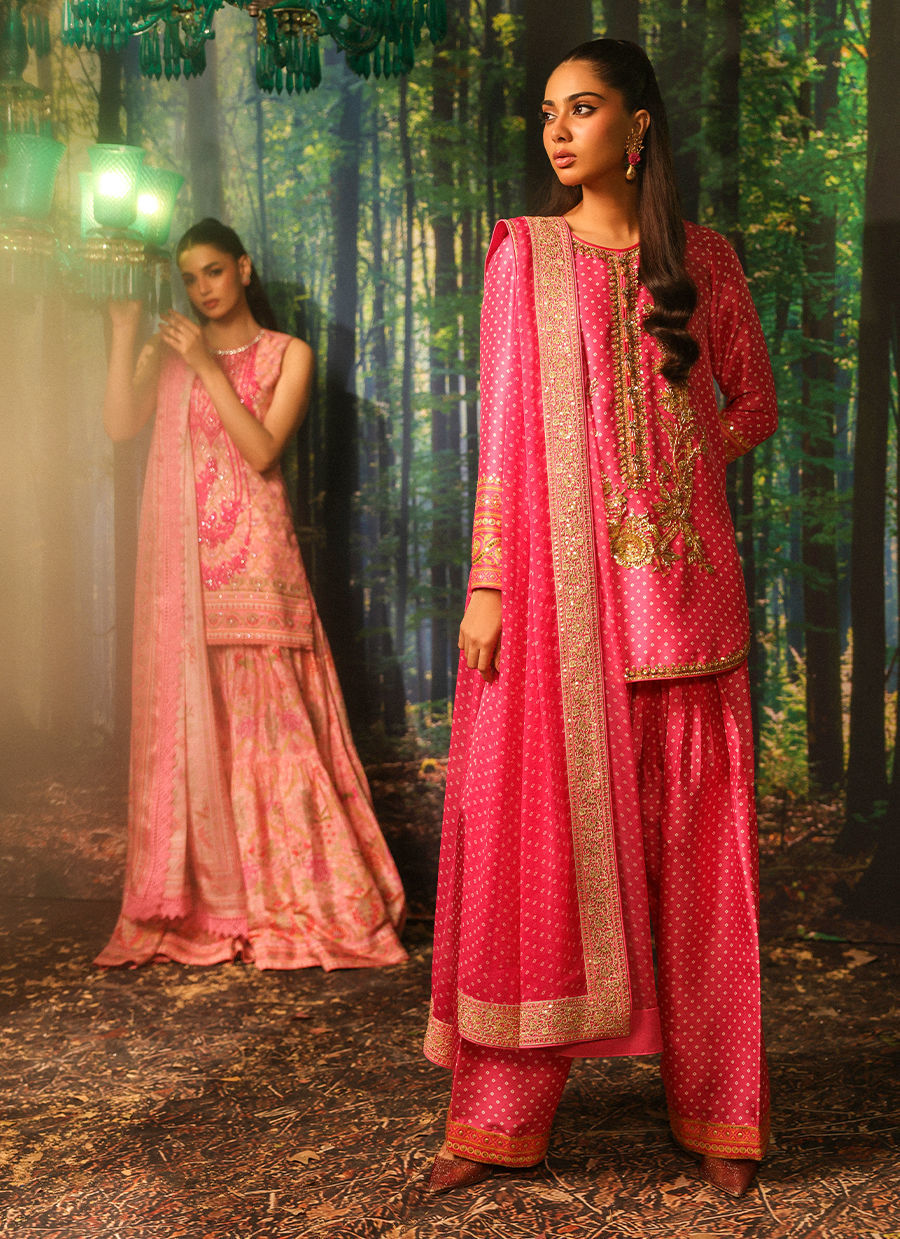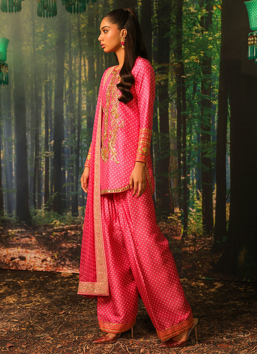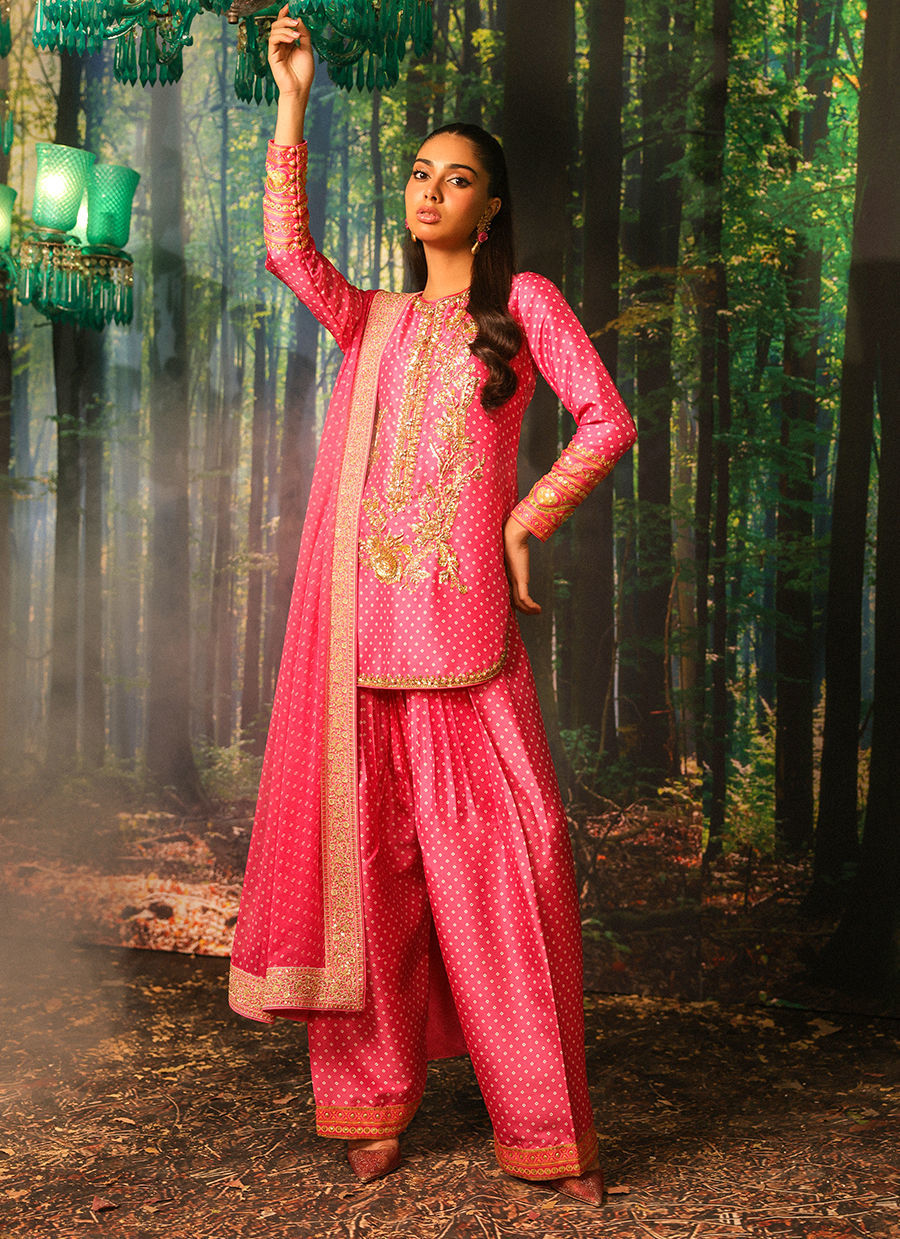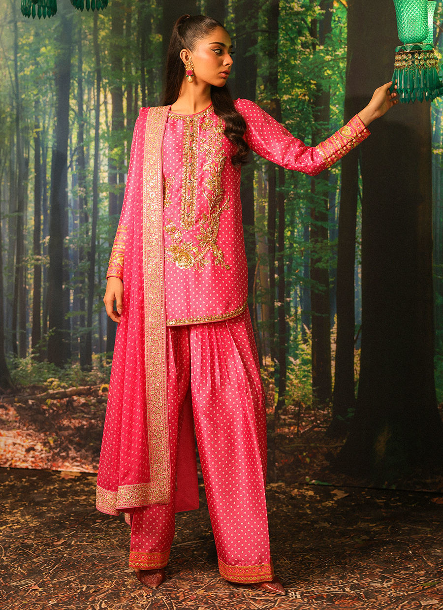 Color: Pink Fabric: Shirt and Shalwar: Pure Raw Silk, Dupatta: Crinkle Chiffon Work Details: Handwork