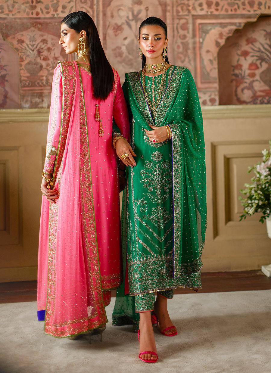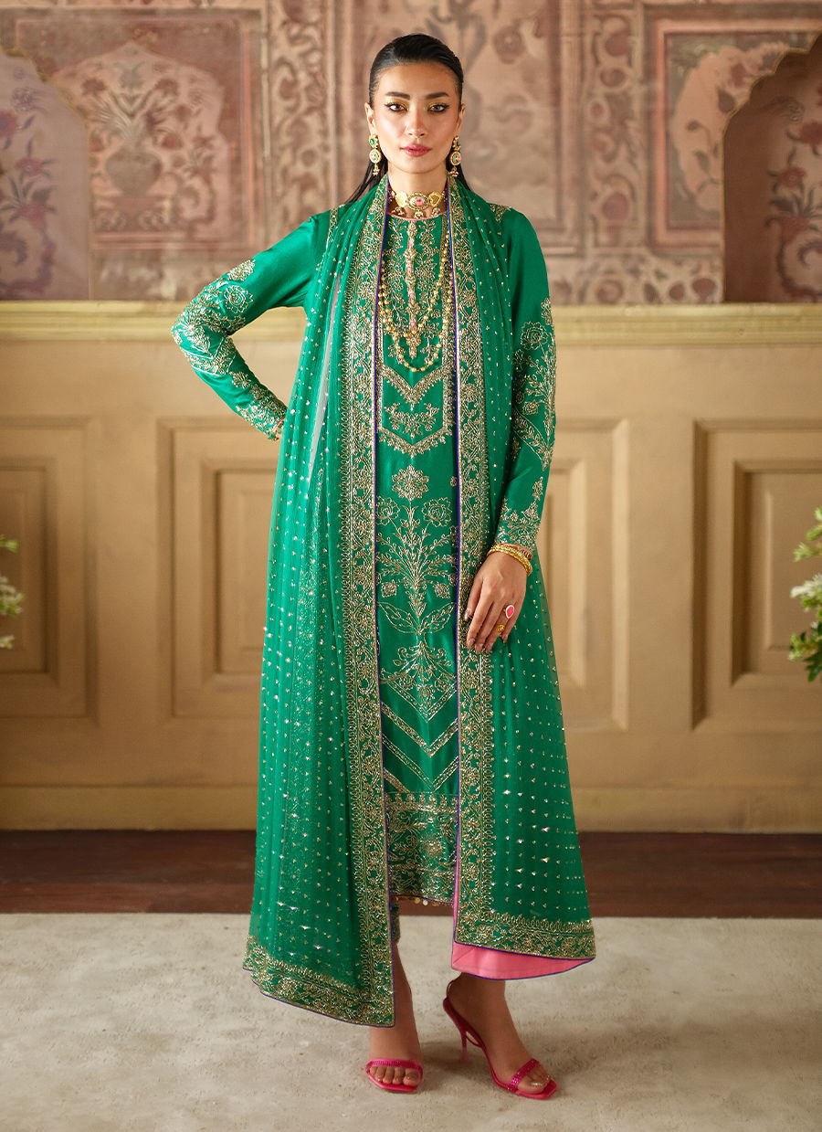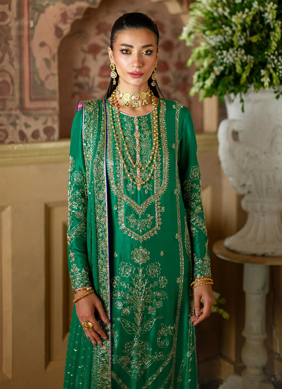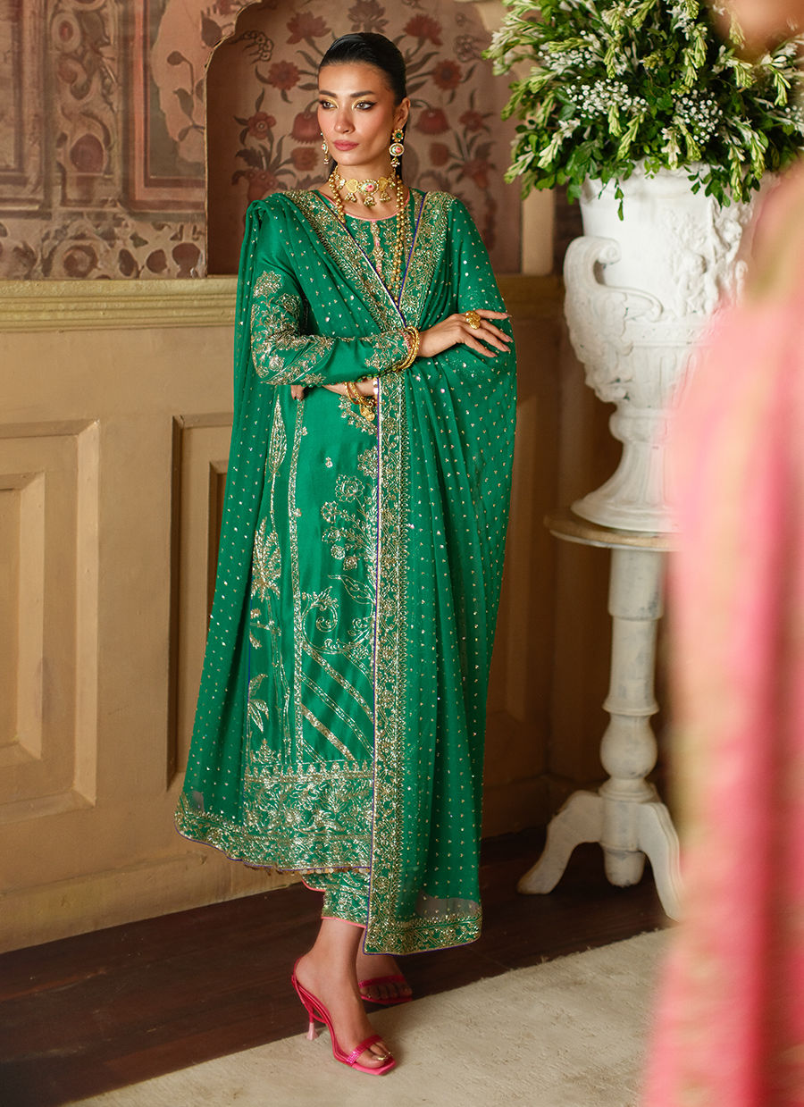 This emerald green silk ensemble is adorned with an intricate gold cutdaana jaal, paired with worked straight pants and a bordered dupatta.