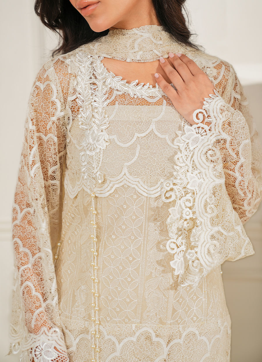 Chikankari cotton net shirt layered with lace net detailing, adorned with handmade pearl hangings along the sides and front. Finished with 3D floral bunches accenting the slits and daman for added dimension and elegance.