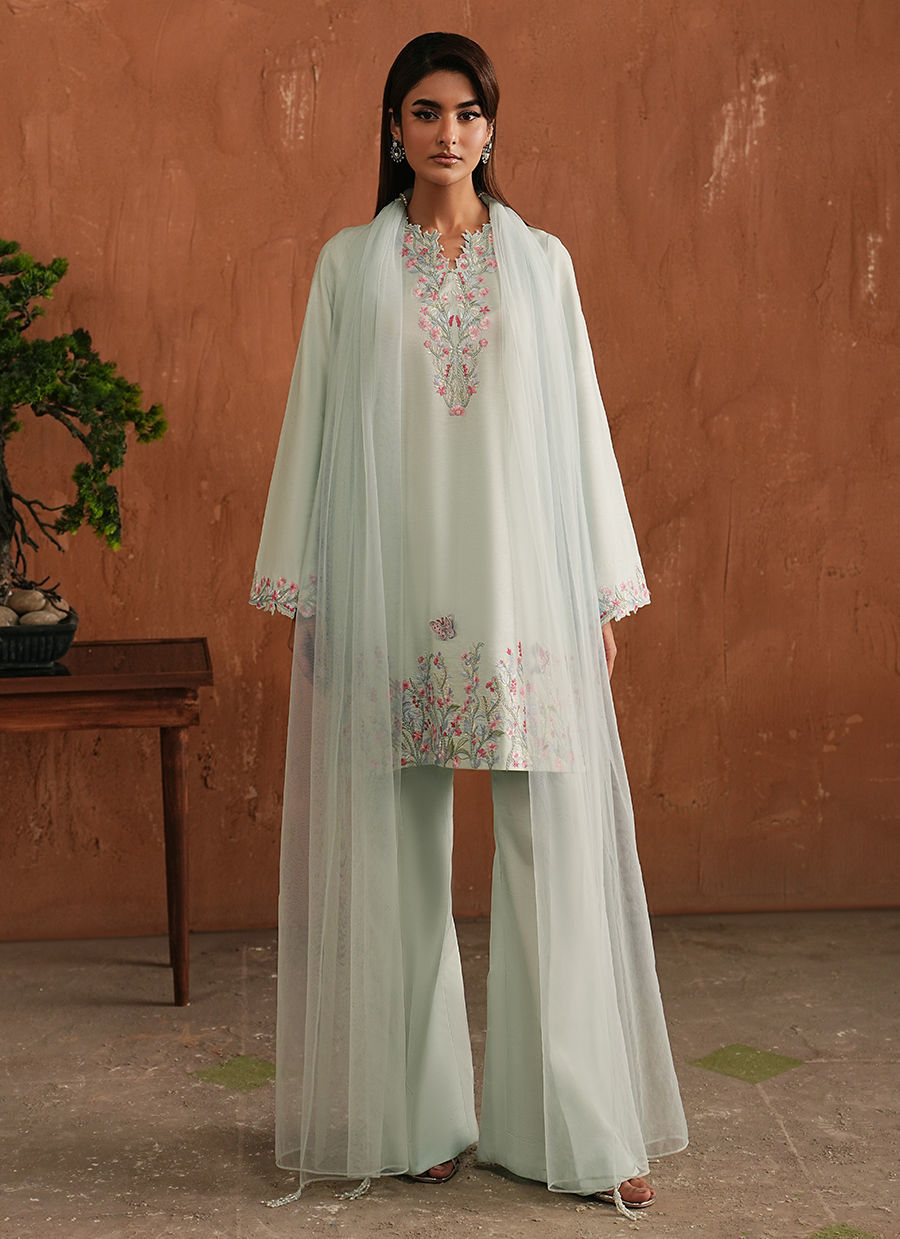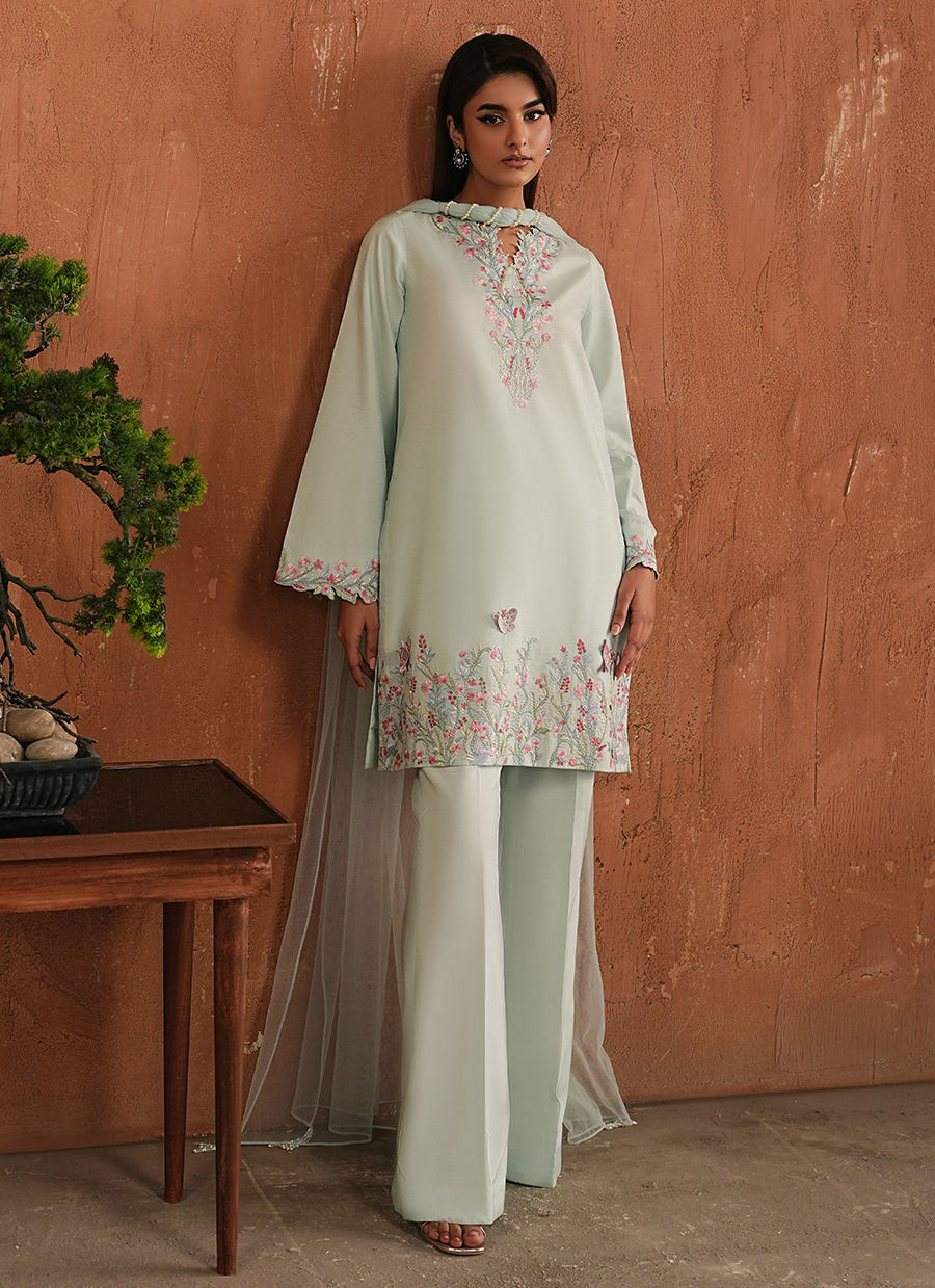 A short Korean Raw Silk shirt detailed with pakki embroidery, where small 3D butterfly accents add character without asking for attention. The flared trousers keep the silhouette relaxed, while the net dupatta with tassels brings a soft contrast.