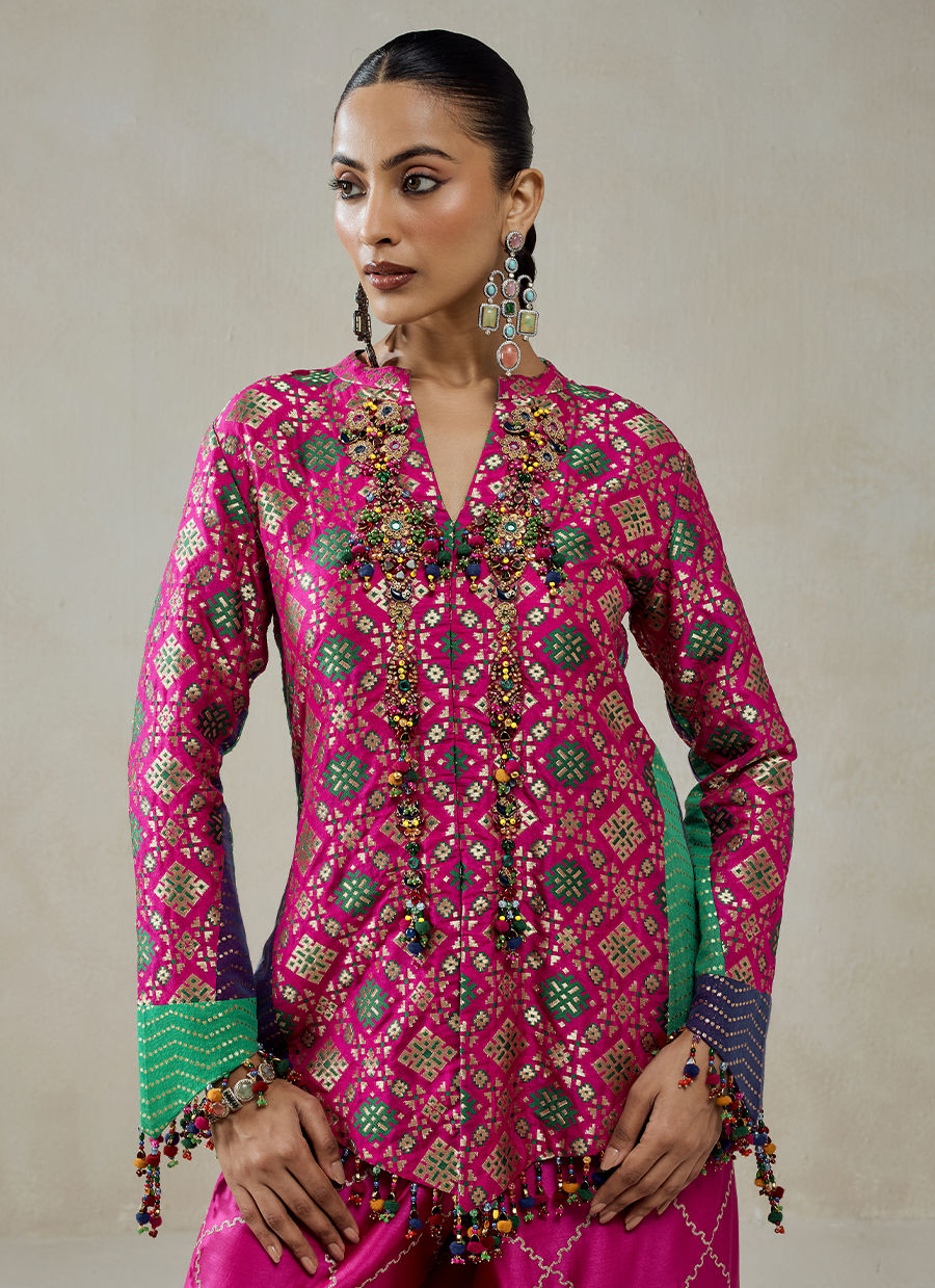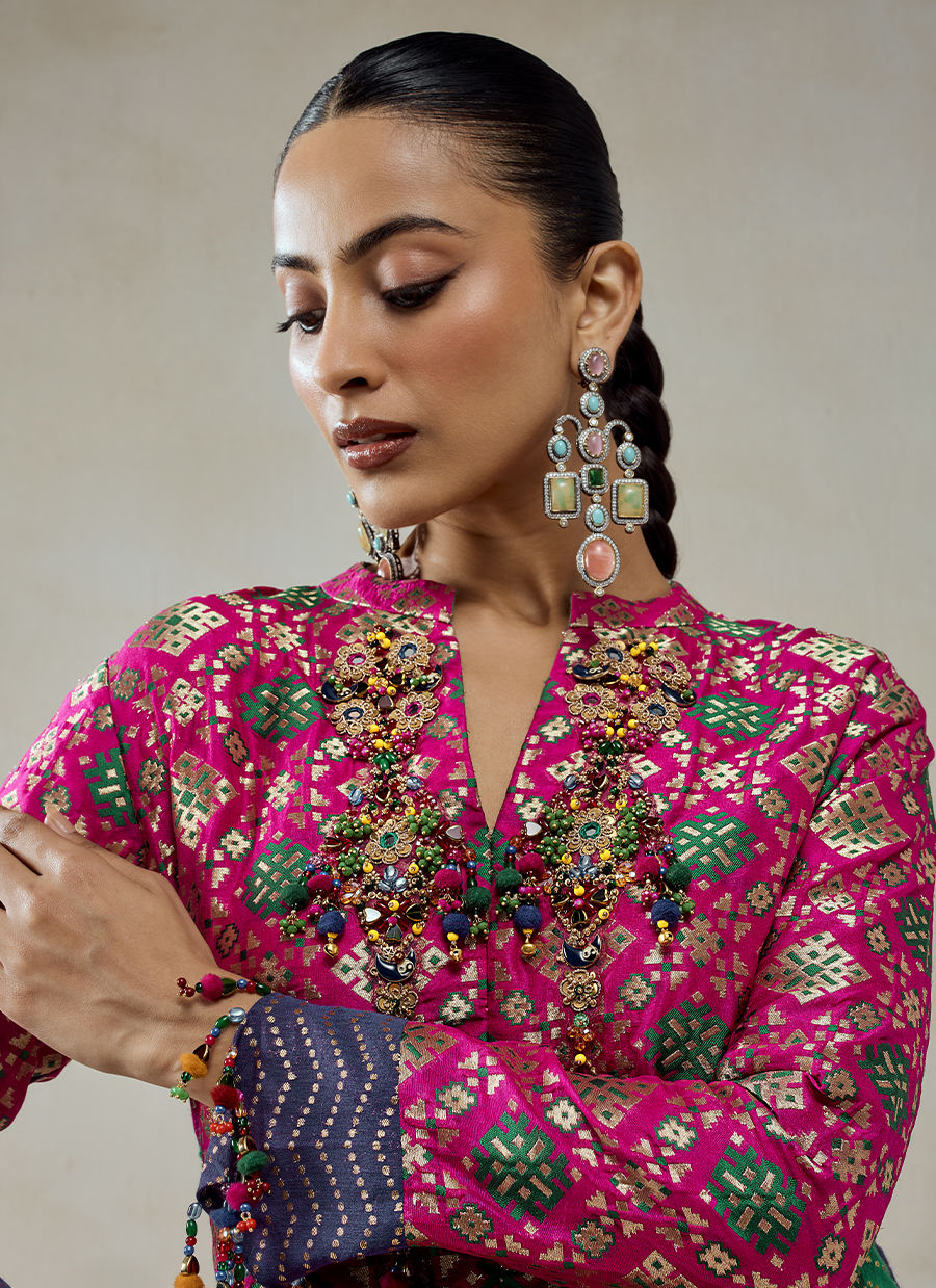 This look features a two-piece coordinated set crafted from a rich combination of Patola silk, Chanderi, satin, and shantoon, bringing together heritage weaving and fluid modern tailoring. The kurta showcases intricate Patola-inspired geometric patterns arranged in a grid-like layout. Delicate hand embellishments and bead tassel detailing along the hem and placket add movement and a handcrafted finish. The sleeves introduce a playful contrast with panelled detailing in green and indigo, beautifully breaking the uniformity. The trousers feature a gold diamond lattice pattern, adding subtle texture without overpowering the overall look.