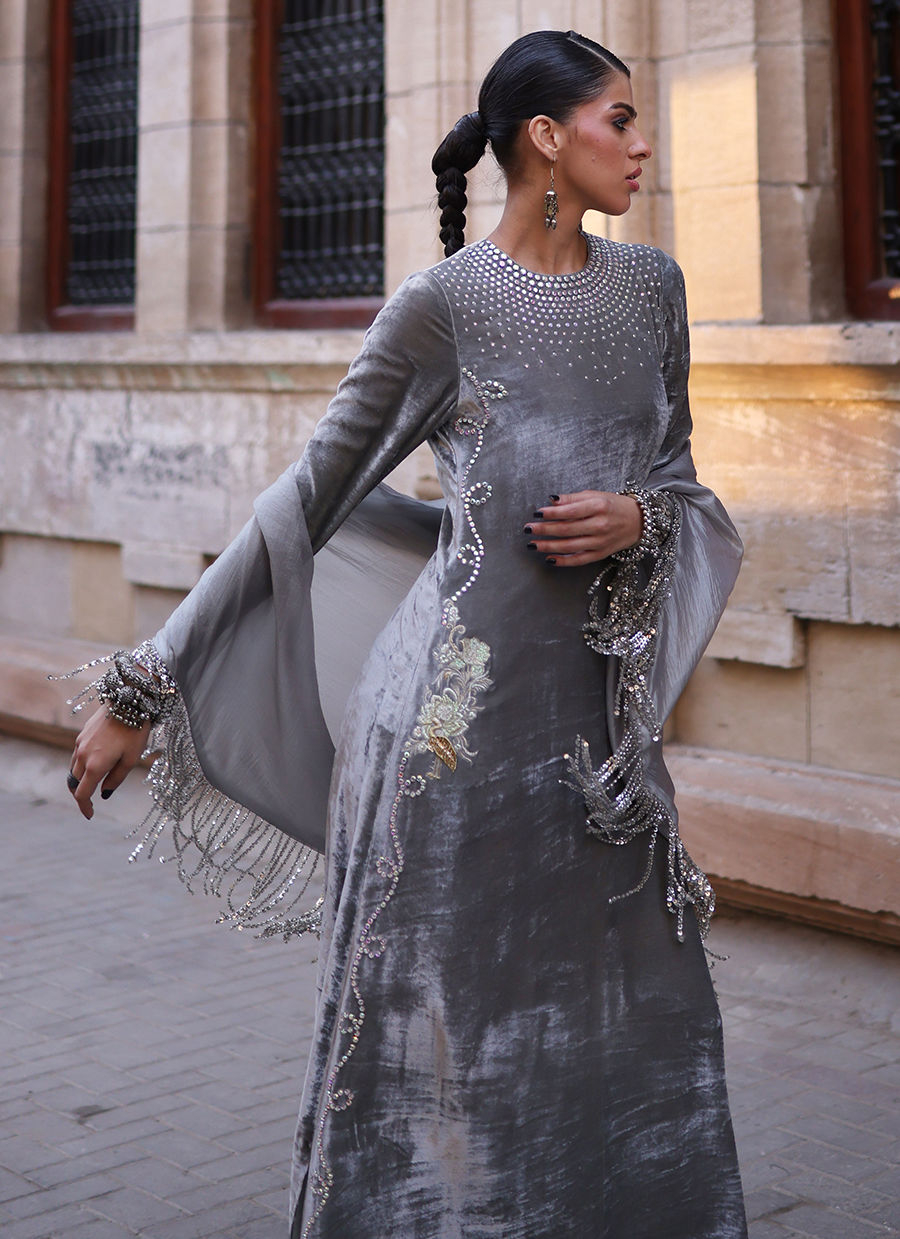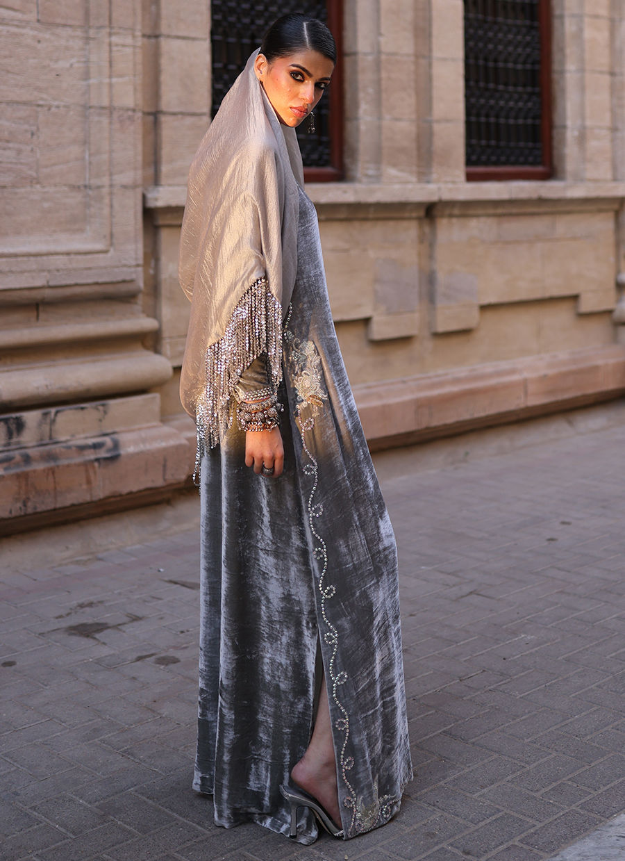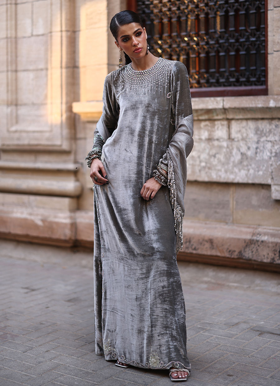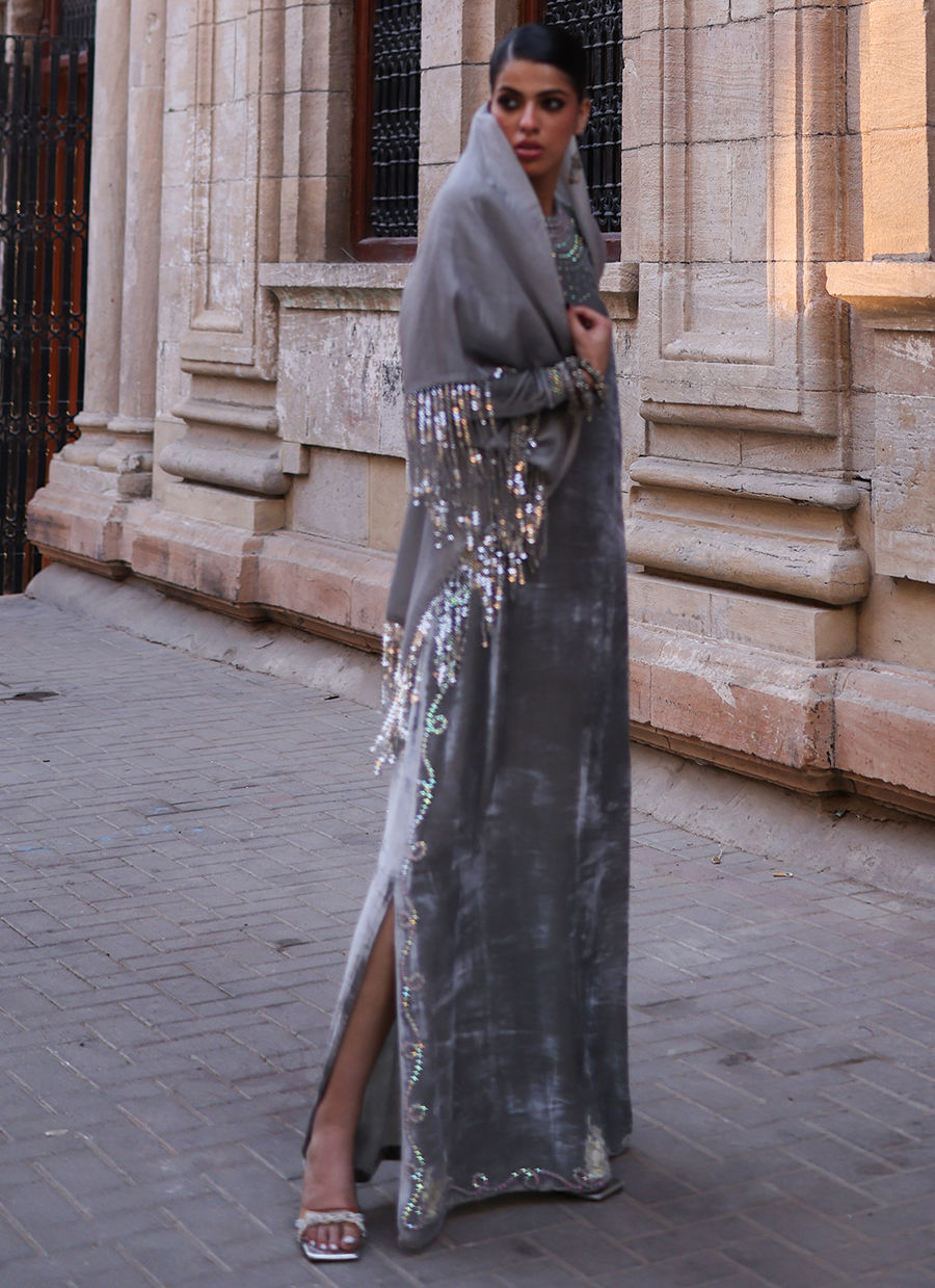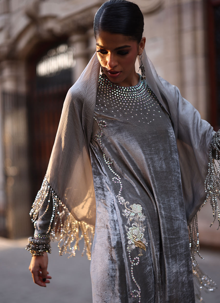 An elegant Desert Sage kaftan crafted from pure velvet, adorned with exquisite hand-stitched stone work featuring zari, resham, cutdana, sequins, dabka, and nakshi detailing on the front, back, and sleeves. The silhouette is thoughtfully designed with functional pockets for added ease. Paired with a refined shrug in diamond silk and culottes tailored from soft cotton charmeuse, this ensemble blends luxurious craftsmanship with understated sophistication — a perfect choice for timeless festive charm.