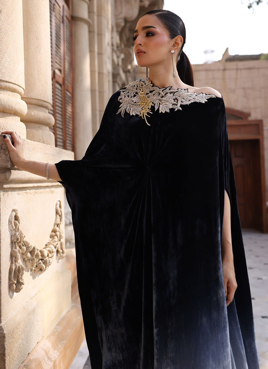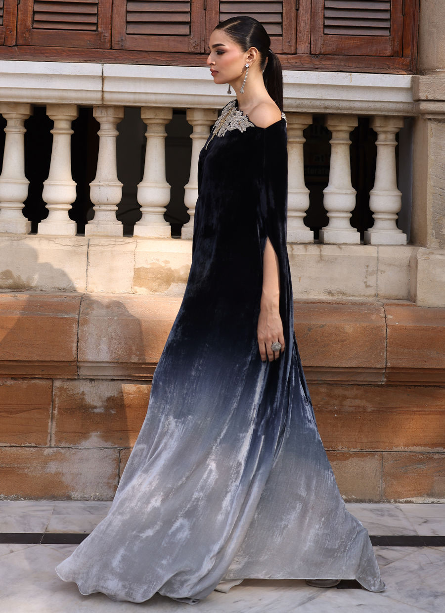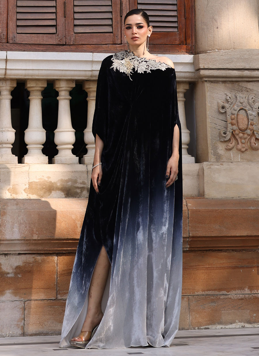 Color: Kaftan: Black Ombre and Pants: Grey Fabric: Pure Velvet Work Details: Embroidered and Embellished