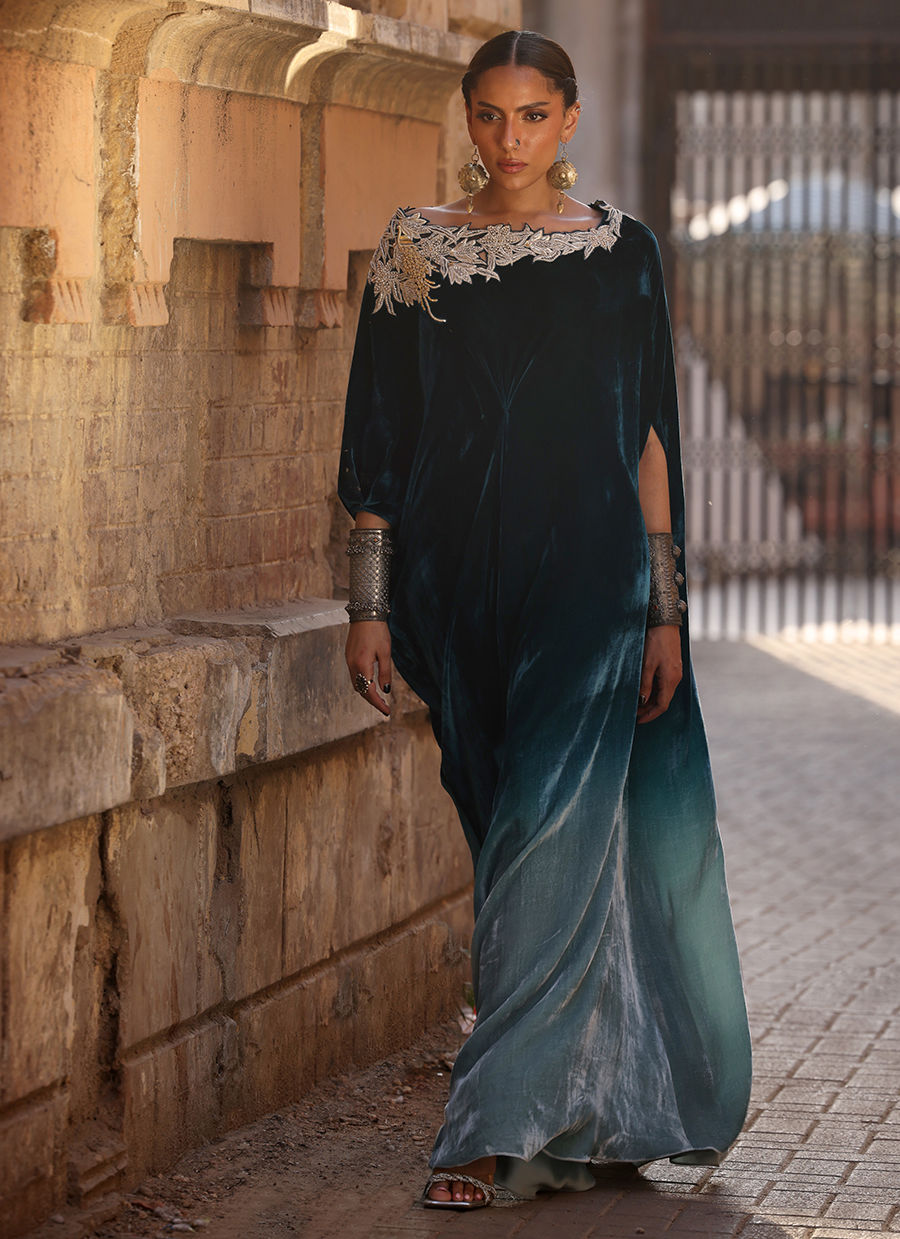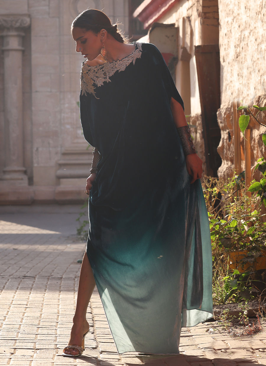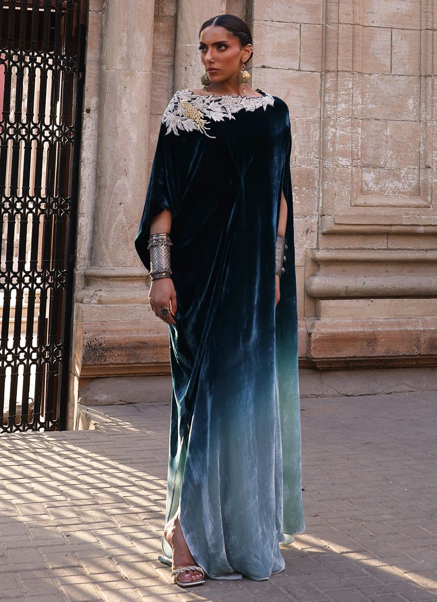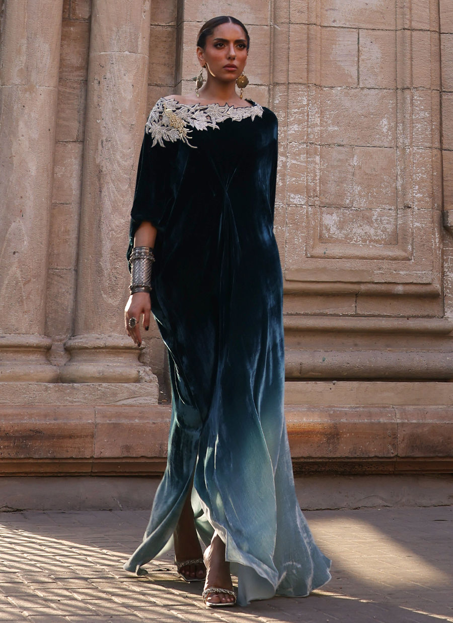 Color: Kaftan: Teal Ombre and Pants: Lighter Tone Fabric: Pure Velvet Work Details: Embroidered and Embellished