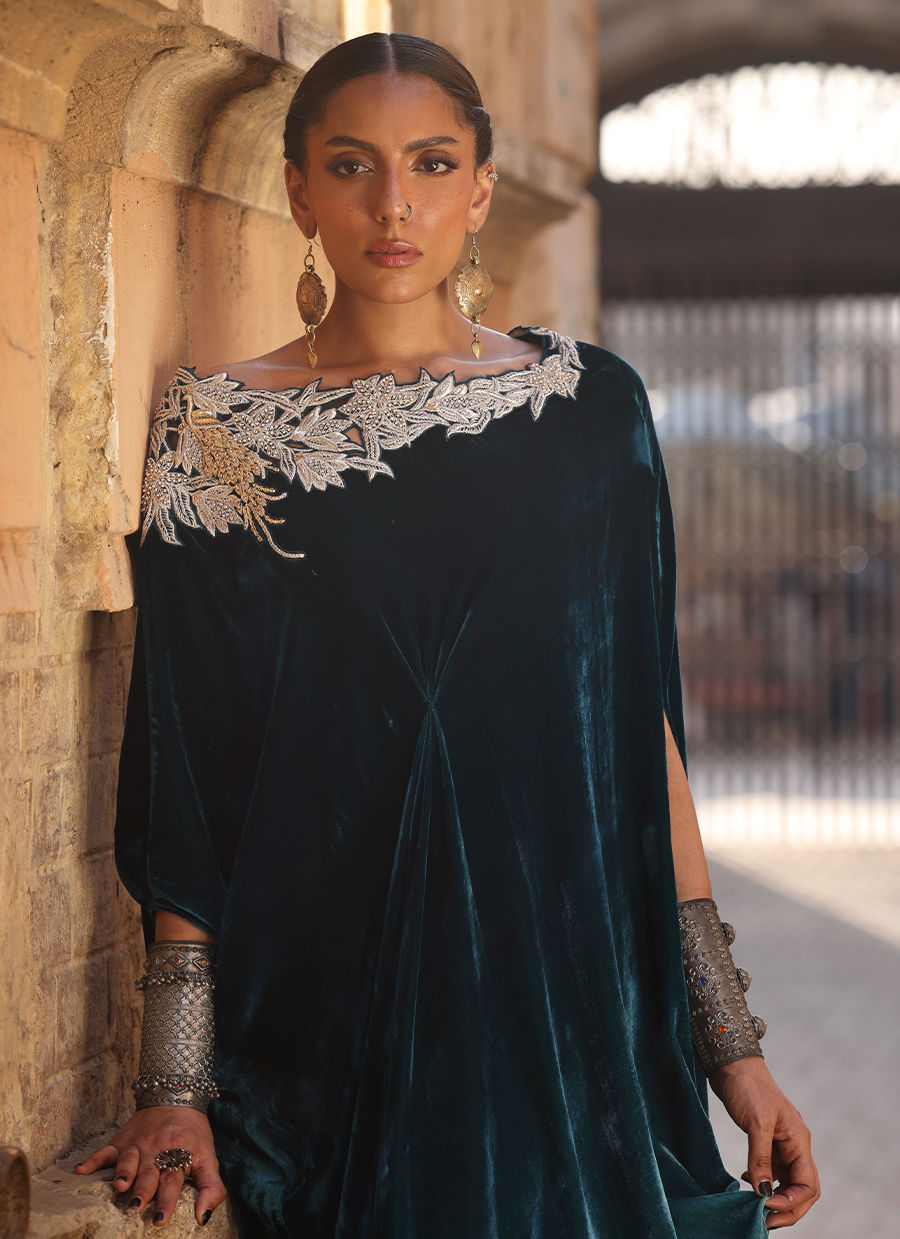 A graceful Teal Ombre kaftan crafted from pure velvet, featuring exquisite silver and gold embroidery with intricate detailing of zari, moti, nakshi, dabka, cutdana, kaamdani, stones, and crystals on the front and back. The elegant cutwork enhances its refined craftsmanship, adding depth and texture to the design. Paired with cotton charmeuse pants in a lighter tone, this ensemble embodies timeless luxury and understated sophistication — perfect for festive and formal occasions.