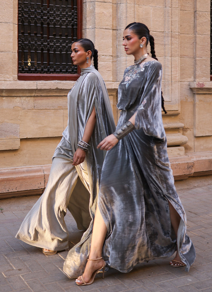 A sophisticated kaftan in luxurious pure velvet, paired with cotton charmeuse pants for comfort and elegance. The ensemble is adorned on the front, back, and sleeves with intricate silver zari and colored resham embroidery, enhanced with delicate cutdana, sequins, pearls, and crystals, showcasing exceptional handwork and timeless craftsmanship.