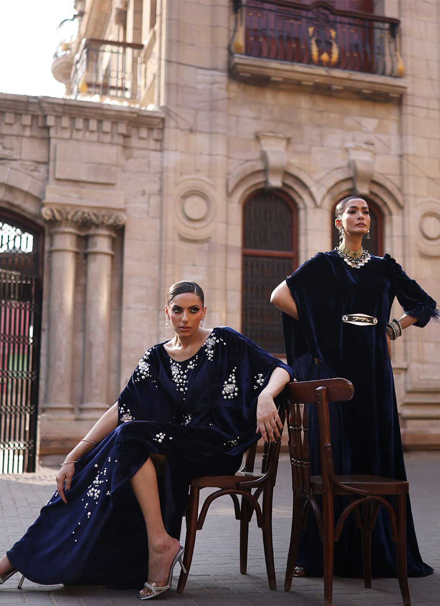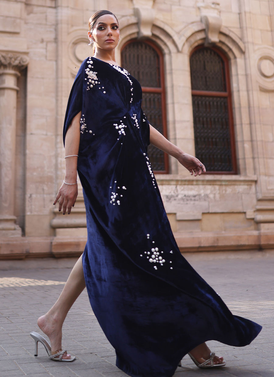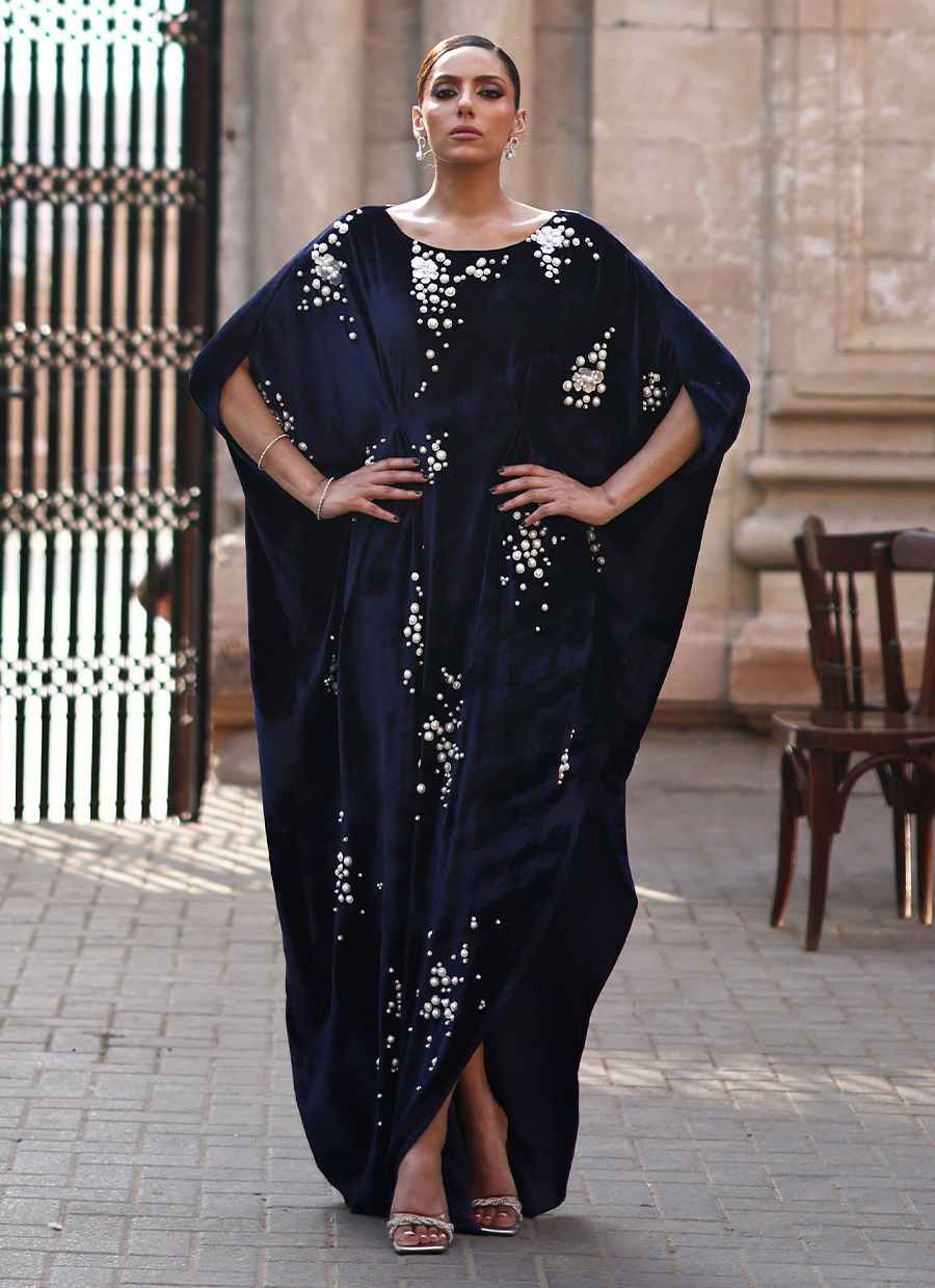 A regal kaftan crafted in luxurious pure velvet, rendered in a striking deep blue hue. The design is embellished all over with varying sizes of white pearls, moti, delicate floral motifs, and silver nakshi, creating a beautifully textured and luminous finish. Paired with cotton charmeuse pants, this ensemble exudes timeless grace and understated sophistication.