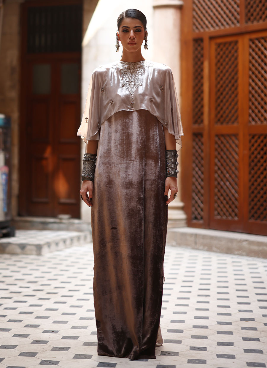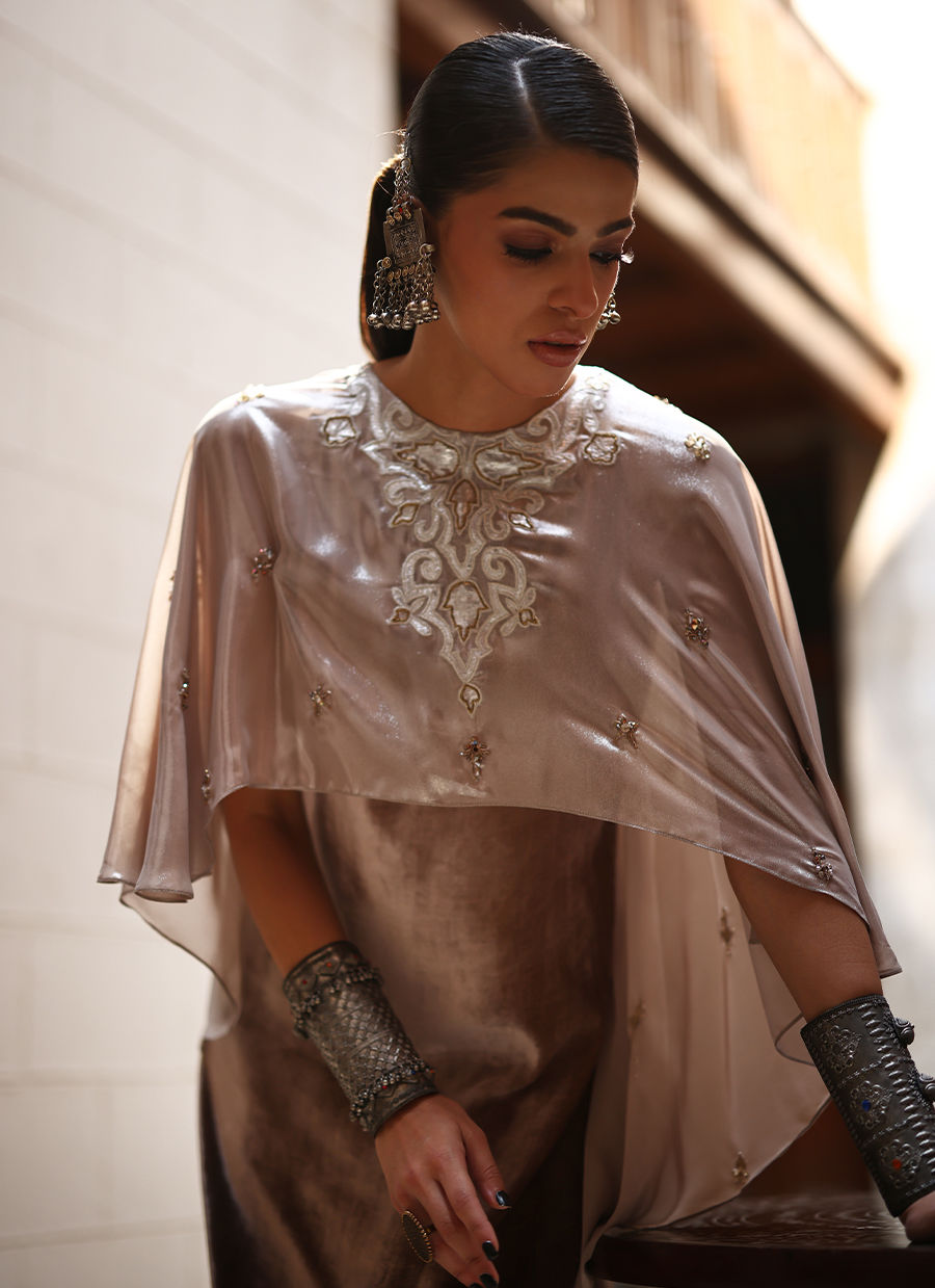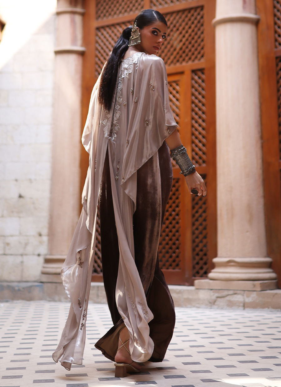 An elegant kaftan crafted in luxurious pure velvet in a soft beige ombre hue, featuring intricate silver appliqué work and all-over hand-embroidered boties. The exquisite detailing includes imported crystals, stones, moti, and dabka, showcasing exceptional craftsmanship. Paired with cotton charmeuse pants in dark beige for comfort and balance, and complemented with a beige lame chiffon cape, this ensemble exudes sophistication, grace, and contemporary elegance.