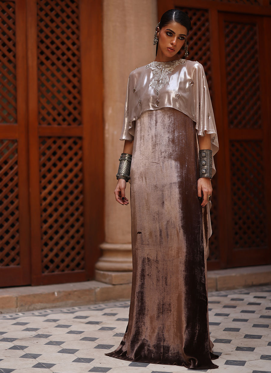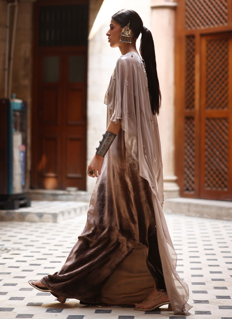 Color: Kaftan: Begie Ombre, Cape: Begie and Pants: Dark Begie Fabric: Pure Velvet Work Details: Embroidered and Embellished