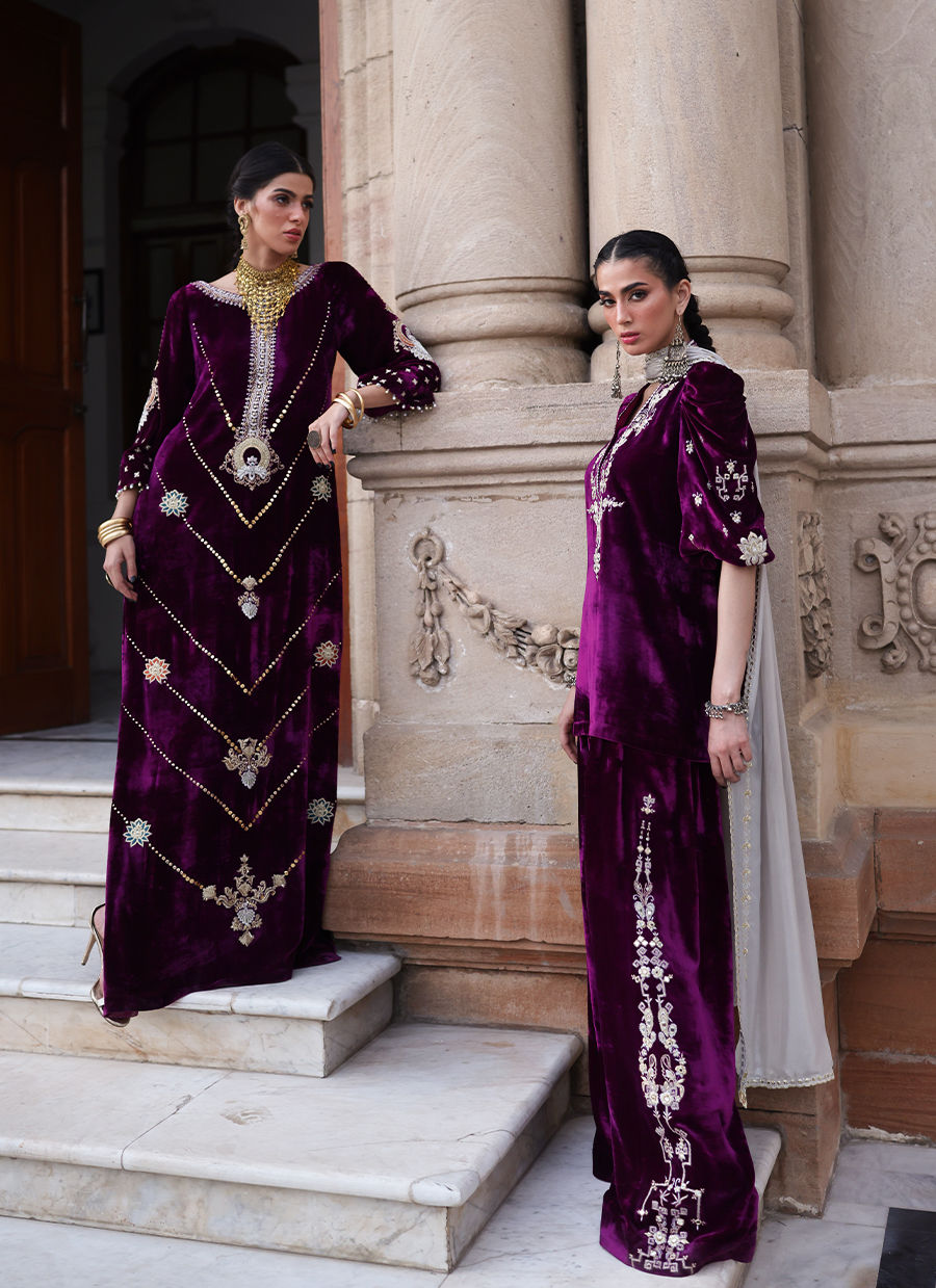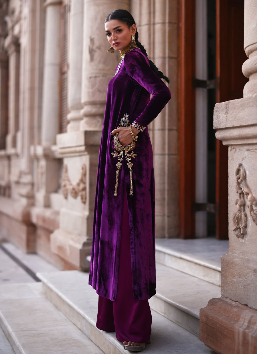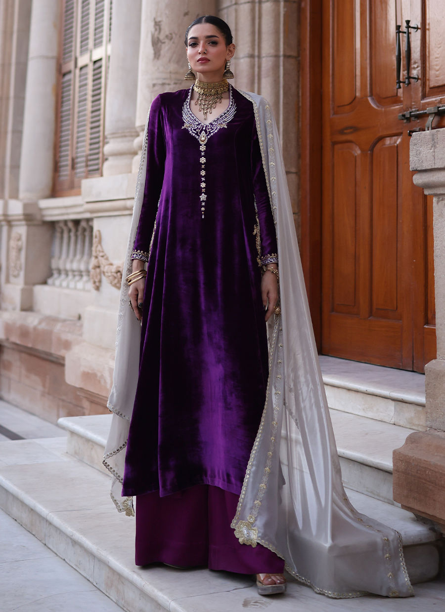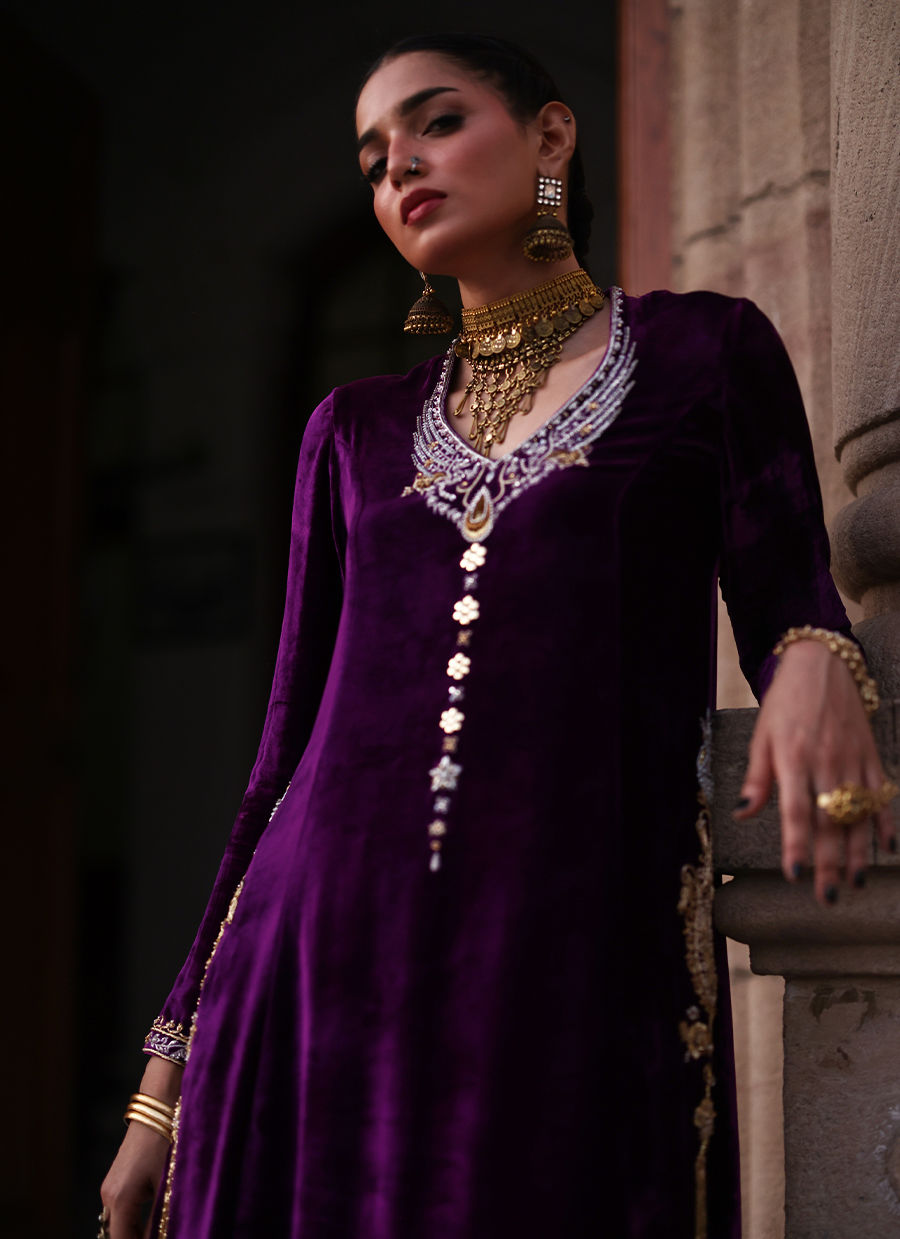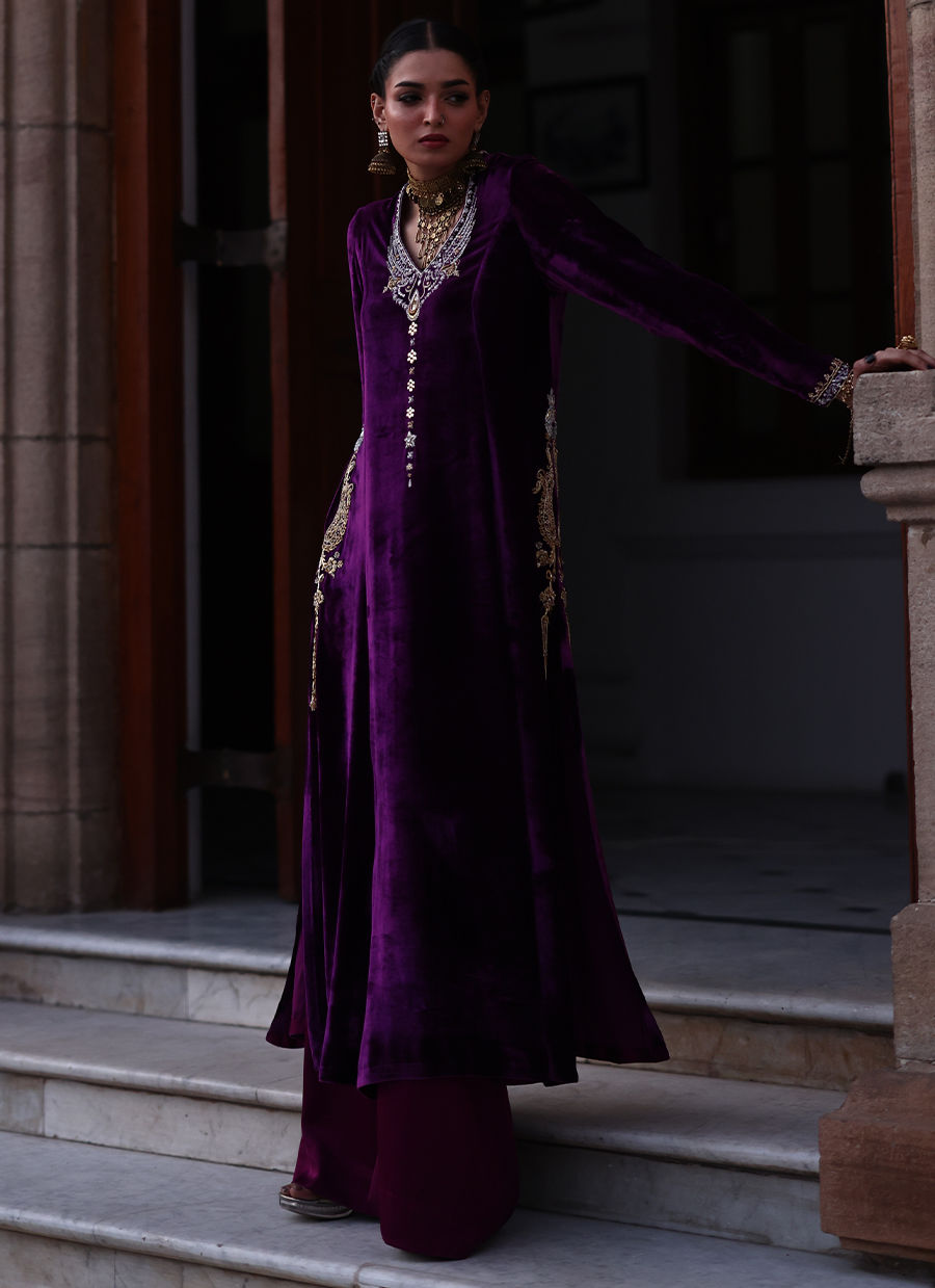An opulent prince panel crafted in luxurious pure velvet, featuring side pockets for a modern touch. The design is adorned with silver and gold zari embroidery, enriched with heavy antique zardozi work including kaamdani, dabka, nakshi, stones, cutdana, moti, and crystals on the front, back, and sleeves, reflecting exquisite craftsmanship. Paired with cotton charmeuse culottes for elegance and comfort, and complemented with a fog beige lame chiffon dupatta embellished with gold, silver, and lorix embroidery, this ensemble perfectly balances regal sophistication with contemporary style.
