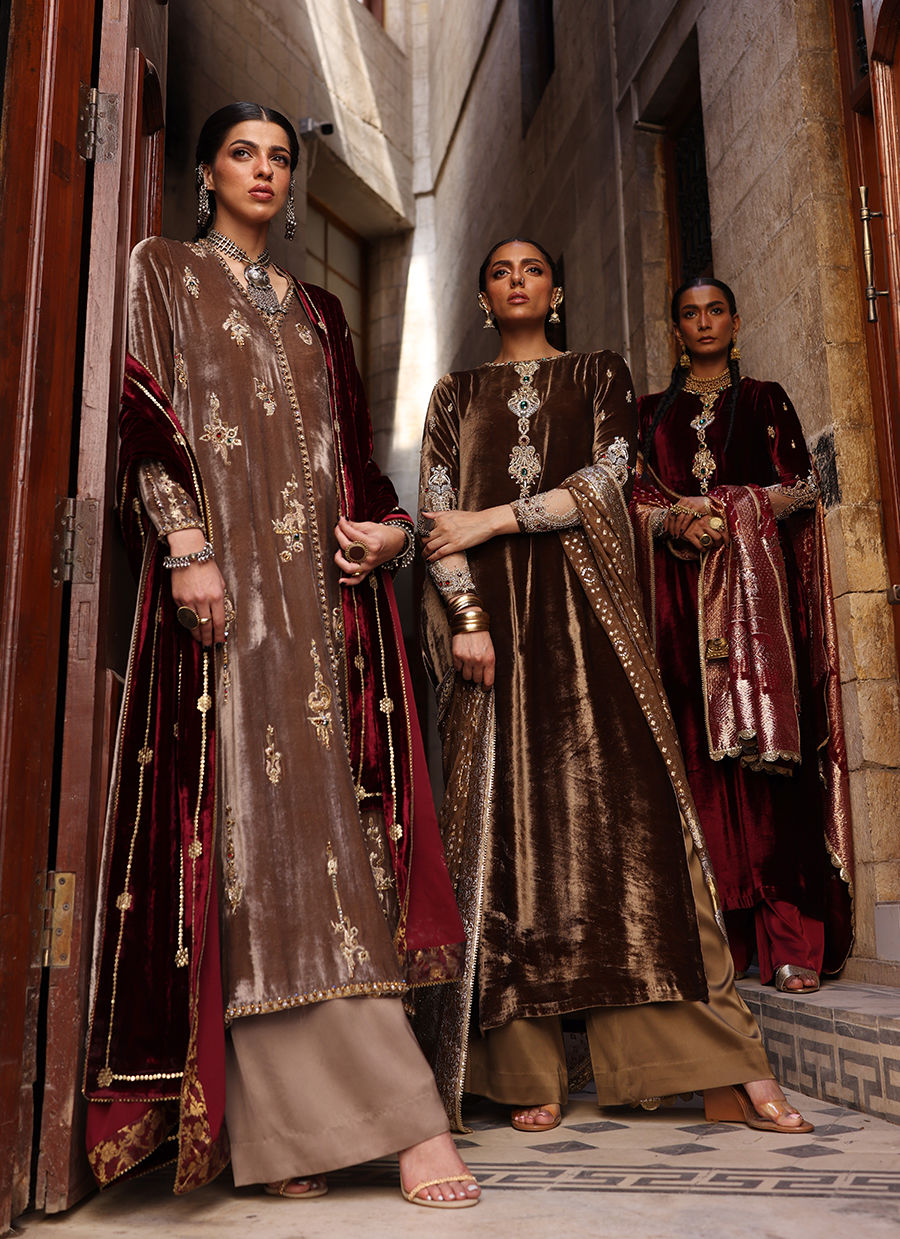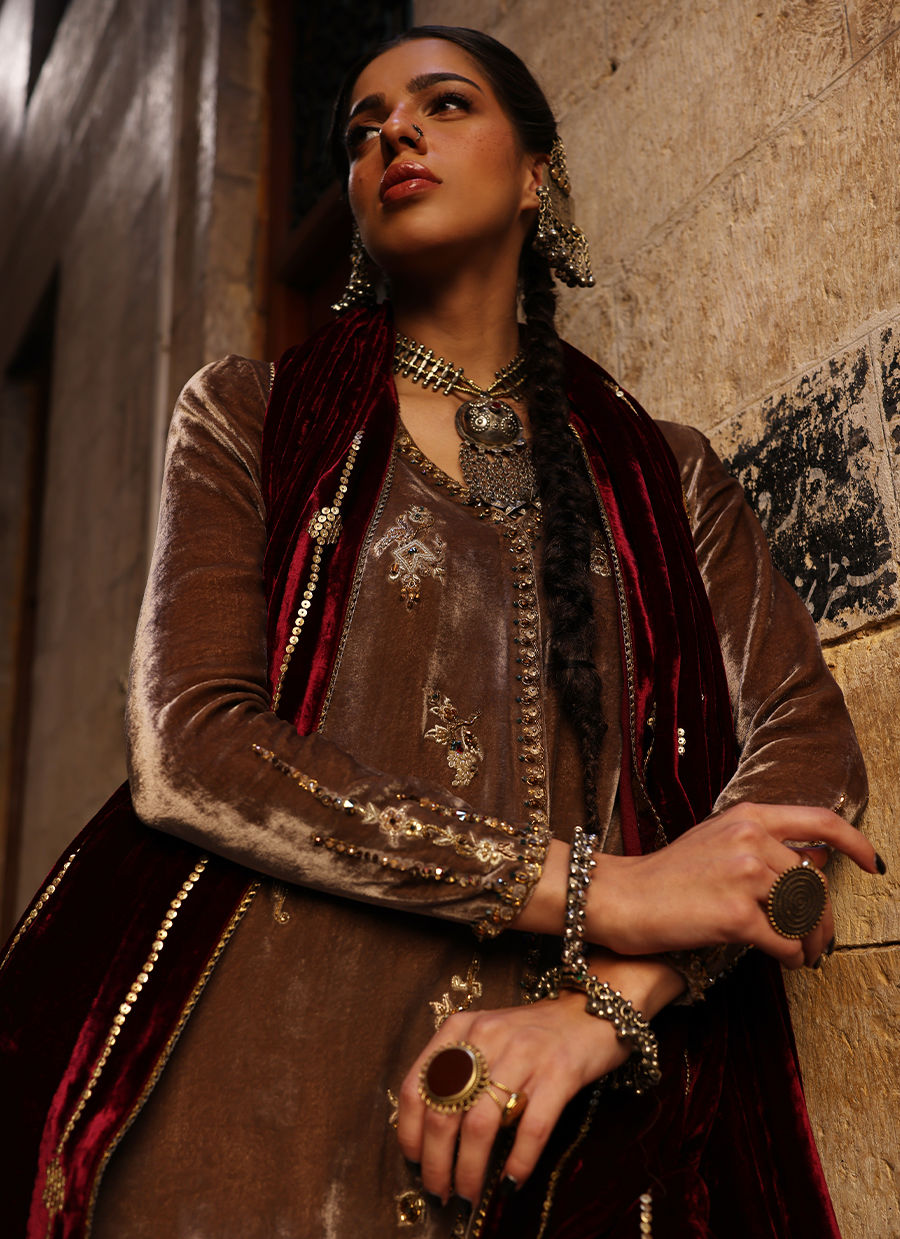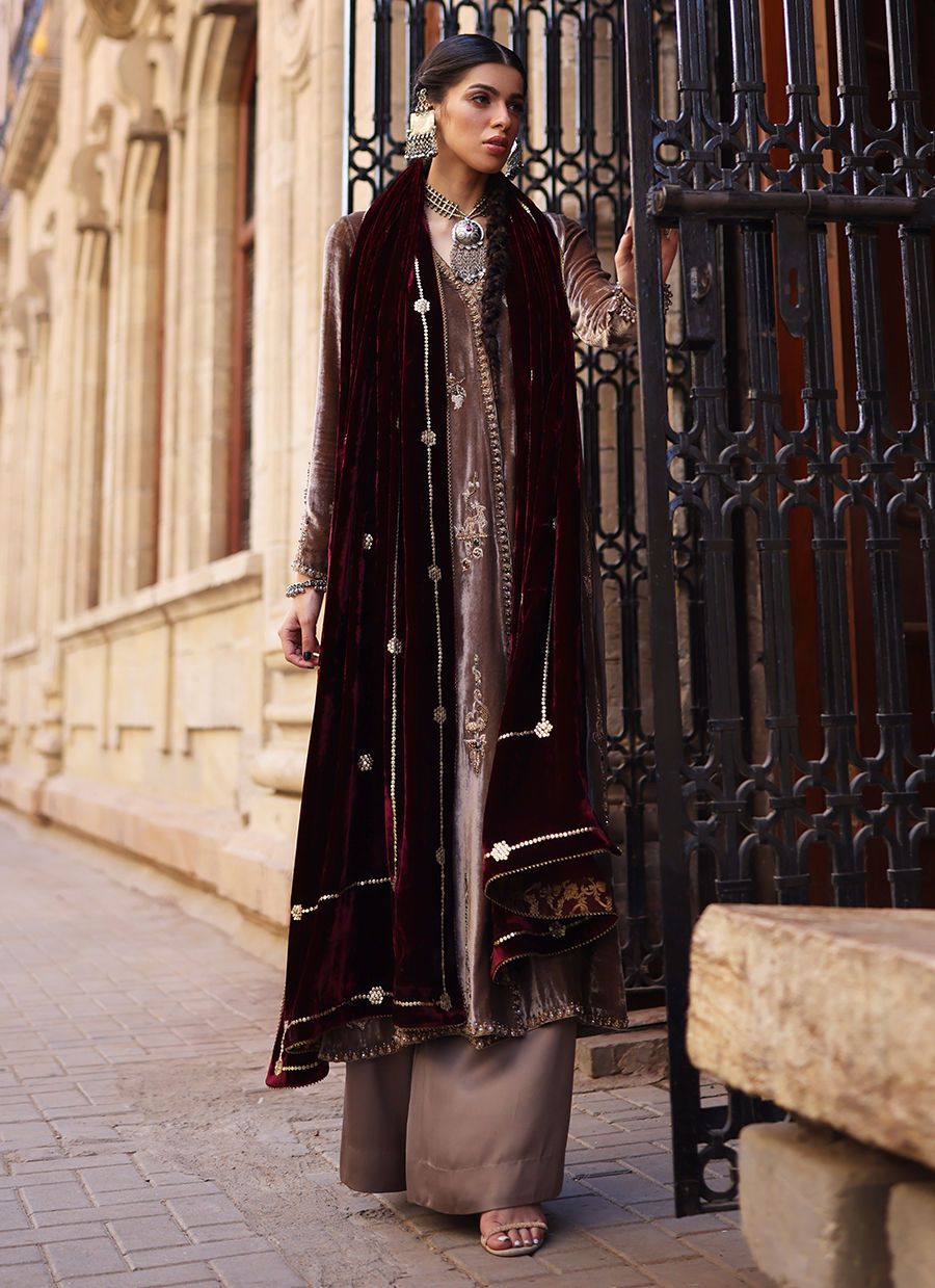 A Wood Smoke-colored Chogha-style shirt in pure velvet, intricately embroidered with gold, antique, and rose gold zari threads. The heavy zardozi work is a celebration of craftsmanship — featuring imported crystals, dabka, nakshi, stones, cutdana, sequins, and moti across the front, back, and sleeves. Completing the ensemble are cotton charmeuse culottes and a pure velvet shawl in rich mahroon, detailed with gold and antique sequins for a luxurious finish.