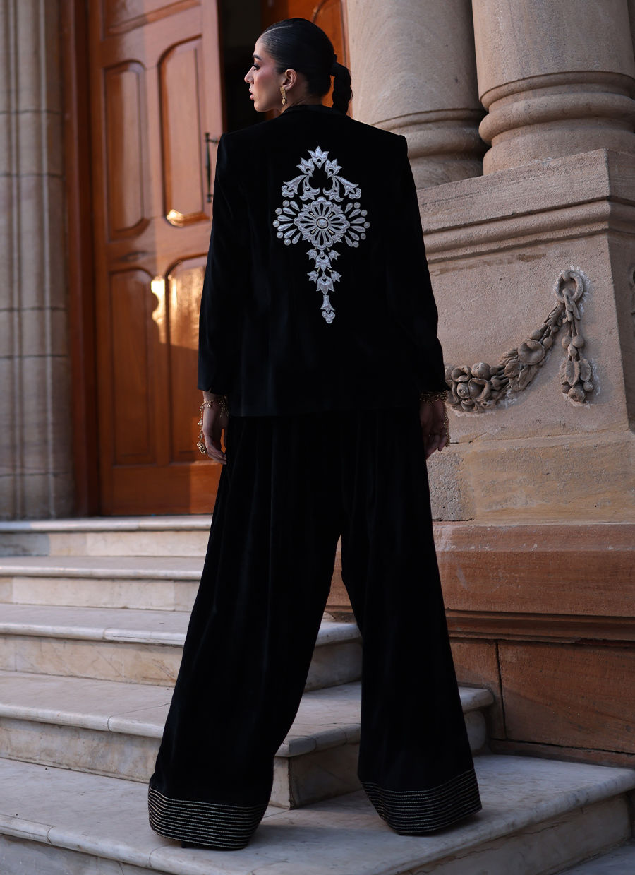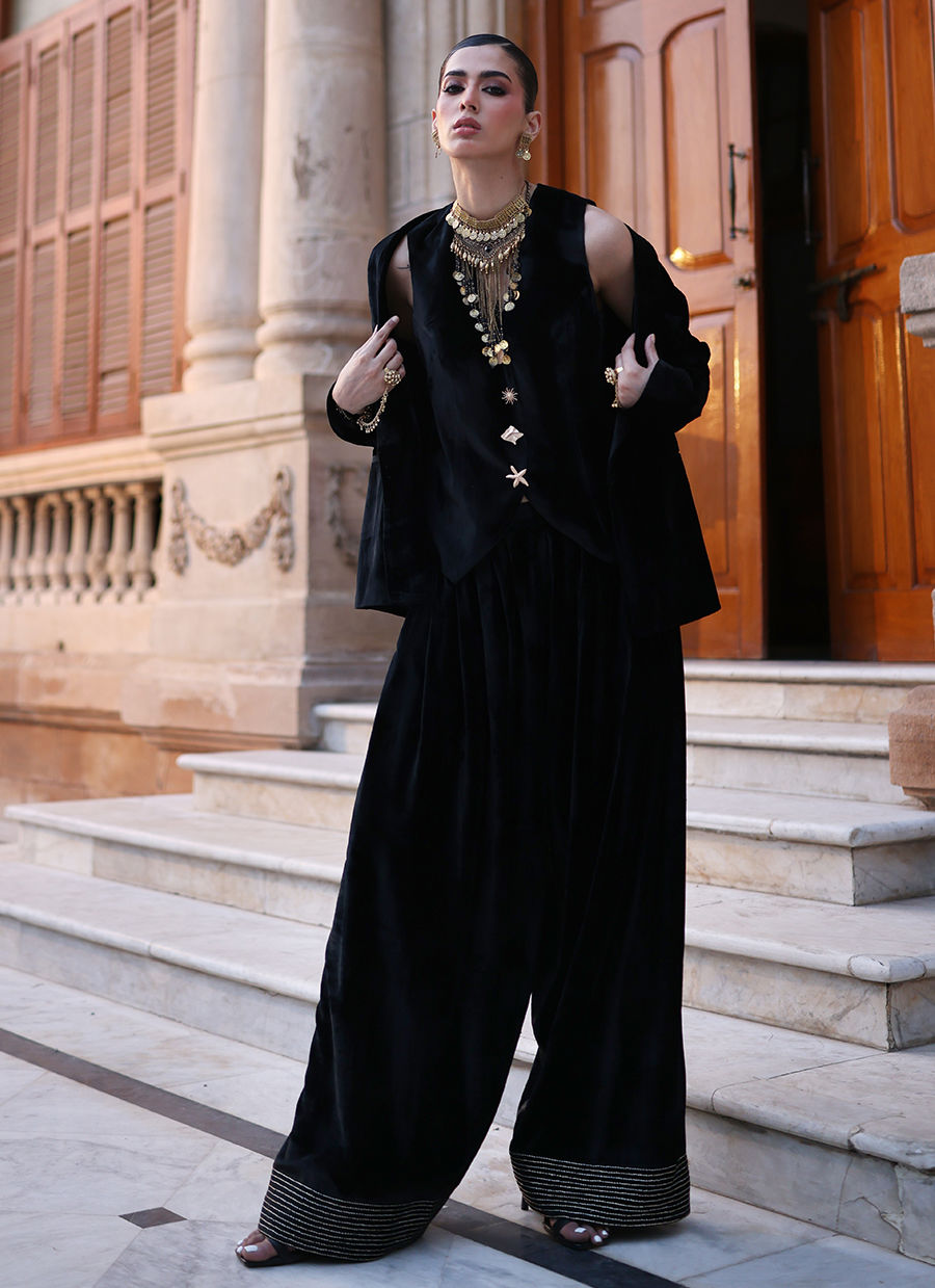 A sophisticated ensemble featuring a pure velvet waistcoat and blazer in classic Black. The blazer’s back is adorned with intricate gold and silver embroidery, while the waistcoat is detailed with imported buttons on the front for a refined finish. Paired with farshi culottes in pure velvet, embellished with silver and gold embroidery along the hem, this look blends regal craftsmanship with contemporary tailoring.