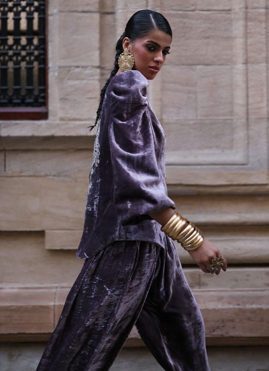 A sophisticated waist top with sleeves in pure velvet, rendered in the refined Quail hue. The back is adorned with intricate gold and silver embroidery and delicate silver appliqué work, while imported buttons accentuate the front for a polished finish. Paired with farshi culottes in pure velvet, featuring silver and gold embroidery along the hem, this ensemble balances traditional craftsmanship with contemporary elegance.
