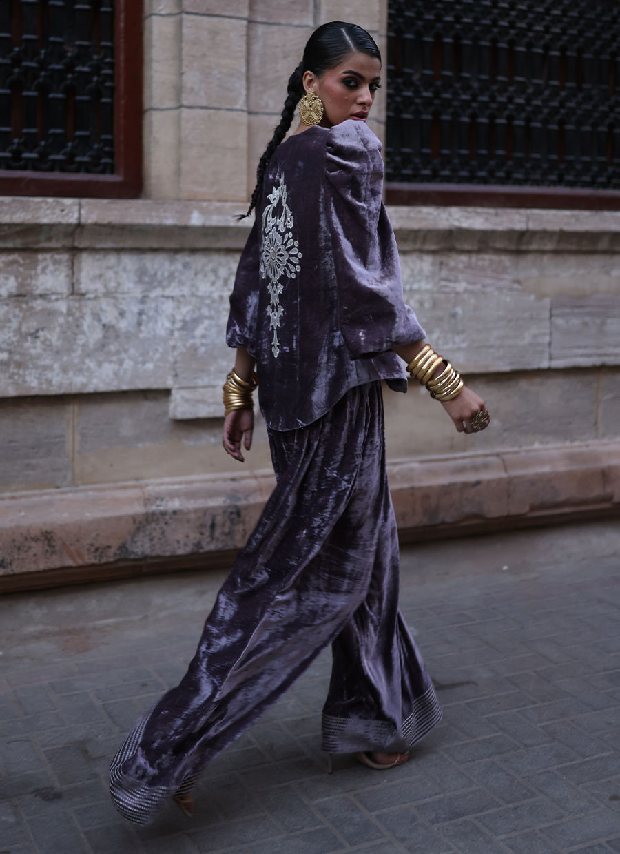 A sophisticated waist top with sleeves in pure velvet, rendered in the refined Quail hue. The back is adorned with intricate gold and silver embroidery and delicate silver appliqué work, while imported buttons accentuate the front for a polished finish. Paired with farshi culottes in pure velvet, featuring silver and gold embroidery along the hem, this ensemble balances traditional craftsmanship with contemporary elegance.
