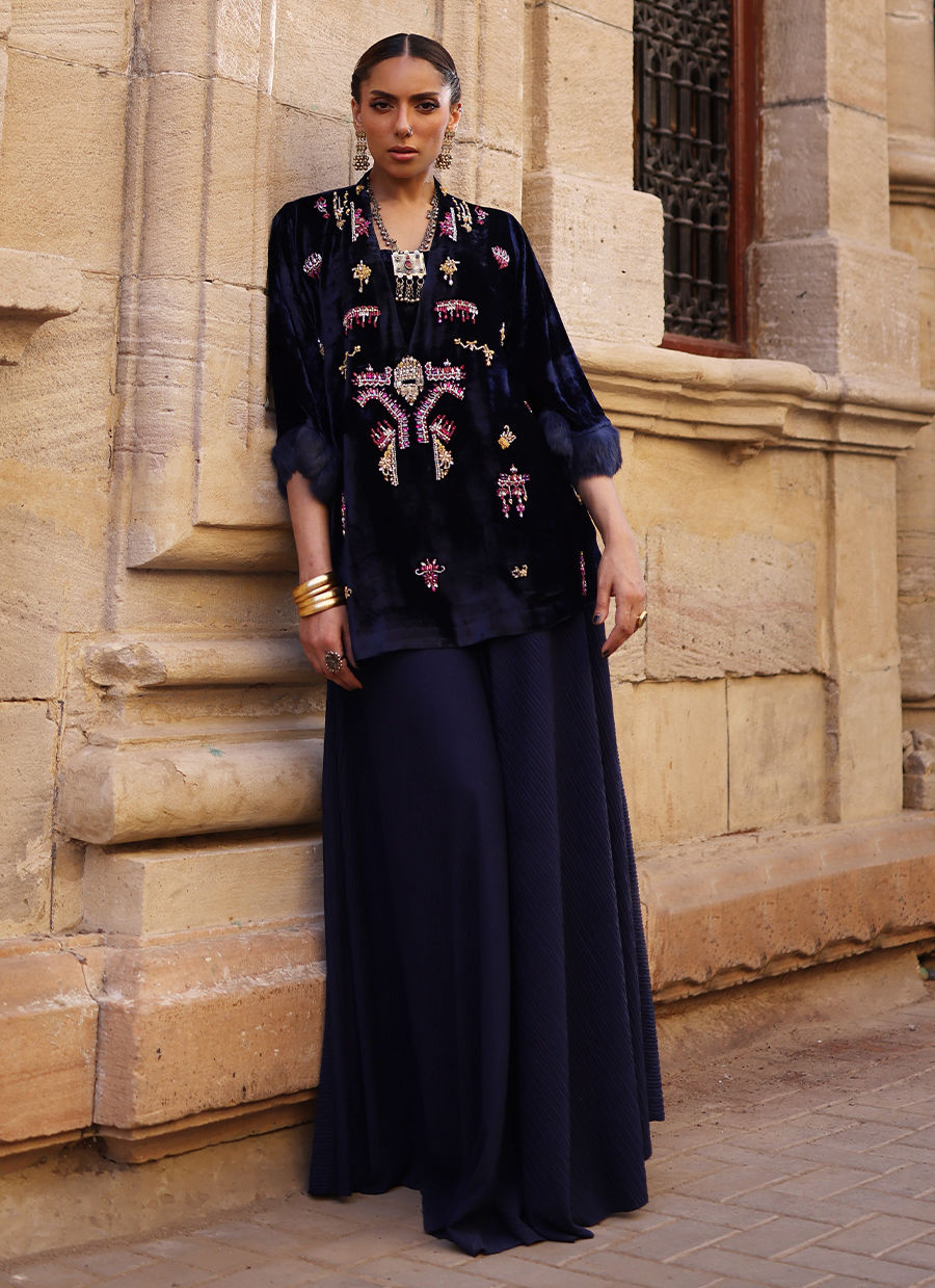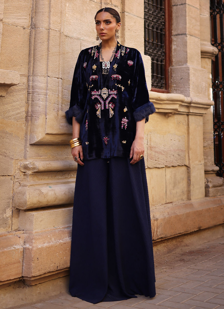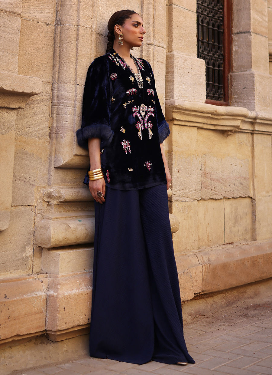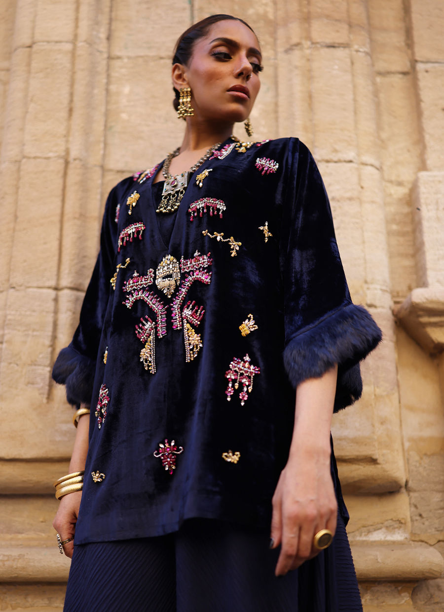 A short shirt in pure velvet, rendered in a striking Deep Blue shade and intricately embellished with colorful stones, crystals, cutdana, sequins, and nakshi work. The sleeves are finished with a delicate fur edge, adding a touch of sophistication. Styled with pleated flare pants, this ensemble blends playful charm with luxurious craftsmanship.