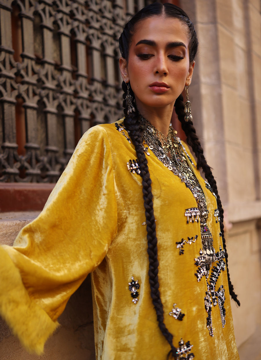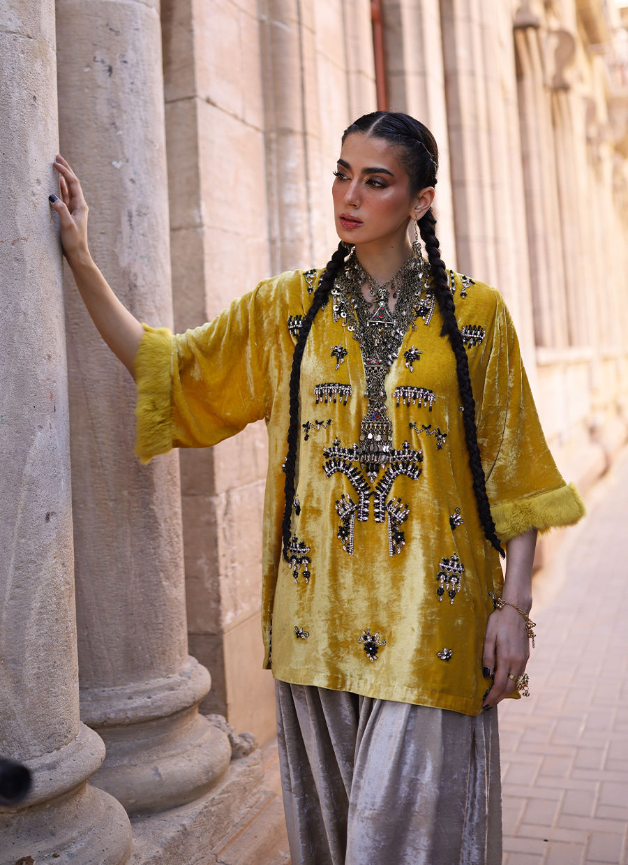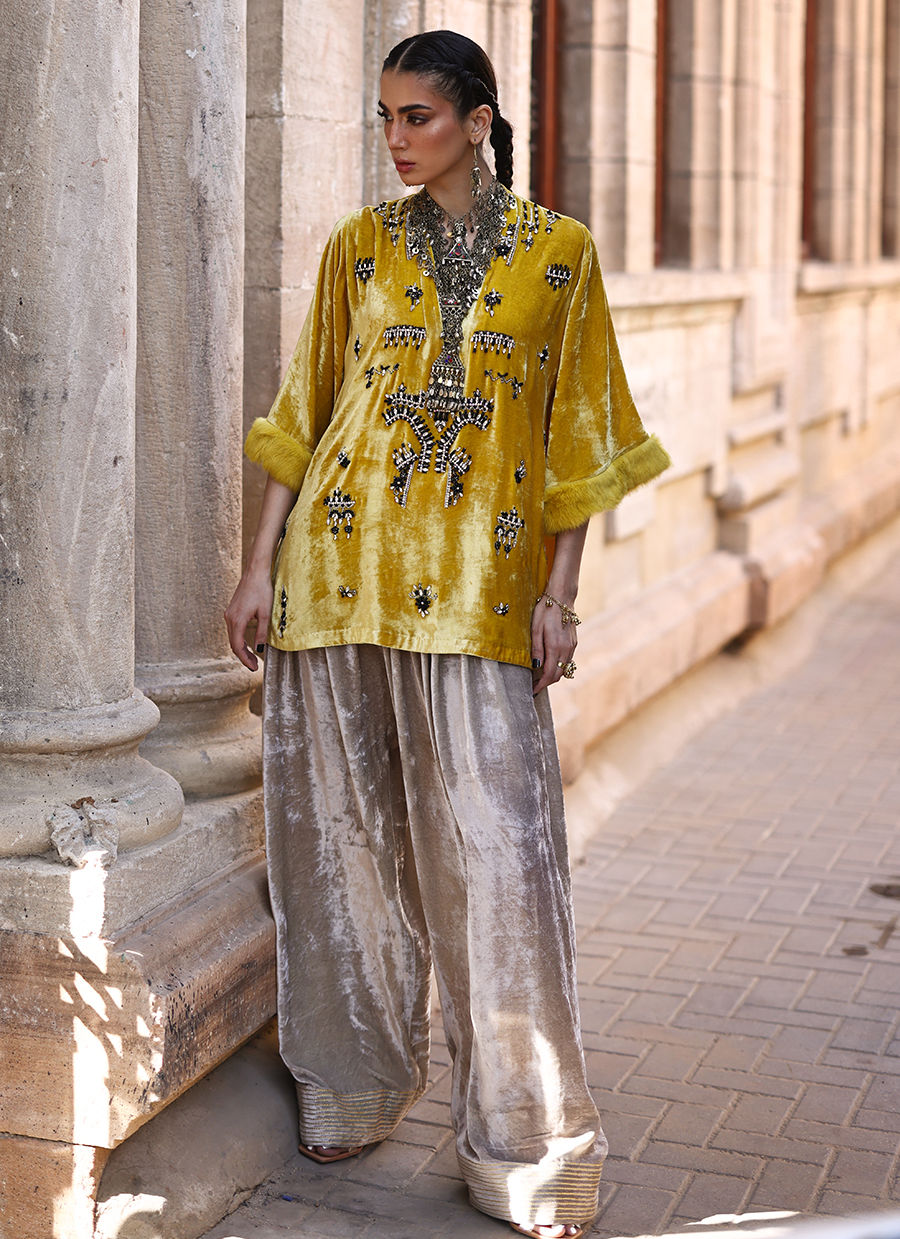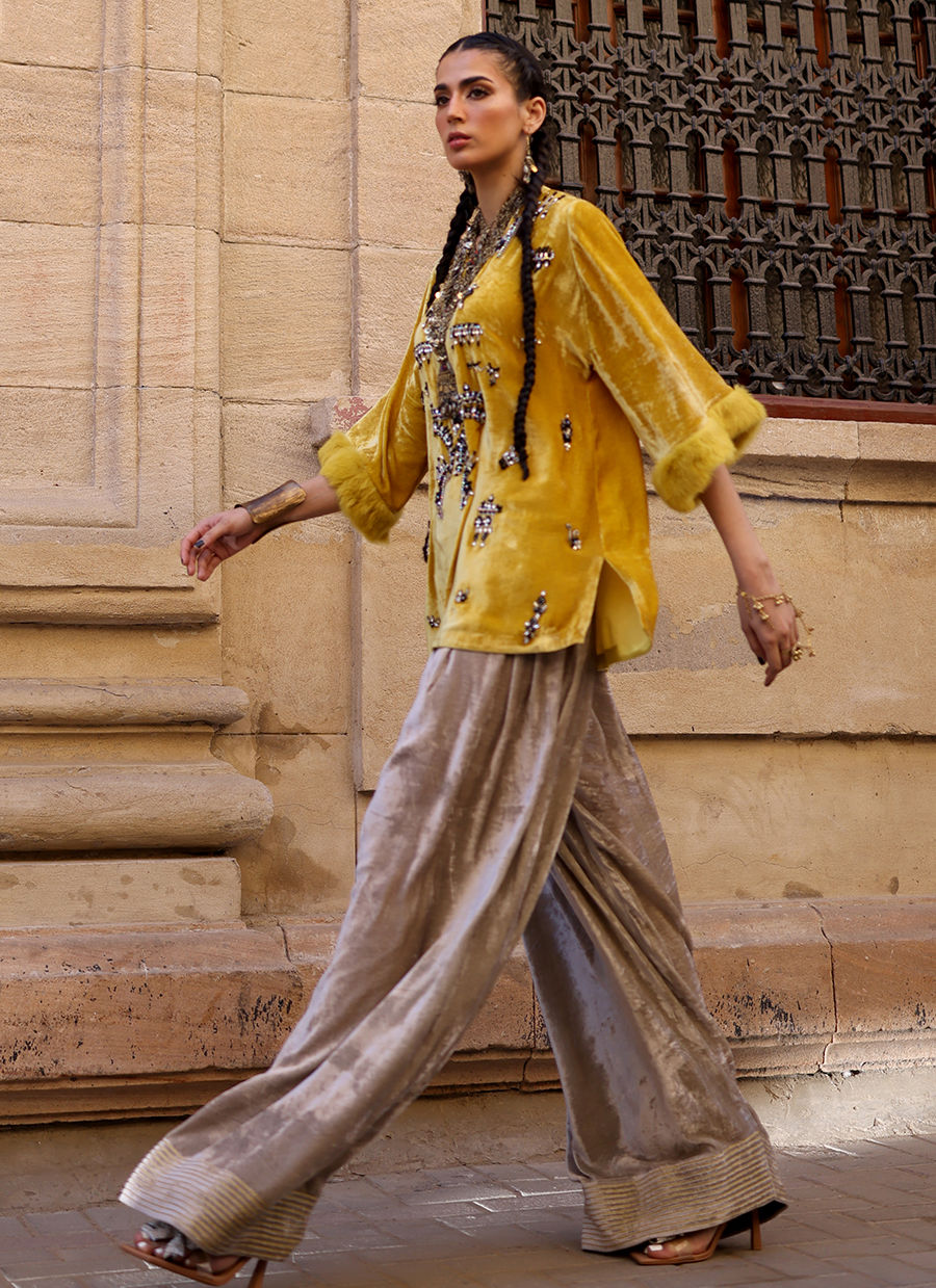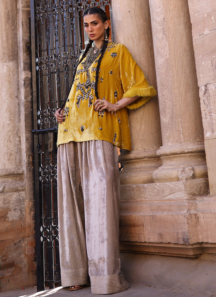 A short shirt in pure velvet, rendered in a soft Beige shade, intricately embellished with black and silver stones, crystals, cutdana, and sequins. The sleeves are finished with a luxurious fur edge, adding refined texture. Paired with farshi culottes in pure velvet, featuring yellow embroidery along the hem, this Golden Rod ensemble blends timeless elegance with contemporary charm.