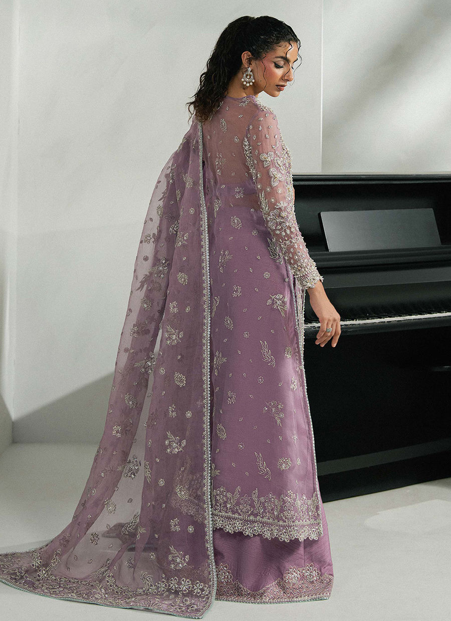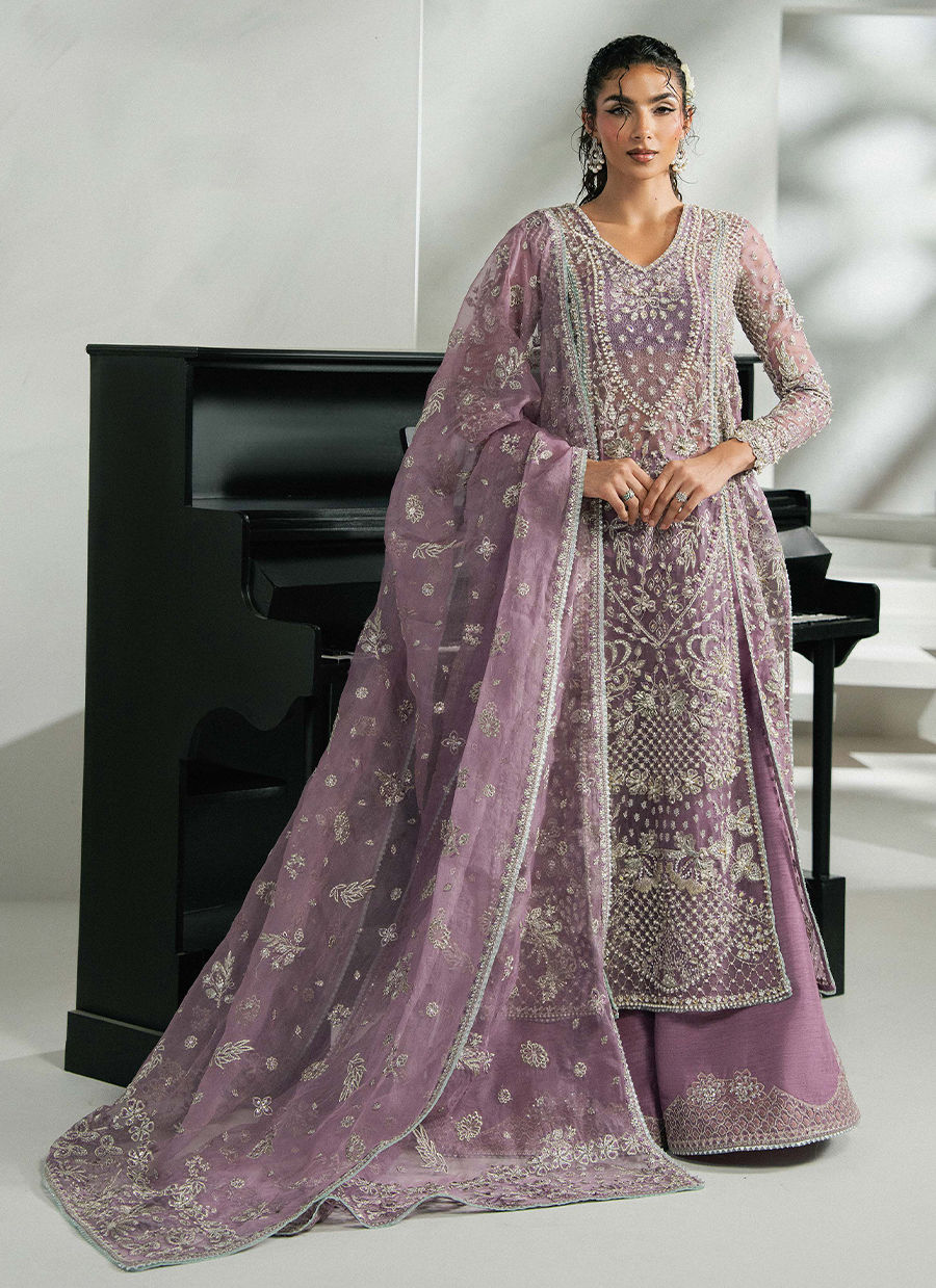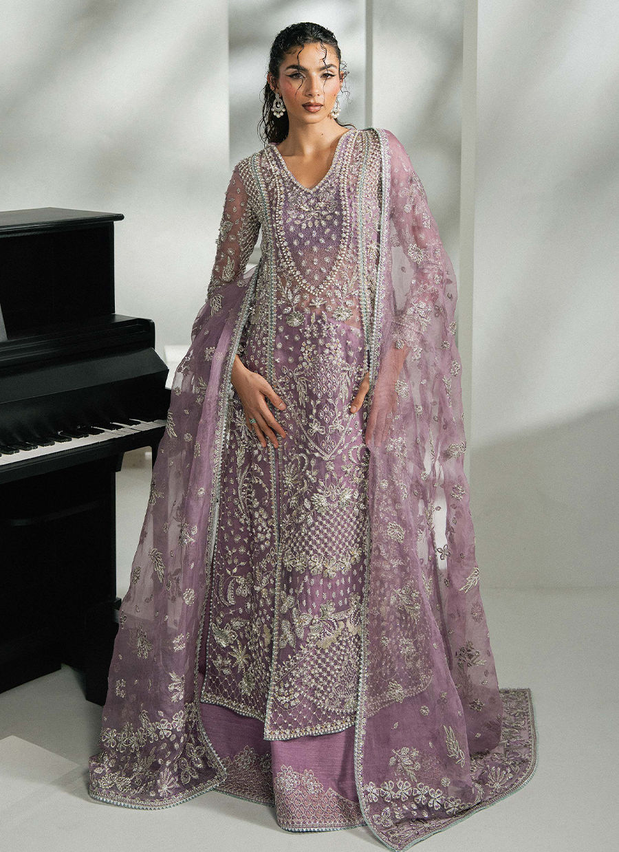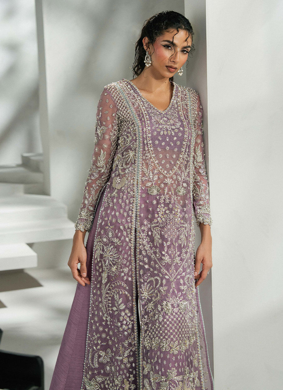 Gaspard is a vision of graceful elegance in ash lilac, this 3-panel front-open shirt is beautifully adorned with resham embroidery and delicate sequin work, each motif crafted with timeless artistry. Paired with flared Raw silk pants and an Oganza dupatta featuring a two-sided heavy pallu, the ensemble radiates refined sophistication and luxurious charm.