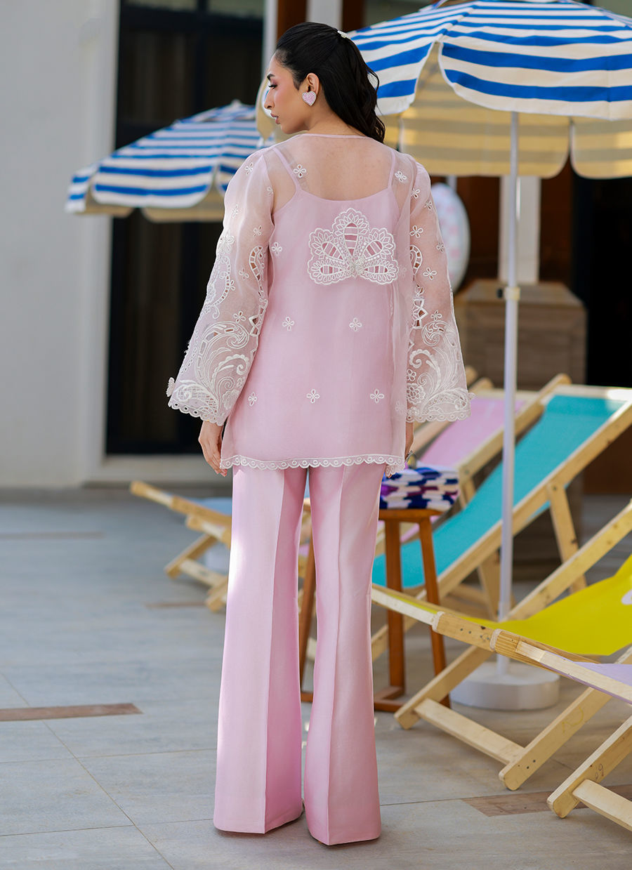 This lilac organza short jacket showcases exquisite off-white resham embroidery with detailed cutwork and schiffli throughout, beautifully accented with 3D silver butterfly embellishments. Styled with a sheesha silk inner slip and bootcut pants, it’s the perfect blend of effortless and elegance for an elevated Eid look.