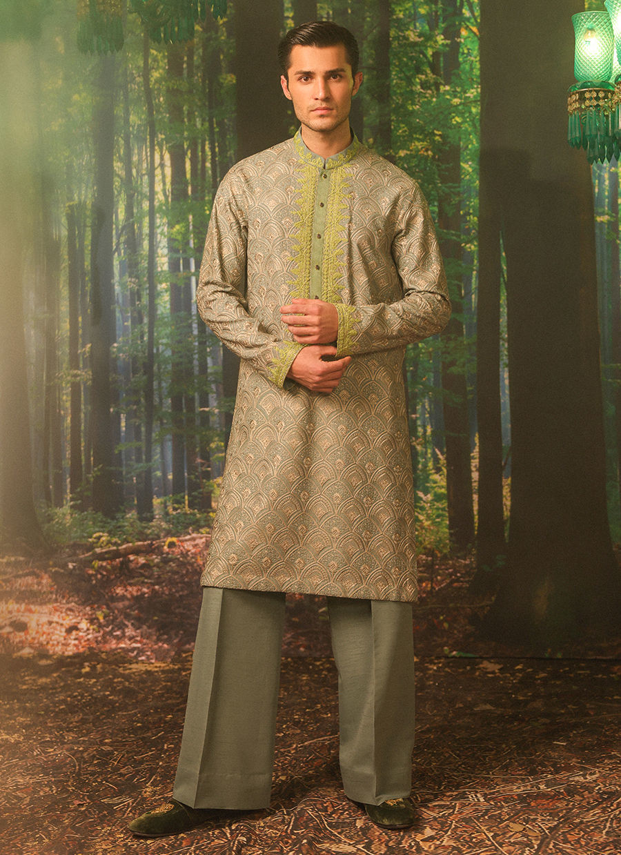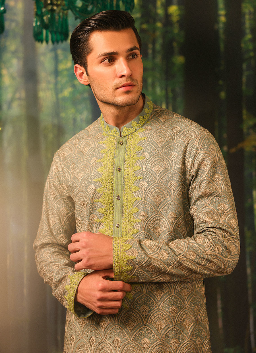 A unique mix of grey and teal with a pop of green embroidery on the kurta patti and collar, styled with flared raw silk pants.