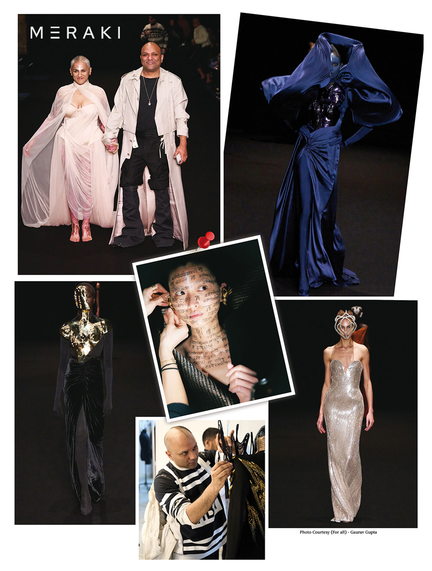 Gupta has always been in the spotlight for creating unique, diversified couture pieces - from structural, lean to voluminous silhouettes with his contemporary take on draping and pleating techniques. Similar designs were seen at Paris Couture Week in silks and gold breastplates, with Sanskrit written on the models’ faces, amongst many other elements.