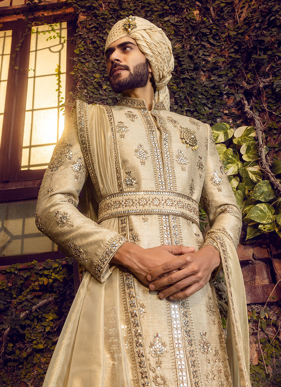 Gold Twill Matka Achkan with Belt embroidered with dabka mirrors beads and resham with monga gathered kurta and churidar.