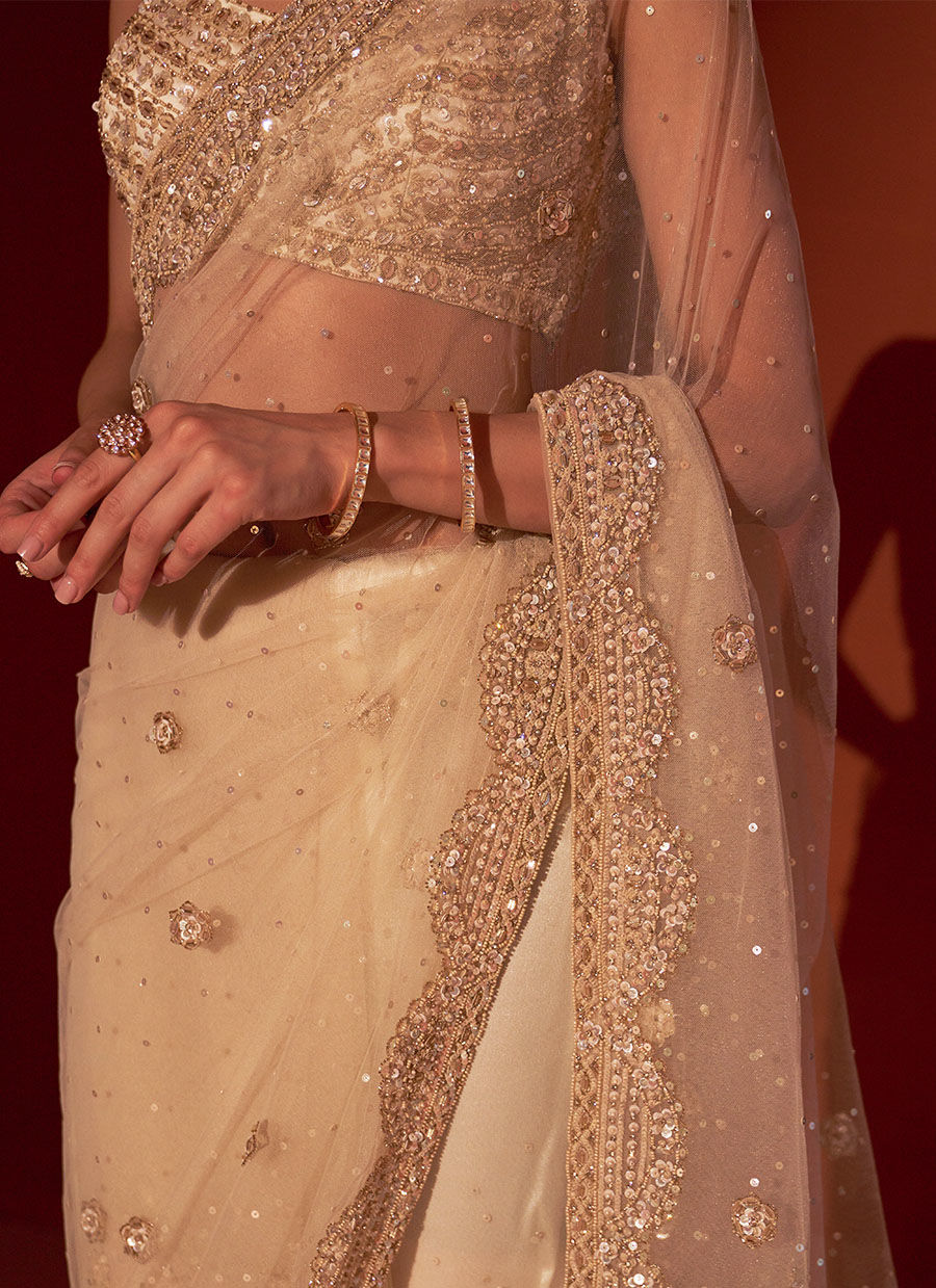 A gold net saree embroidered with golden pearls, sequins and crystals.