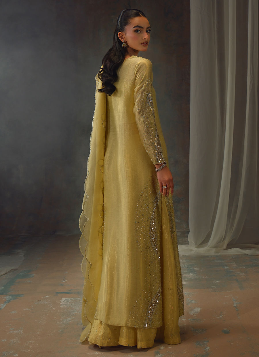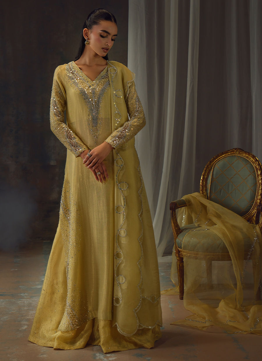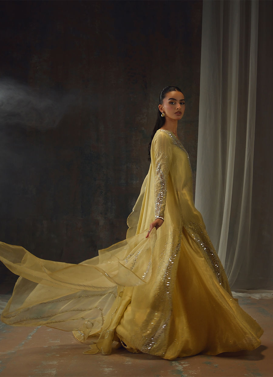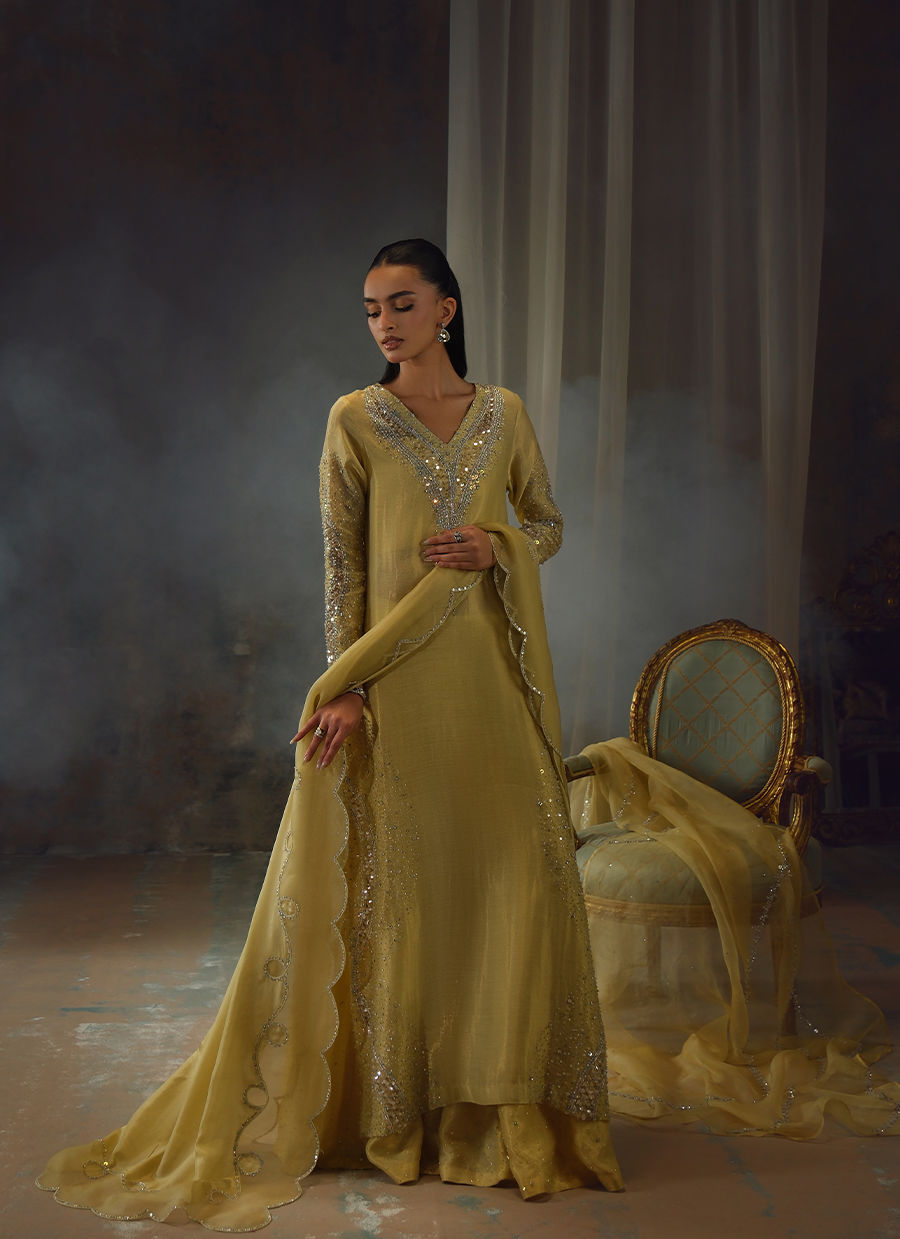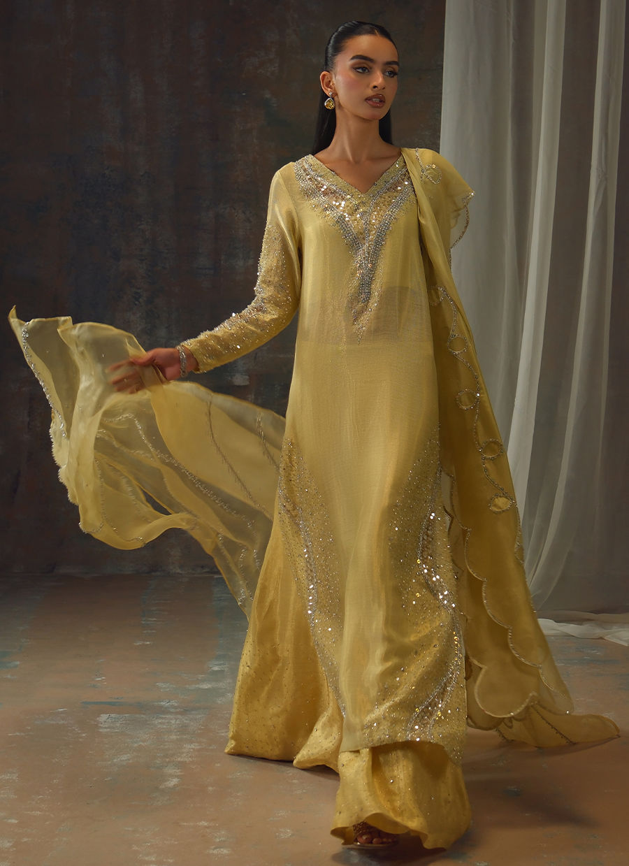 Bathed in a soft golden hue, and crafted from luminous zari net, the fluid silhouette is brought to life with meticulous hand embellishment. The shirt glistens with intricate detailing, while the lehnga mirrors the same artistry, creating a harmonious shimmer with every step. Can be paired with an airy organza dupatta adorned with delicate handwork for a light, ethereal finish, or a richer pure silk-and-organza blend, also hand-embellished, for a more modern drape. For a modern twist, the look can be paired with wide-leg pants, transforming this timeless piece into a statement of contemporary sophistication.