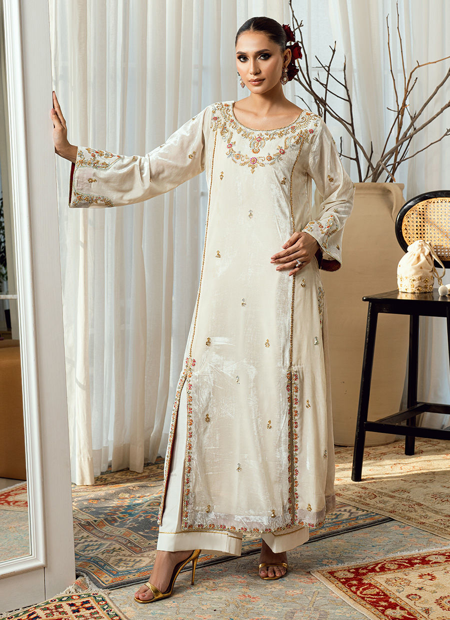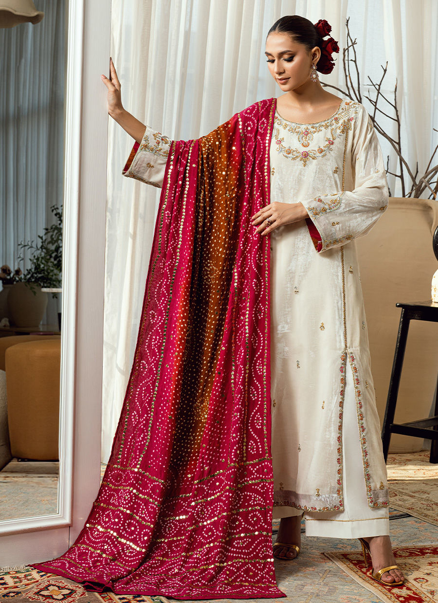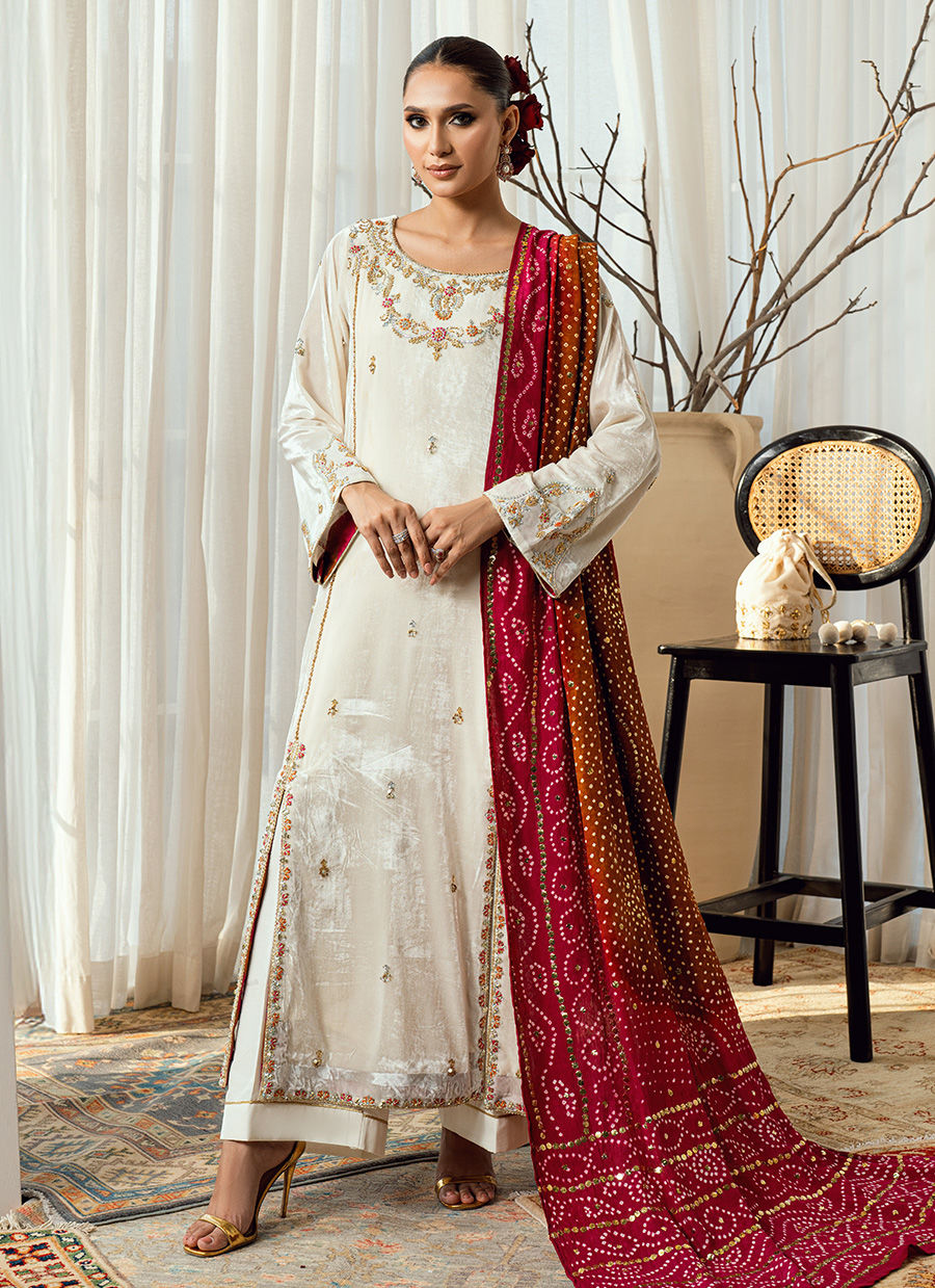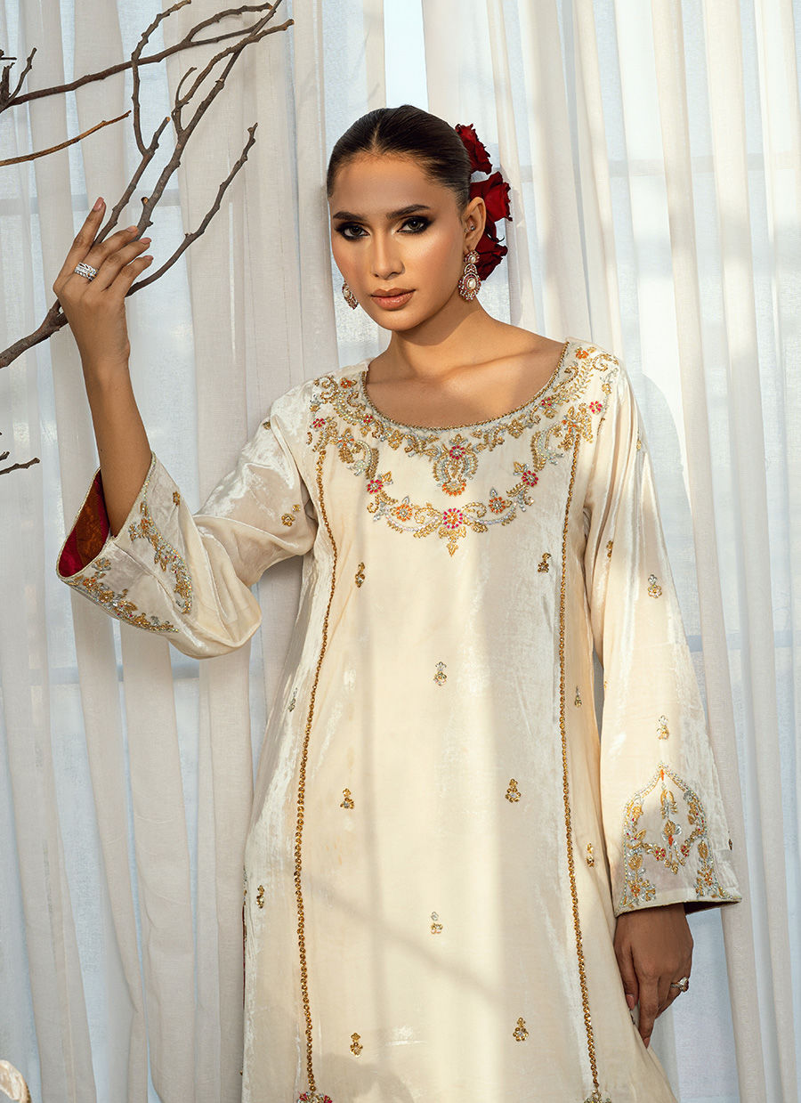 An embodiment of purity illuminated by luxury, Golden Grace radiates a celestial charm that feels ethereal yet empowering. The white velvet base glows softly under intricate gold hand-embellished detailing that graces every inch of the silhouette—from neckline to hem—exuding regality through restraint. Hints of colored embroidery around the neckline breathe dimension and subtle vibrance, creating a gentle dialogue between sophistication and liveliness. The look is elevated with a magenta chundri dupatta, adding a refreshing burst of color that enhances the outfit’s brilliance without overpowering its serenity. Designed for the woman who commands attention with quiet elegance, Golden Grace is a statement of light—serene, majestic, and timeless in its allure.