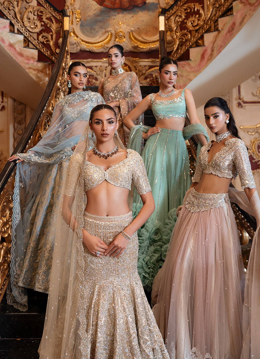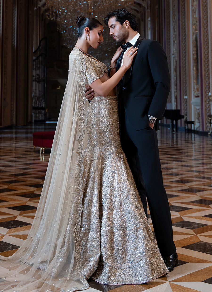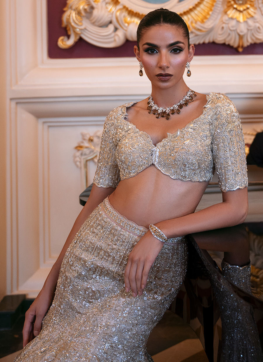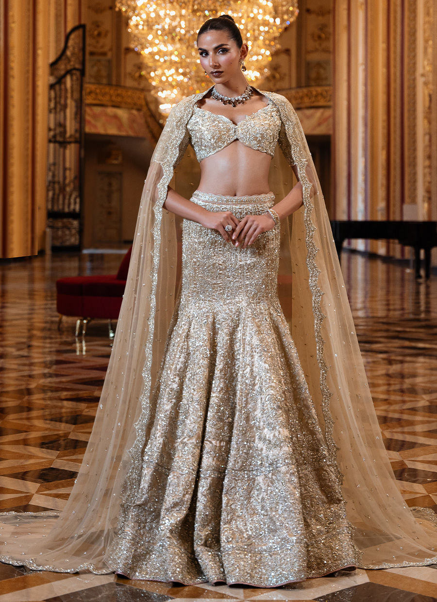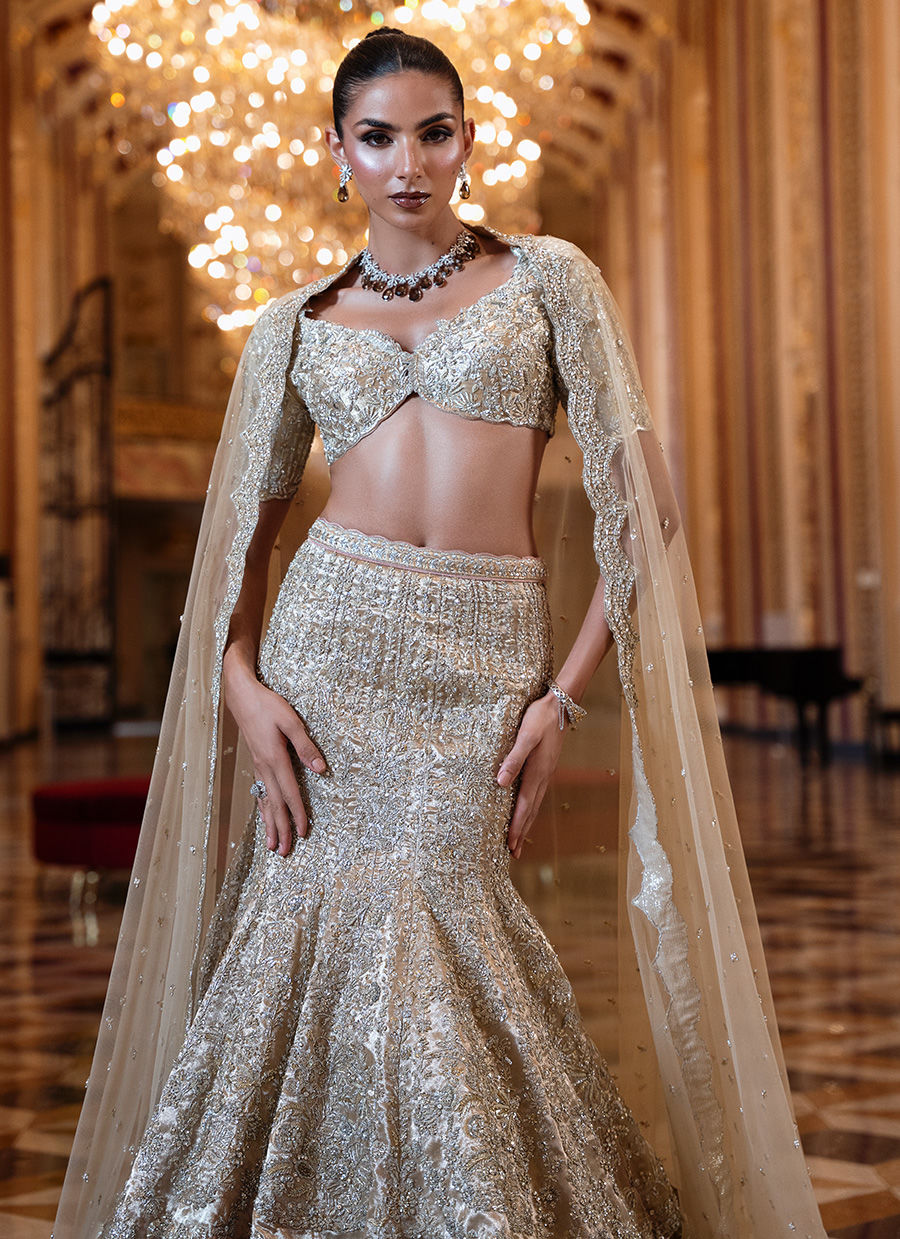 An opulent gold mermaid lehenga choli, crafted from pure tissue fabric and adorned with breathtaking hand embellishments, designed to create a timeless bridal statement. The lehenga is beautifully detailed with intricate embroidery and Swarovski crystals, shimmering with every movement. The choli features a graceful sweetheart neckline and classic Indian sleeves, meticulously hand-embellished to perfection. Paired with a delicate net dupatta, finished with scalloped borders intricately worked in dabka and crystals, and sprinkled with sitara chan all over, the ensemble radiates elegance and grandeur, perfect for the modern bride.