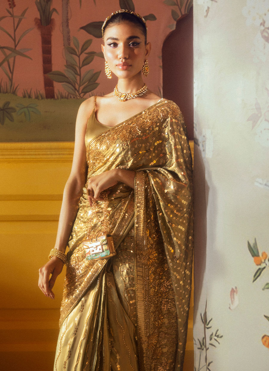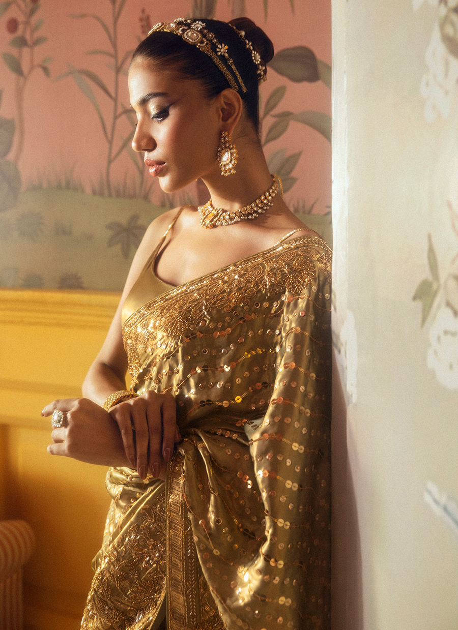 Molten gold meets timeless glamour in this stunning lamé sari, adorned with heavy gold multi-technique embroidery, paired with a strappy blouse for regal radiance.
