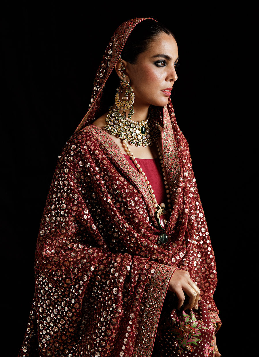 An absolutely regal maroon raw silk shirt with dainty details golden nakshi, golden sequins and pink and green buggle beads on the hems, it is paired with an exquisitely block printed sharara with similar embellishment details on the hem of it, it further comes with a heavily embellished multihead dupatta with intricate borders on all four sides. Add a signature Hussain Rehar potli with the outfit to complete your look.