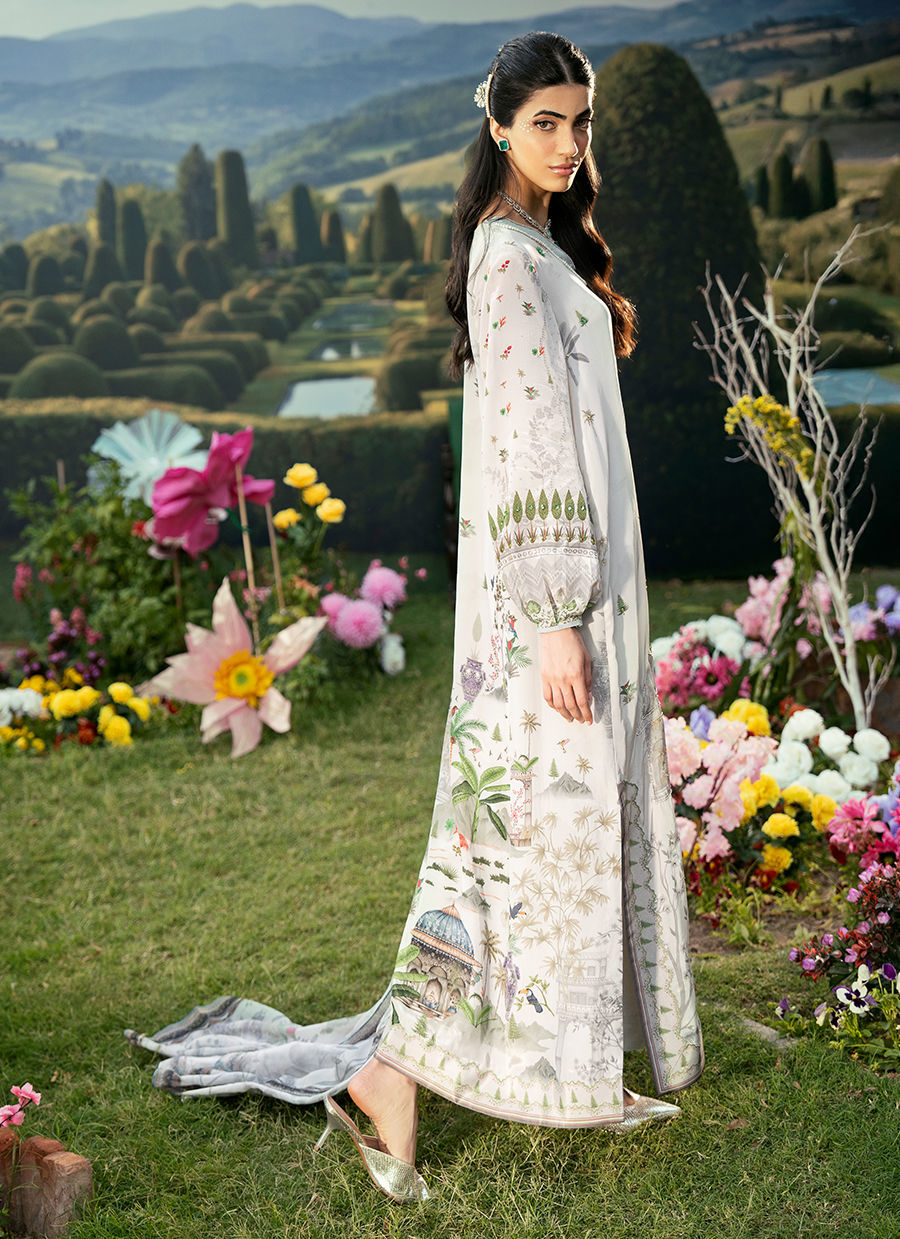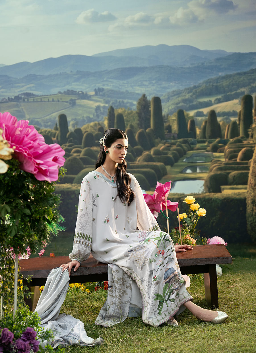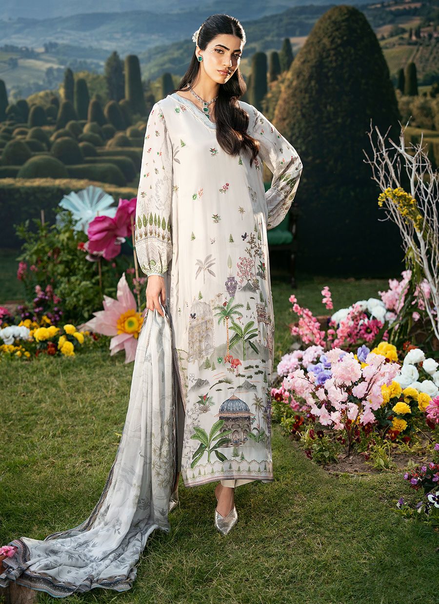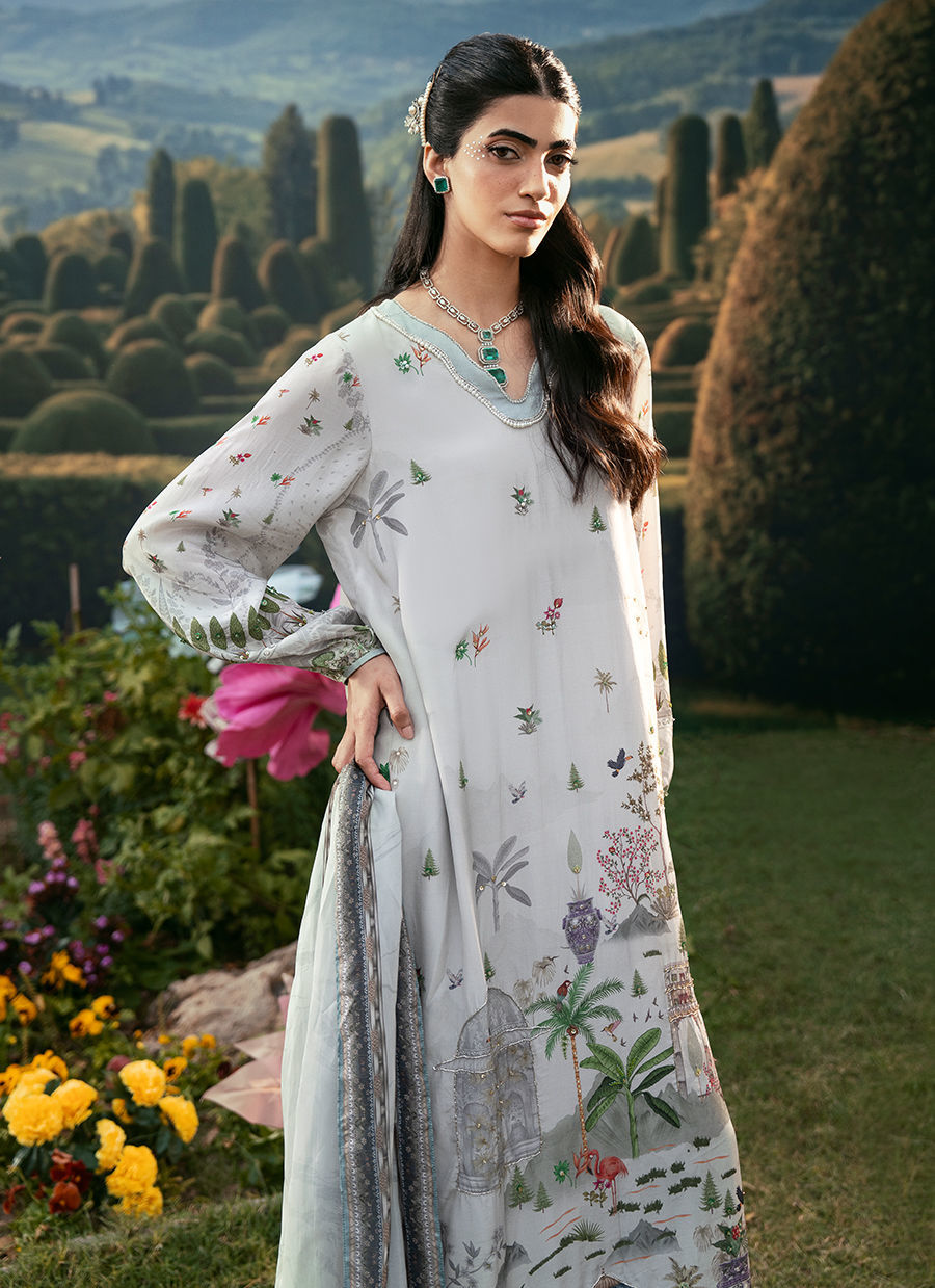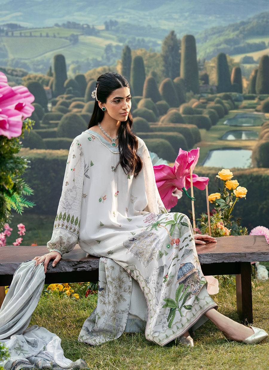 A Straight Shirt that features a refined V-neckline and softly puffy sleeves that add a modern, feminine touch to the silhouette. It is paired with sleek straight pants for a clean and graceful fall, creating a balanced and timeless look. The outfit is completed with a beautifully printed dupatta that enhances the overall charm with its artistic detailing and fluid drape.
