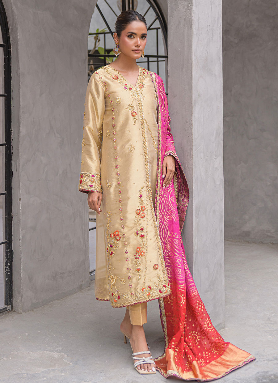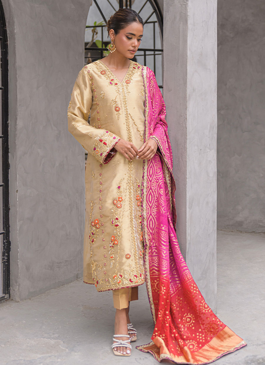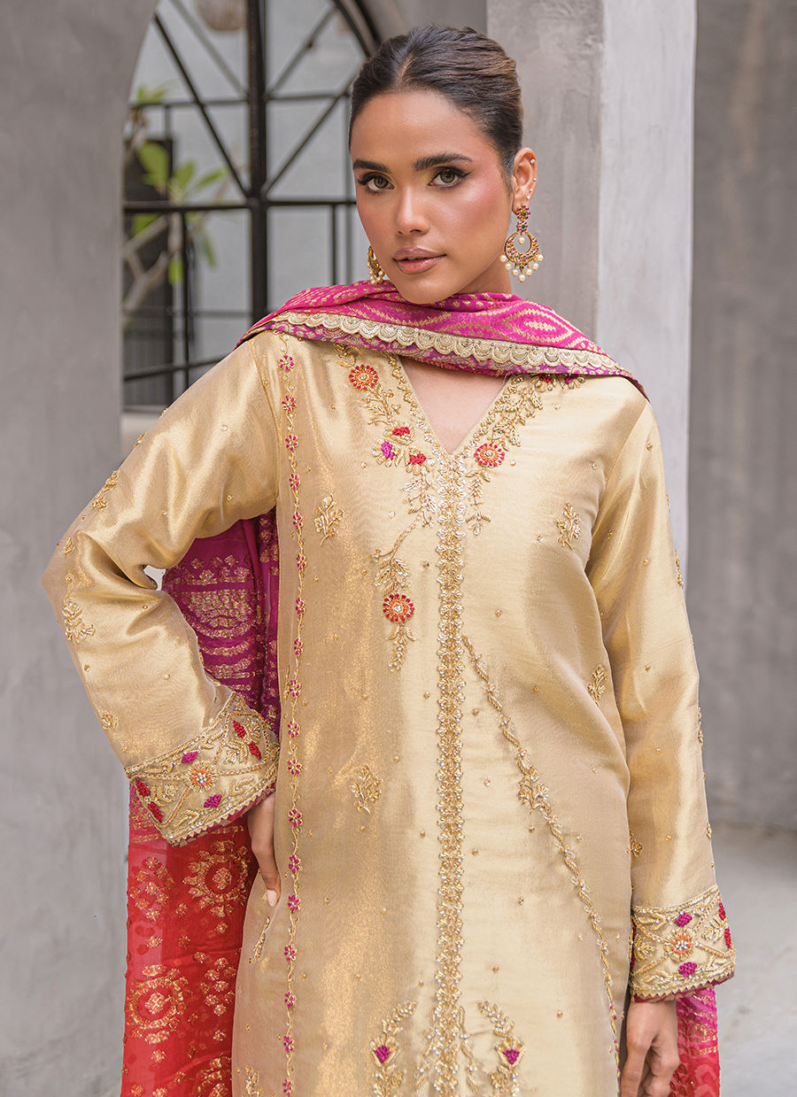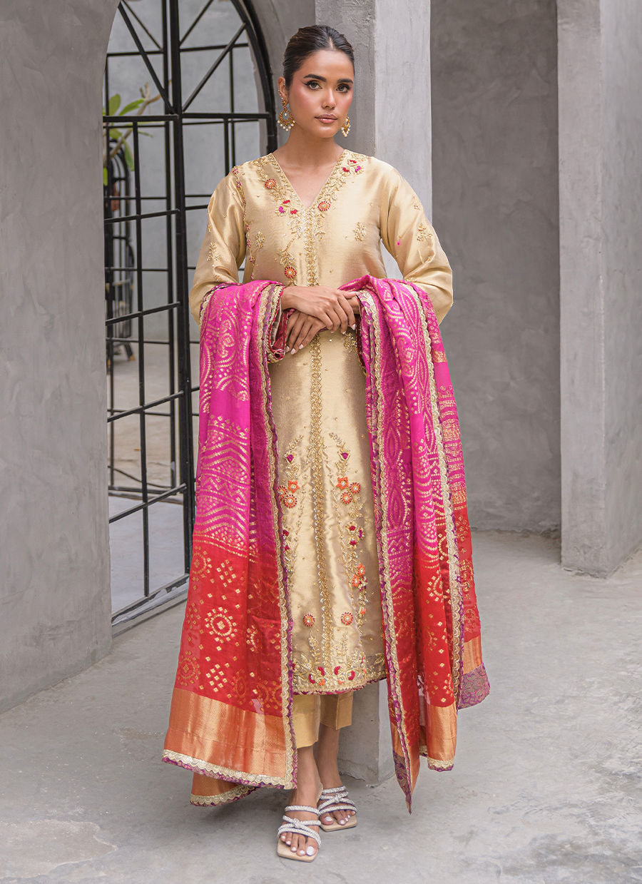 A regal gold kameez infused with traditional charm, enhanced by resham embroidery and subtle floral motifs. Paired with a vibrant magenta and burnt orange dupatta featuring traditional bandhani-inspired patterns, the contrast brings warmth and grandeur. This ensemble is timeless, versatile, and celebratory—suited for festive gatherings, traditional functions, and elegant wedding festivities.