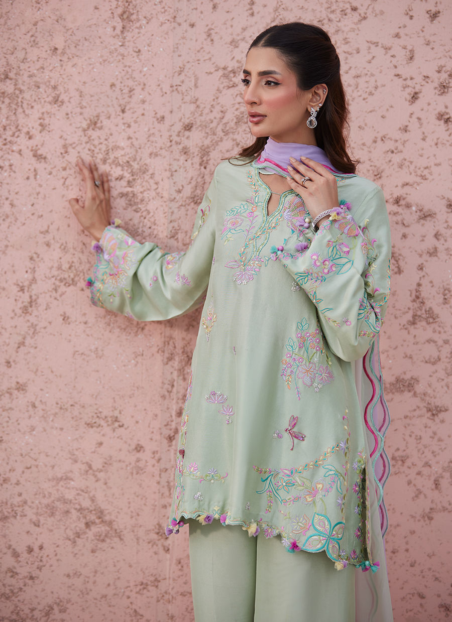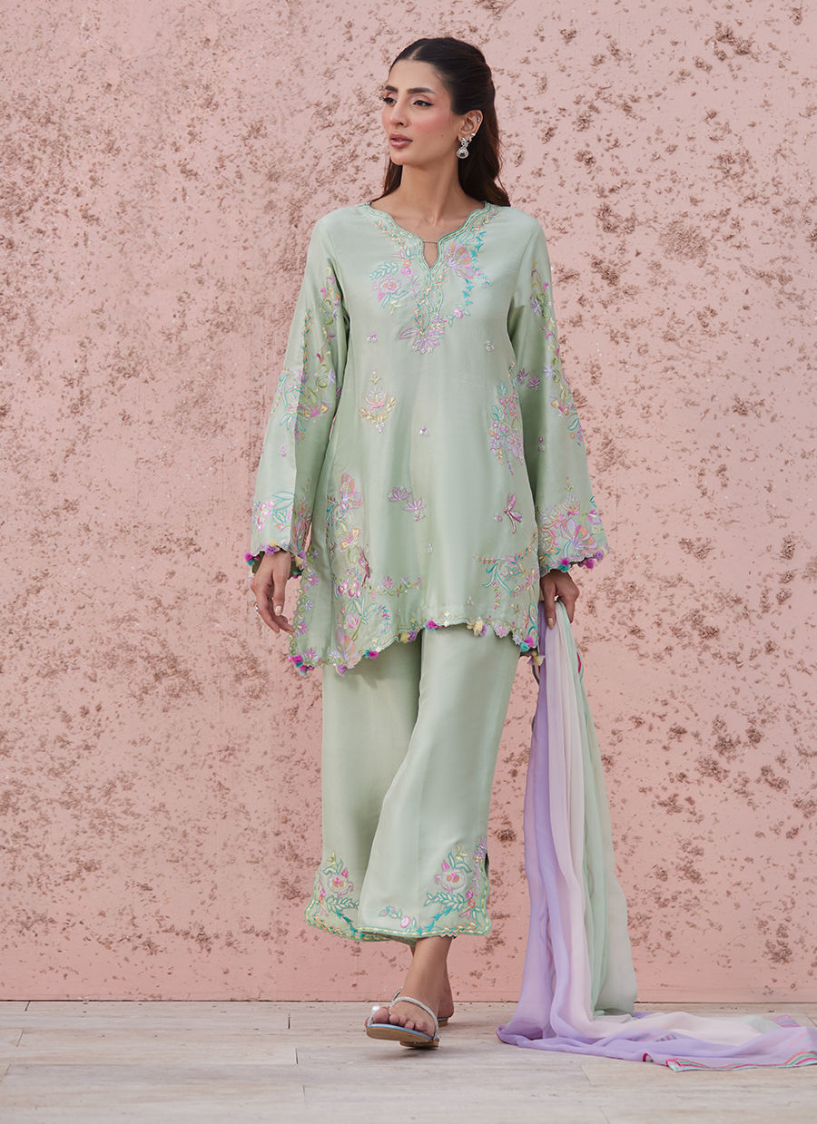 Paired with a raw silk izaar finished with composed embroidery, the outfit gains structure and balance, while the pure chiffon dupatta adds a soft, fluid layer that completes the ensemble with effortless grace.