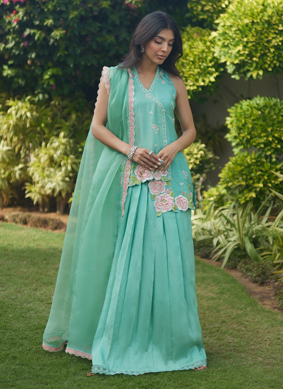 Paired with fluid, wide-leg pants, the silhouette feels relaxed yet elevated, creating graceful movement with every step. The sheer dupatta, finished with delicate borders, adds an airy layer that enhances the softness of the overall look.