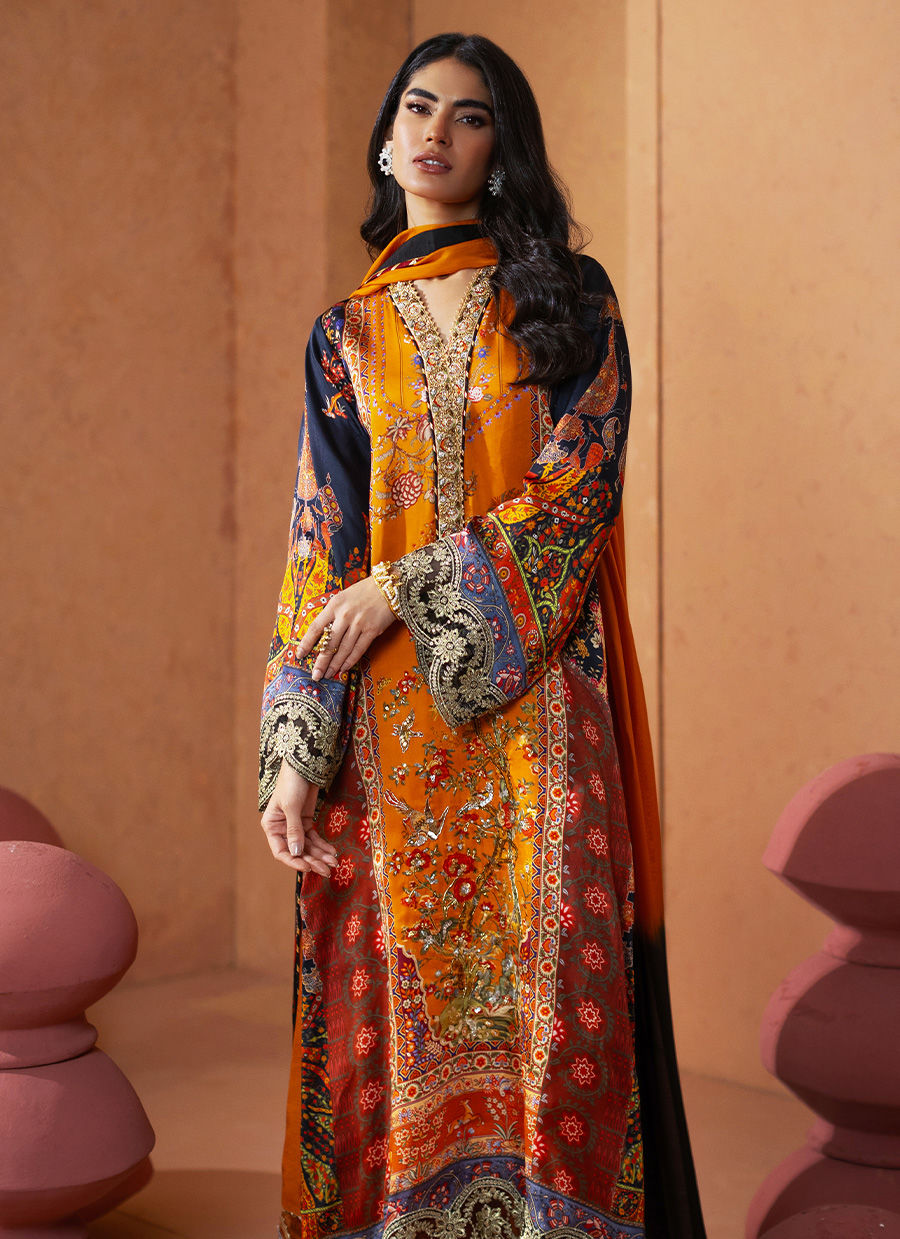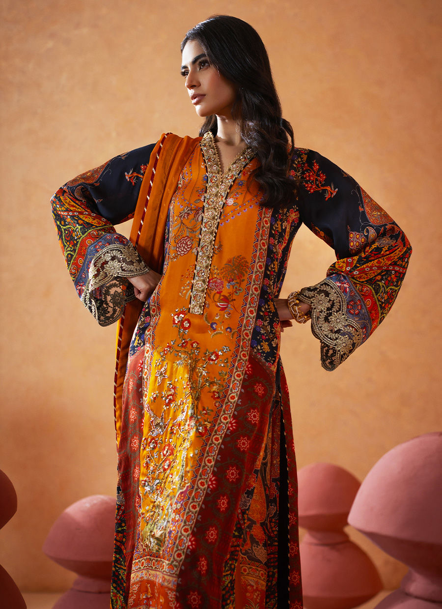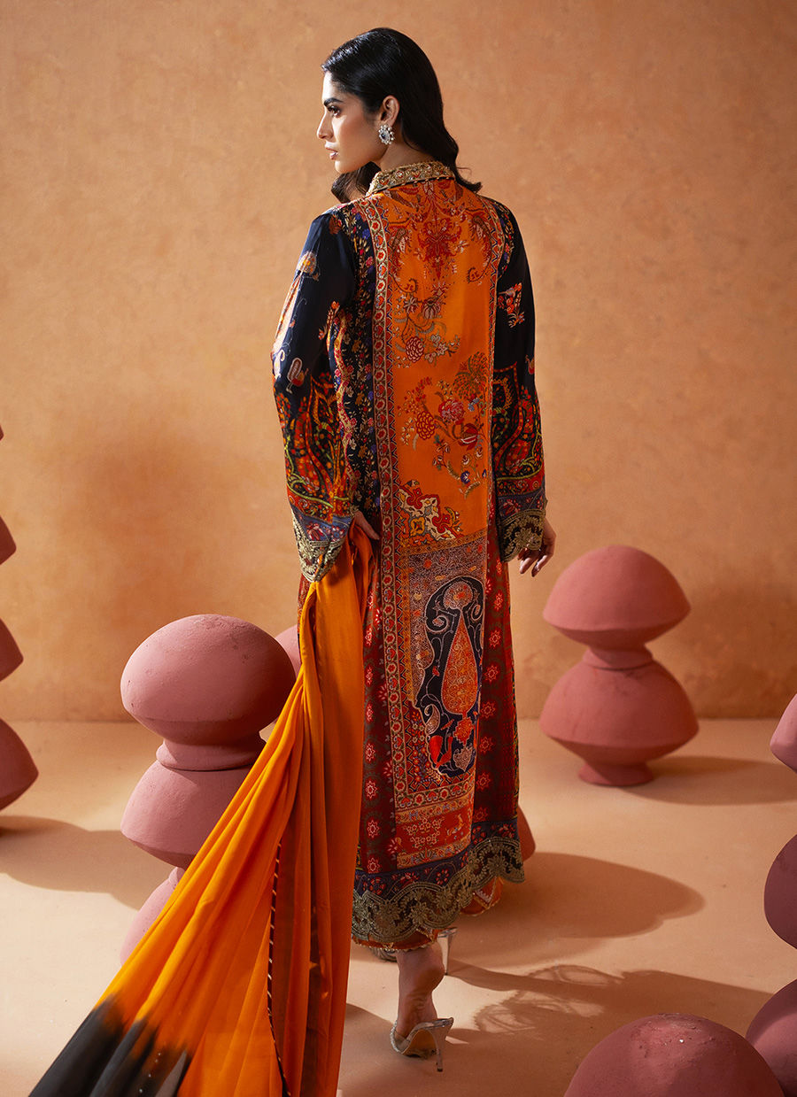 Long silhouette A-Line shirt in deep rust, black, and maroon, inspired by intricate Kashmiri embroidery details. The center front is adorned with aari and zardozi embellishments in silver, gold, and antique finishes. The neckline is richly embellished with traditional dabka and kora techniques. The hem features an accentuated zari border. This outfit is complemented by an ombre dupatta and can be paired with matching raw silk pants, ensuring a striking presence this festive season.