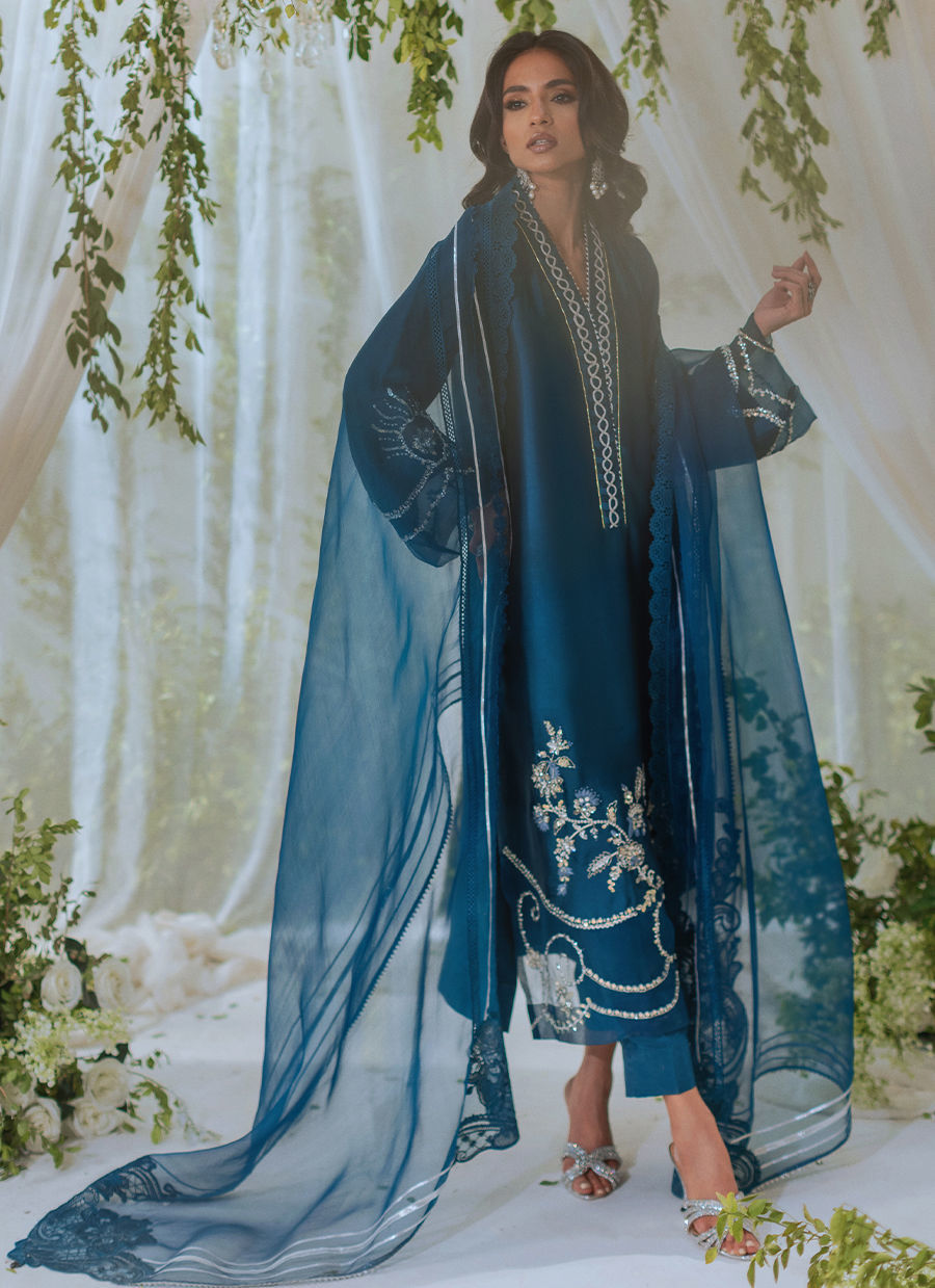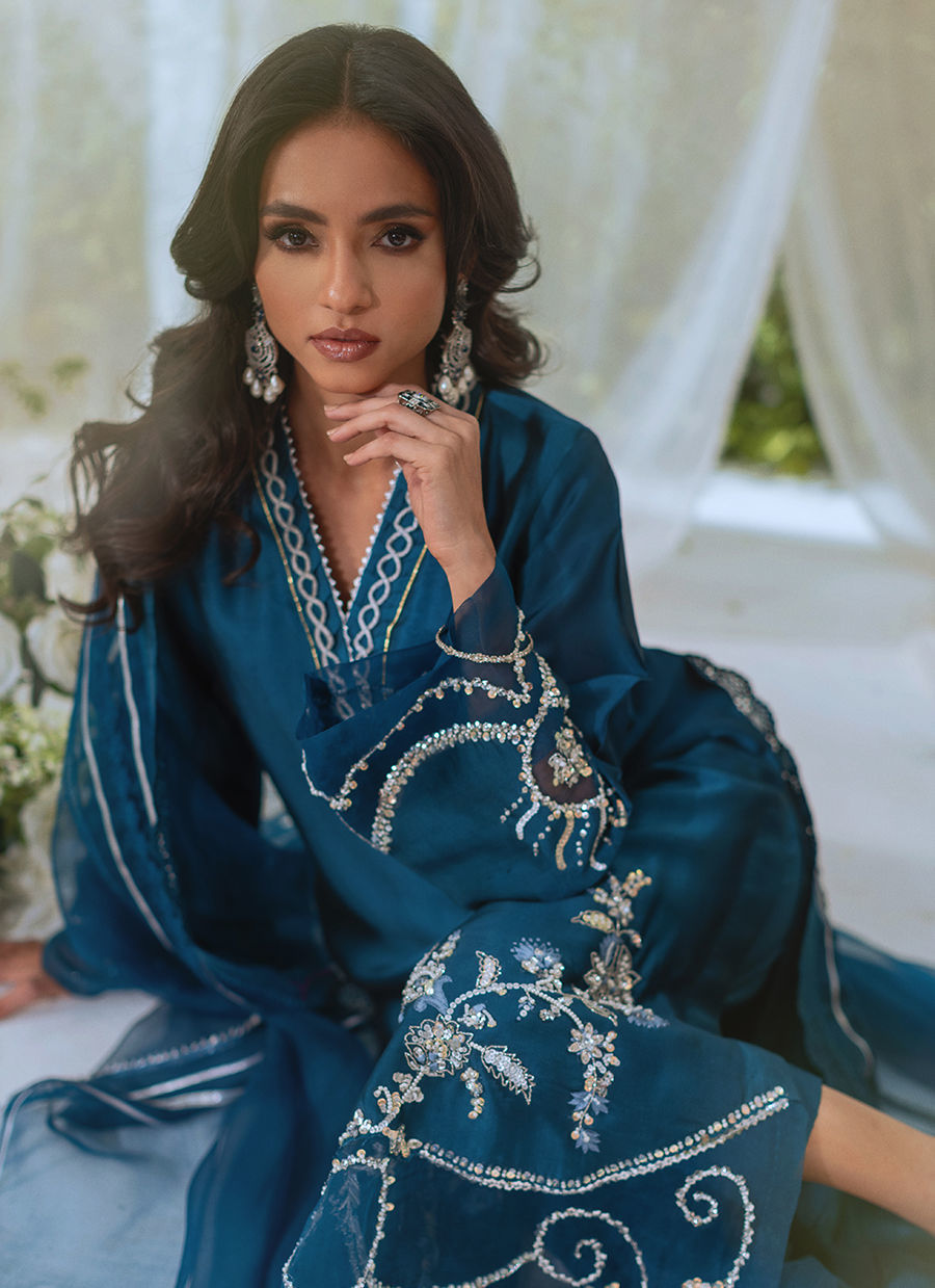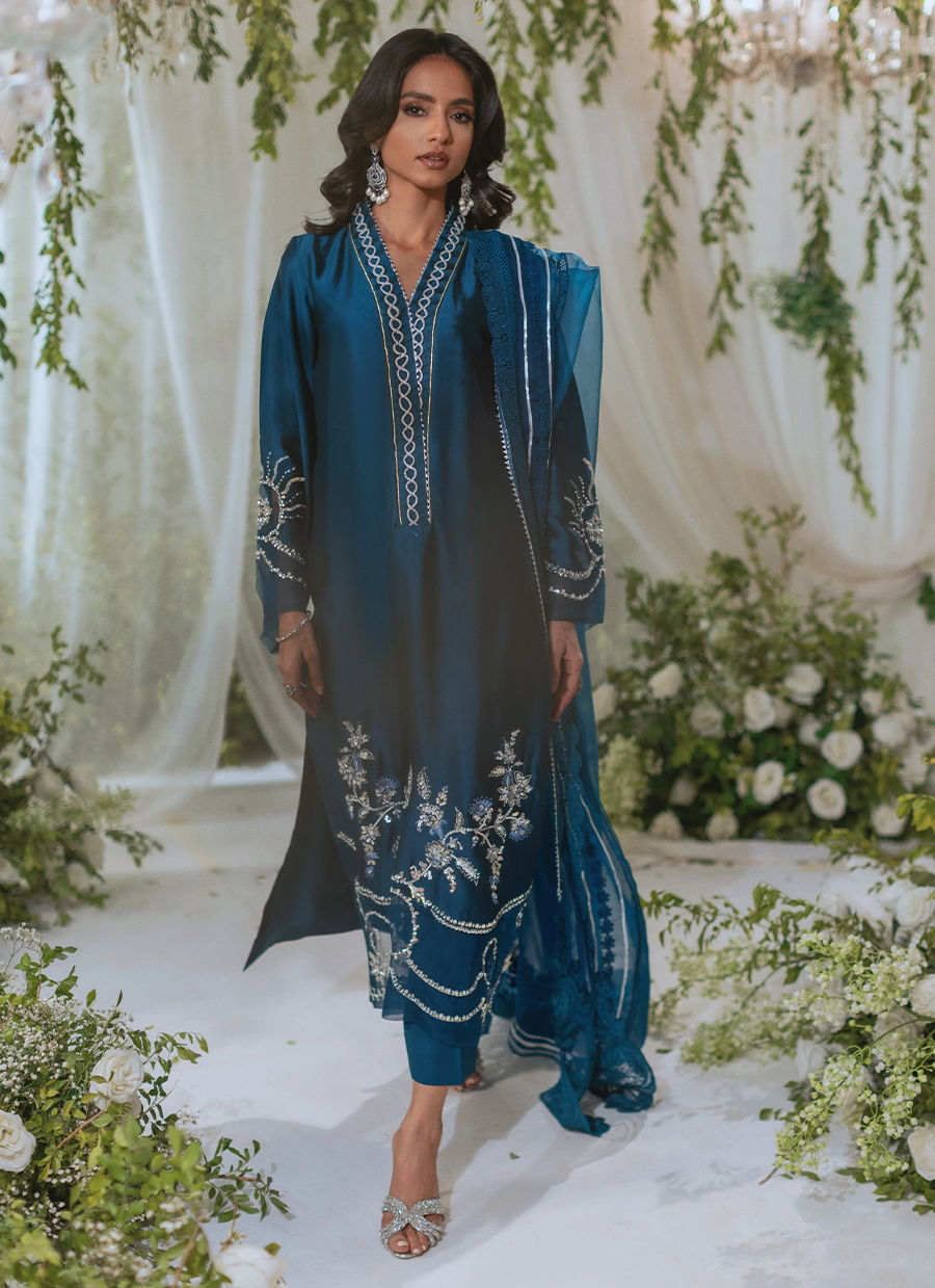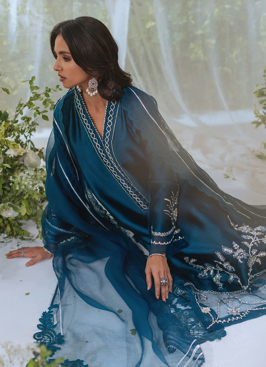Long silhouette shirt on silk canvas in stunning laips blue featuring all silver zardozi and resham details on hemline and sleeves. The shirt comes with matching straight pants and an organza dupatta featuring delicate appliqué motifs on each pallu further adorned with gota accents.