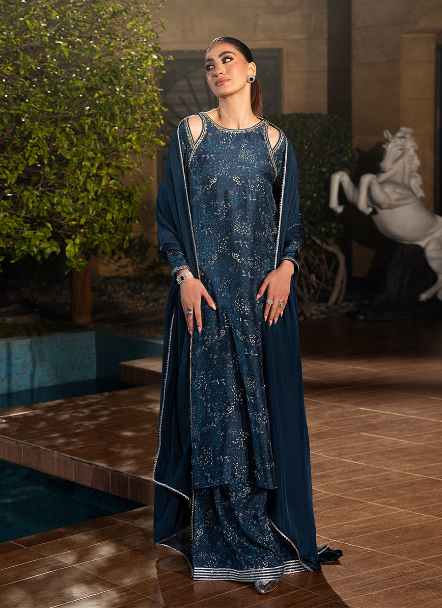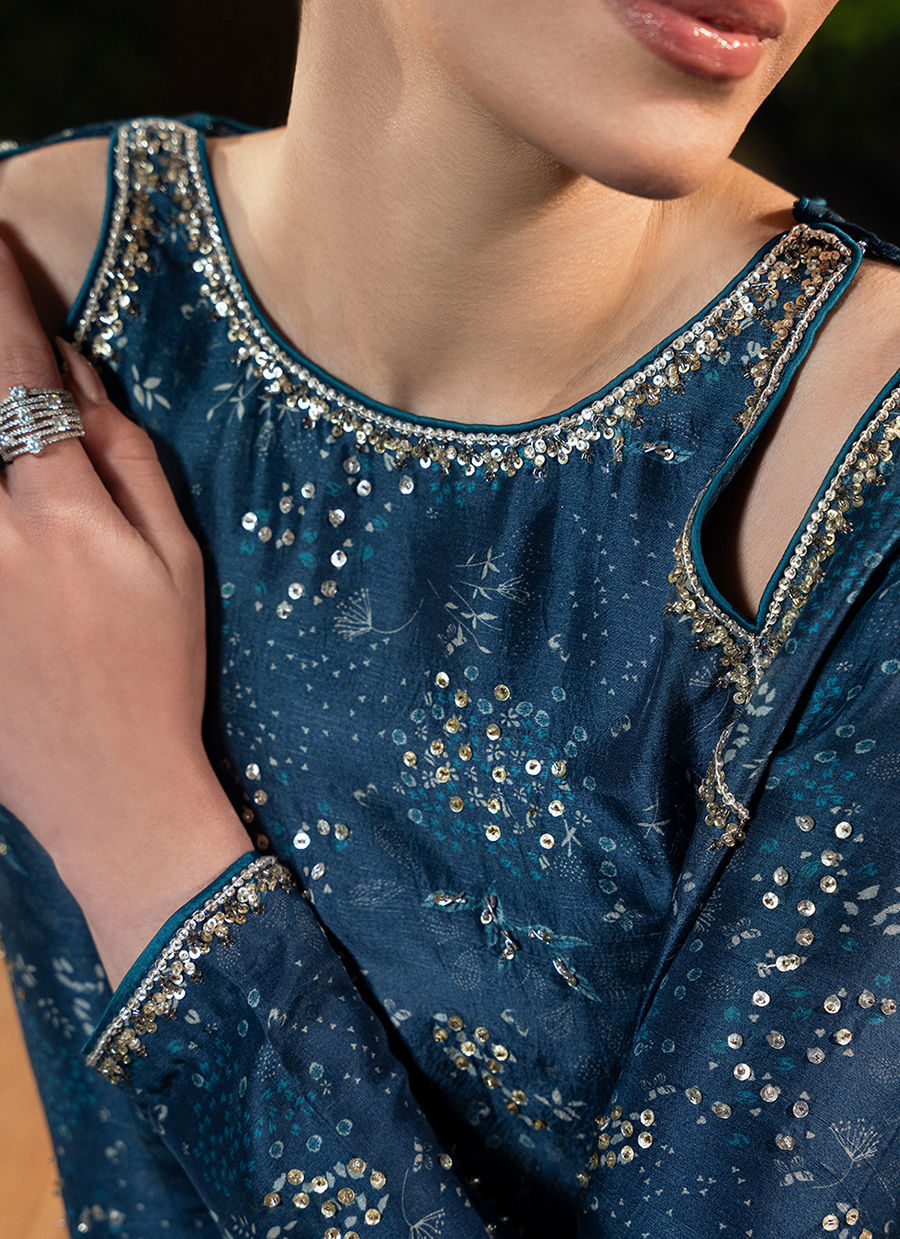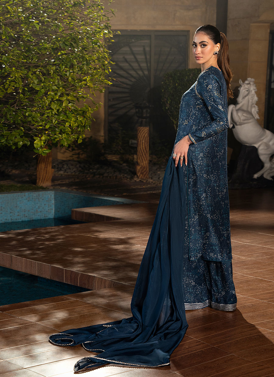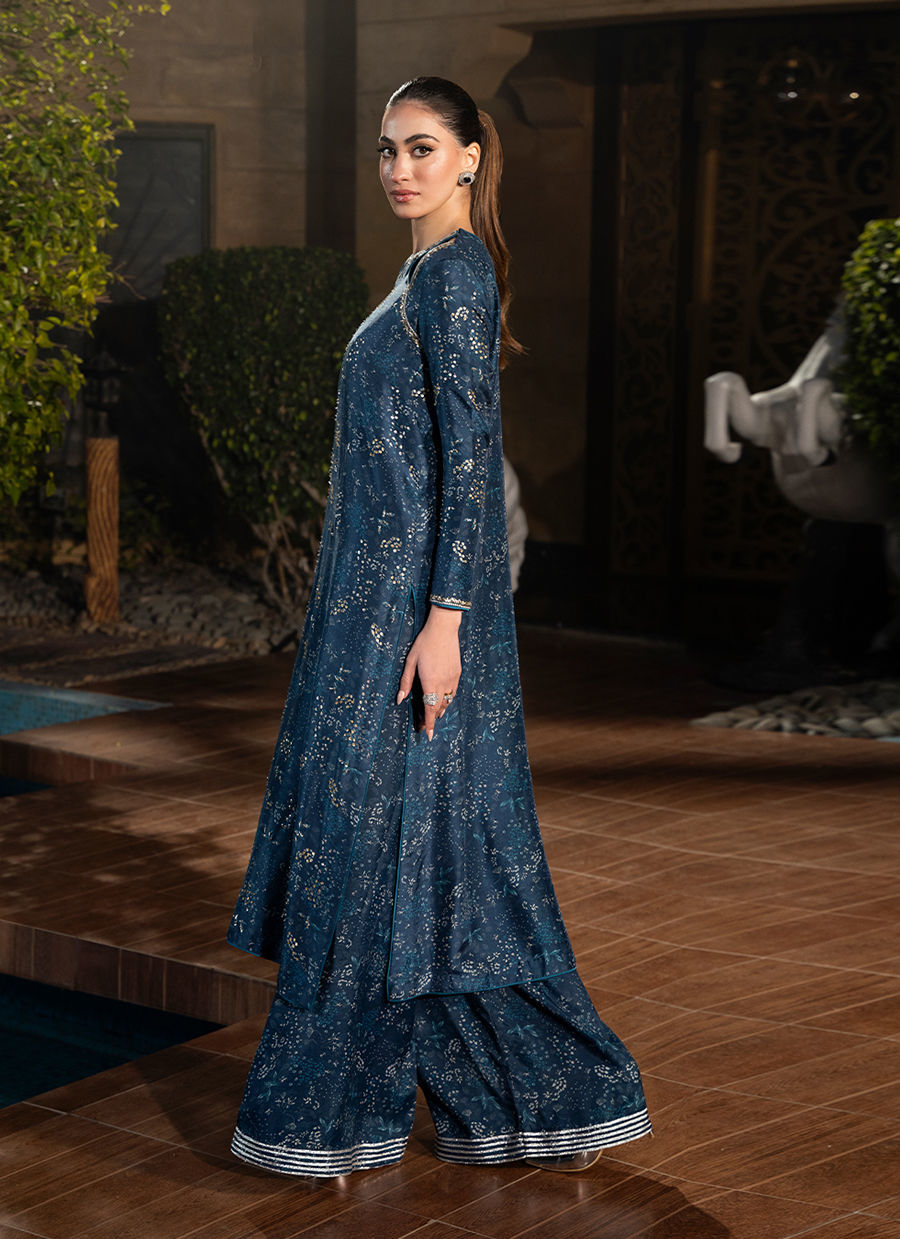 Digitally printed shirt made from Pure raw silk, giving the ensemble a refined look. The shirt features intricate prints with neckline hand embellishments that enhance its festive appeal. Paired with it is a matching digitally printed pant with gota borders, also in premium pk raw silk fabric, offering comfort while maintaining a regal silhouette. Completing the look is a delicate Kp silk dupatta, light and airy, adorned.