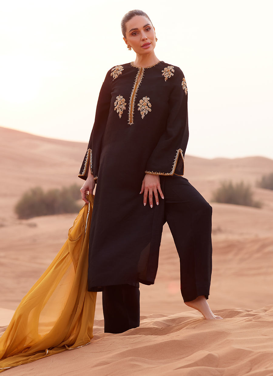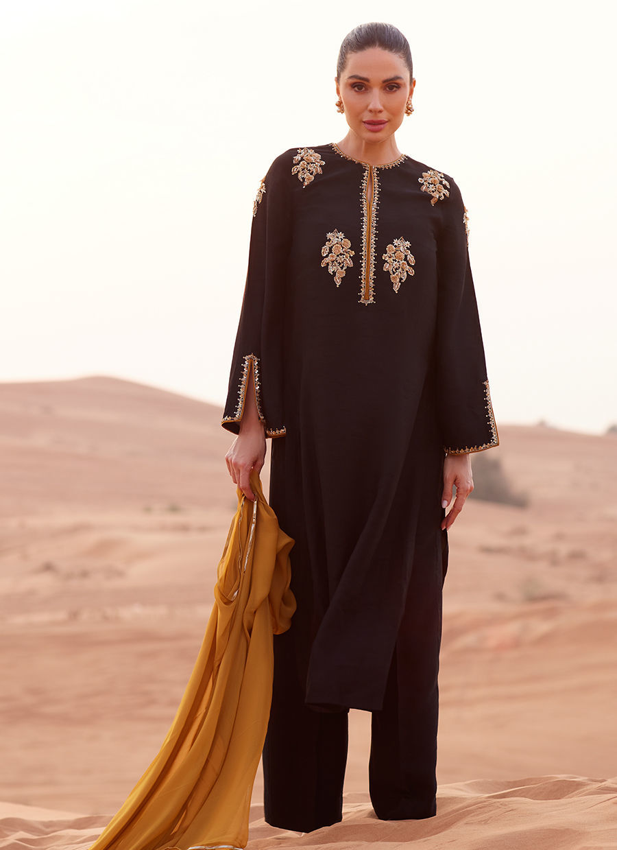 A straight, loose-fit shirt in Korean raw silk, detailed with embellished motifs on the neckline and sleeves. Styled with straight-cut Korean silk trousers for a sleek silhouette. Completed with a lightweight chiffon dupatta featuring a refined gota finish for subtle texture and elegance.