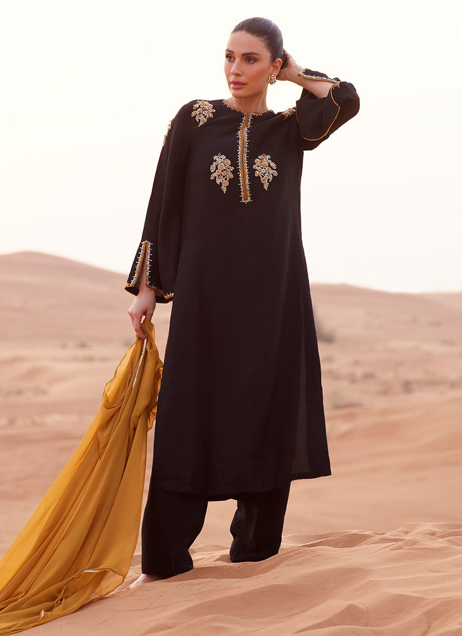 Color: Black Fabric: Shirt: Korean Silk, Pants: Korean Silk, Dupatta: Chiffon