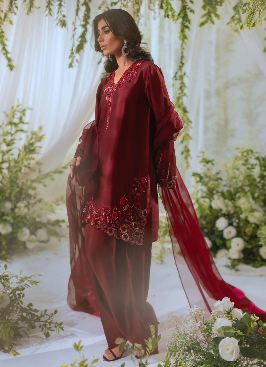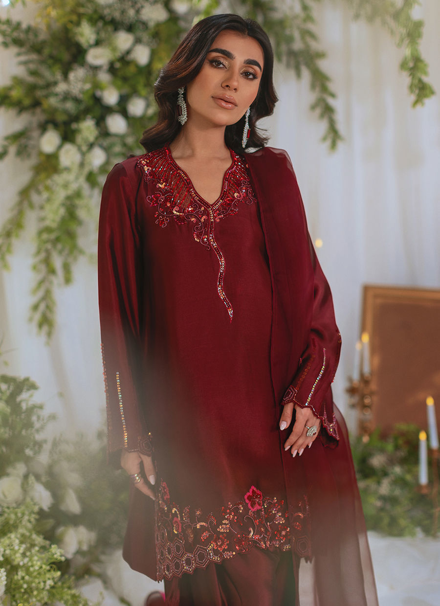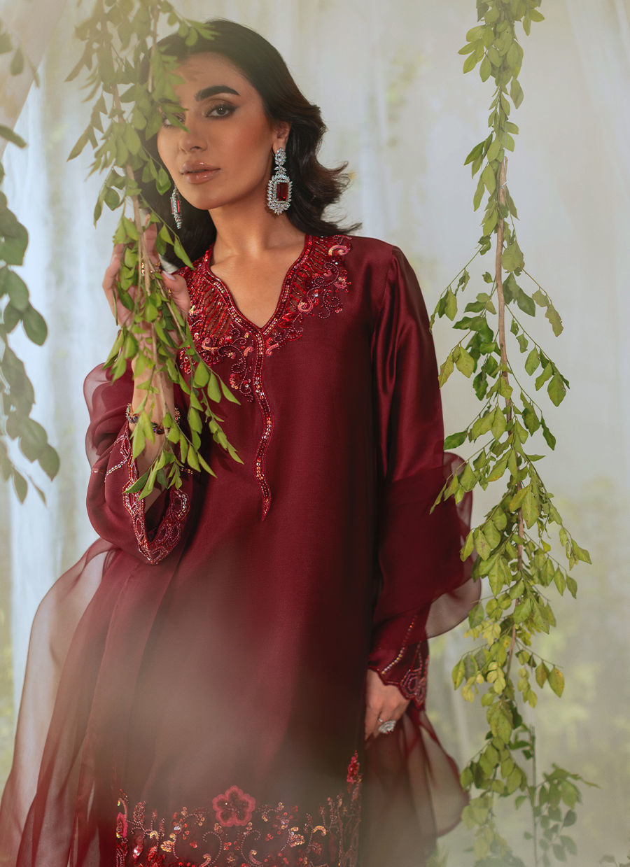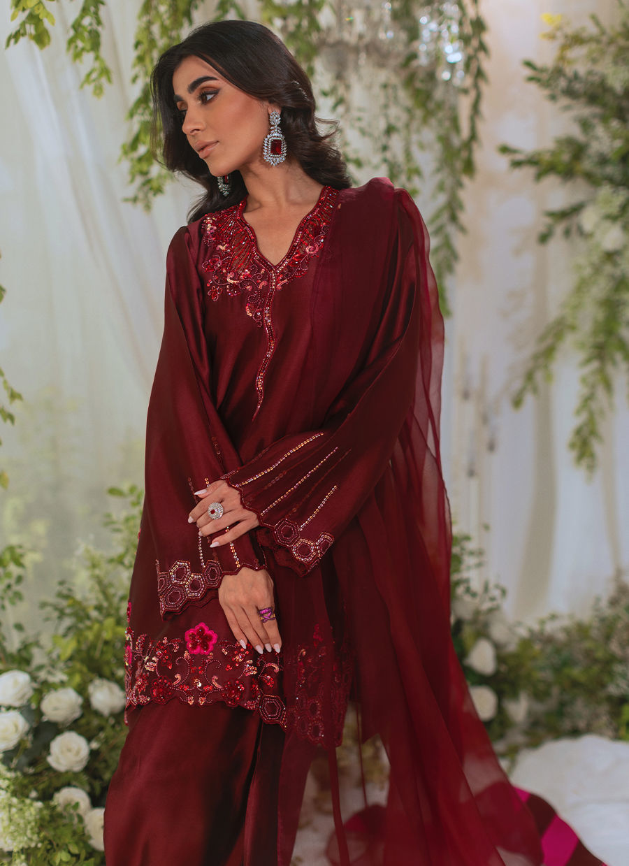 Knee length shirt in deepest shade of oxblood featuring tone on tone handcrafted embroidered details featuring light catching sequins and resham rosettes. The shirt is paired with farshi shalwar and an organza dupatta featuring chatta patti details on each pallu.