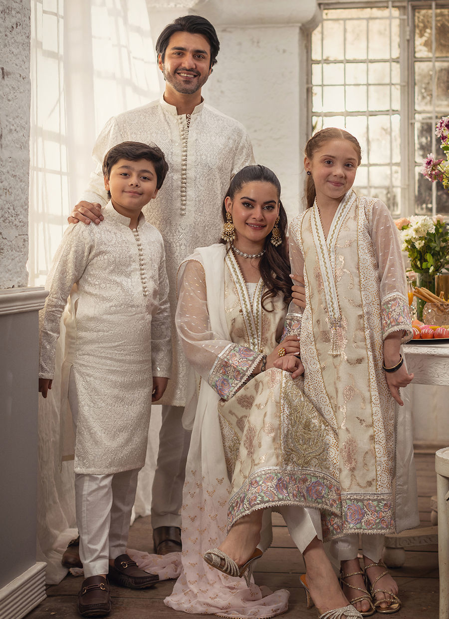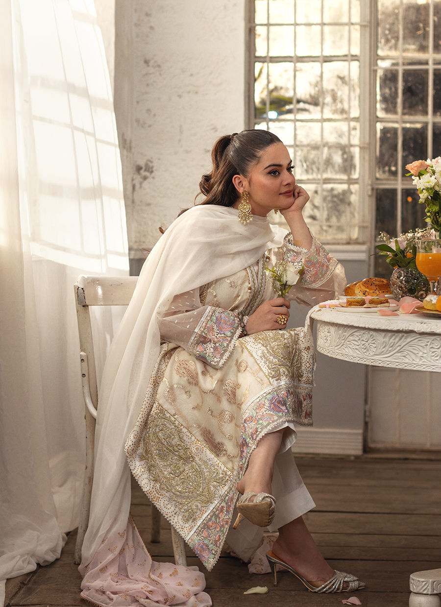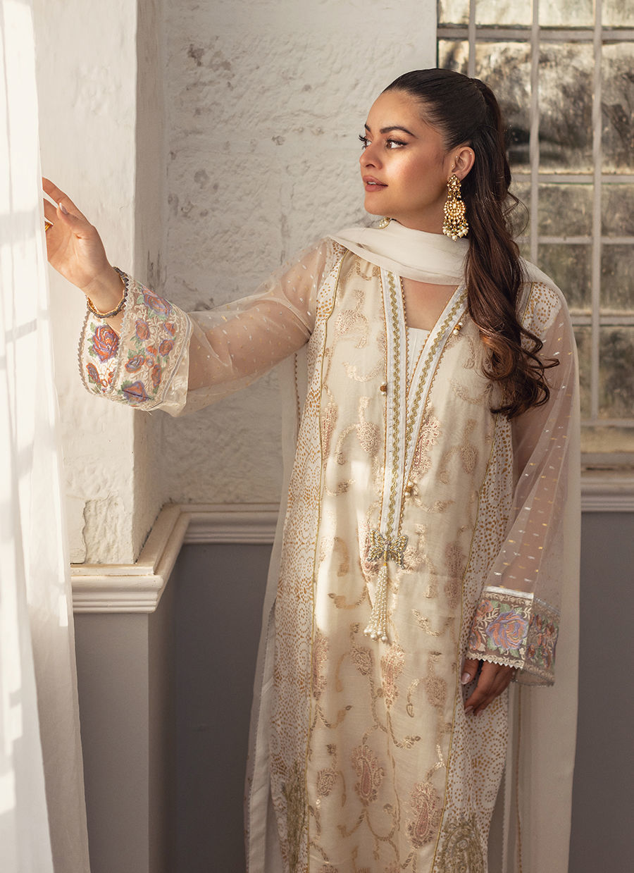 An elongated A-line shirt in pristine white, subtly highlighted with hints of gold, features a lustrous Lurex panel at the center front . The sleeves are crafted in shimmering Lurex, adding a contemporary contrast to the silhouette. Intricate hand block–printed detailing further enhances the side panels, while the neckline is enriched with delicate gota work, handcrafted zardozi And pearl embellishments. The hem and sleeves are finished with refined embroidered borders. The ensemble is completed with coordinated straight pants and an ombre chiffon dupatta, adorned with hand block–printed details and finished with a touch of shimmering gota.