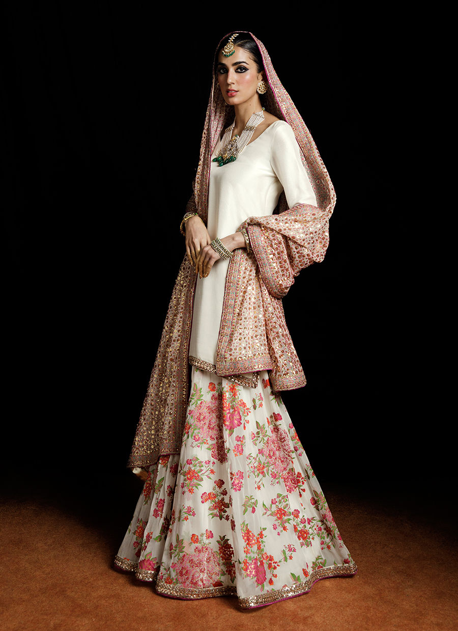 A soft ivory raw silk shirt with dainty details golden nakshi, golden sequins and pink and red buggle beads and golden dabka on the hems, it is paired with an exquisitely block printed chiffon sharara with similar embellishment details on the hem of it, it further comes with a heavily embellished multihead dupatta with intricate borders on all four sides. Add a signature Hussain Rehar potli with the outfit to complete your look.