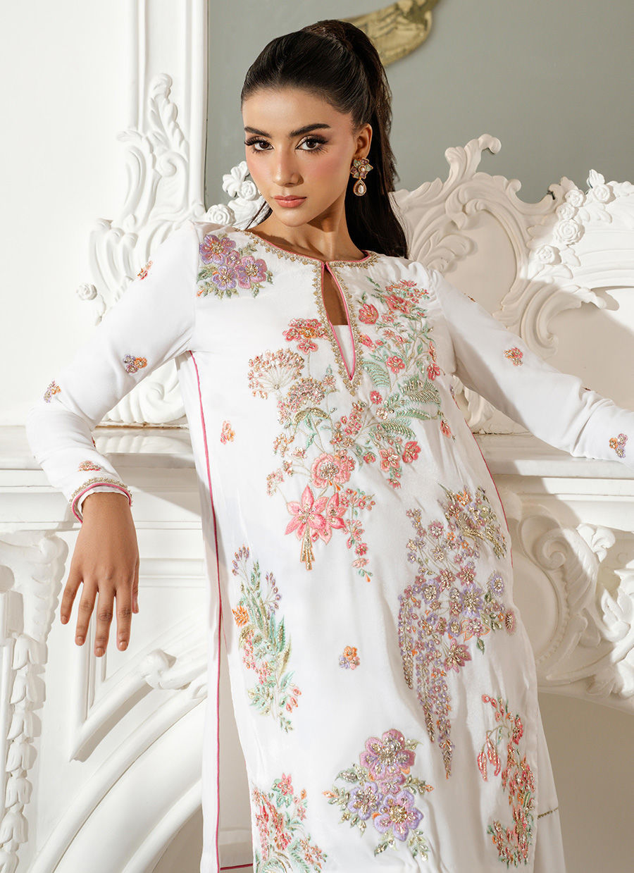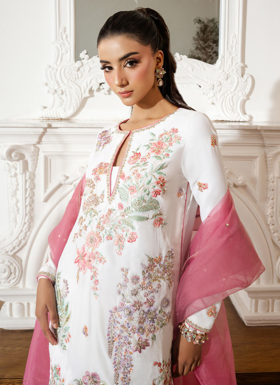 Ivory Charm is a breathtaking white short shirt adorned with stunning multicolored embroidery and intricate hand embellishments throughout. Paired with matching sharara pants and a classic salmon pink organza dupatta, this ensemble exudes timeless elegance, a perfect blend of sophistication and charm.
